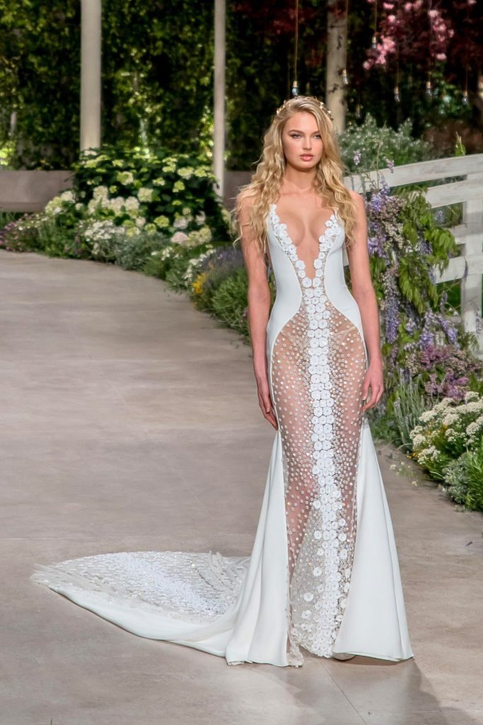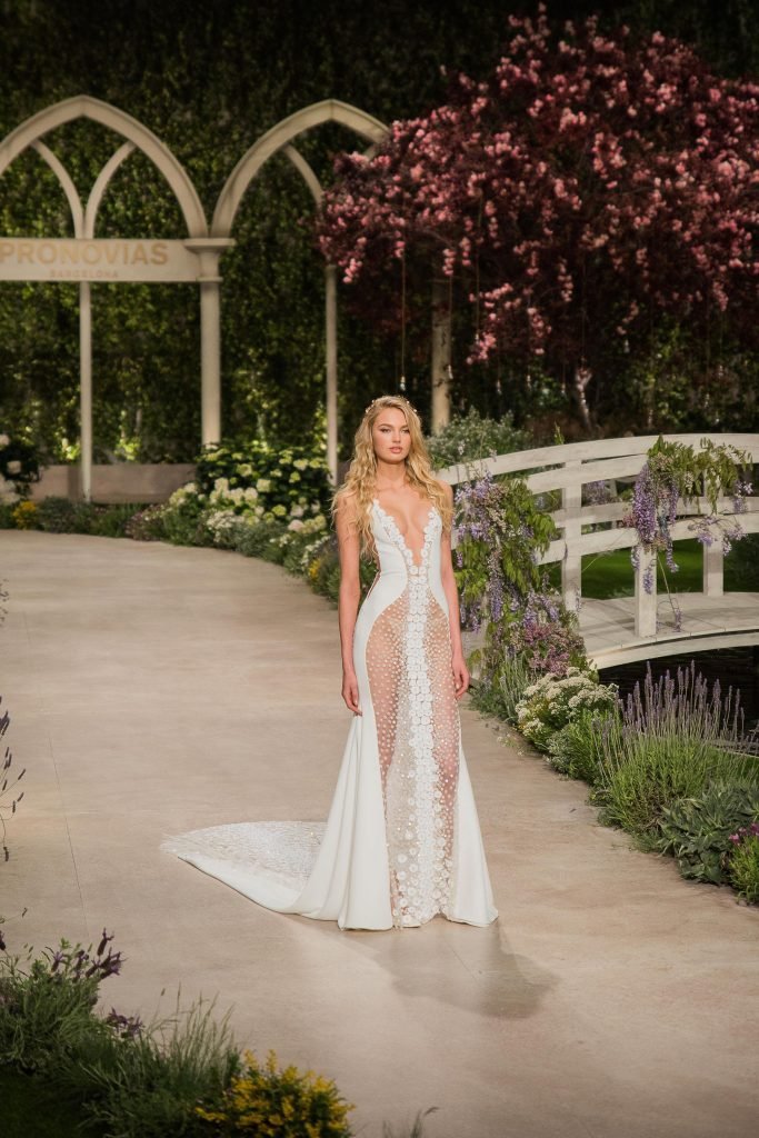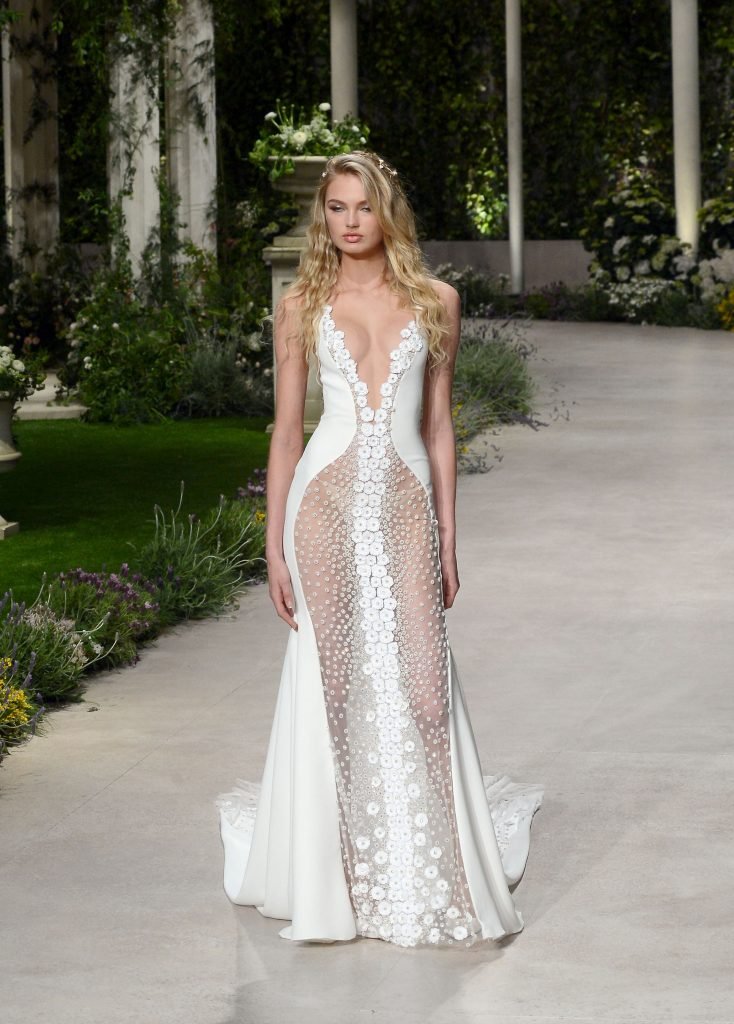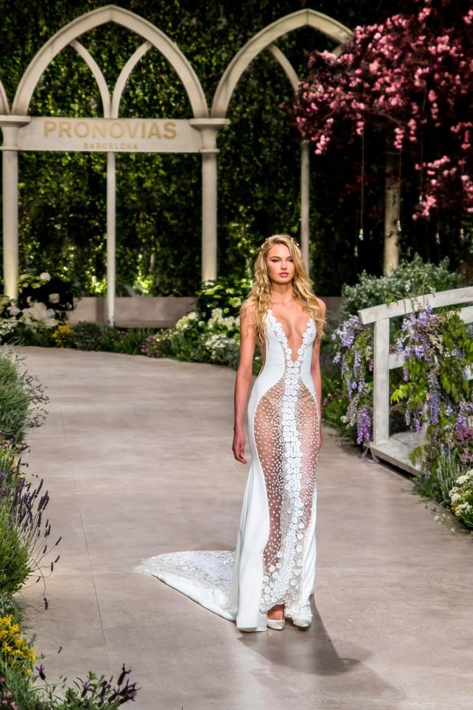 Romee Strijd défile en robe de mariée révélatrice lors du défilé de la collection Atelier Pronovias 2019 à Barcelone, Espagne, le 23/04/2018. Romee Van Strijd est un top modèle de mode et Ange de Victoria’s Secret originaire des Pays-Bas. Âge : 22 ans.