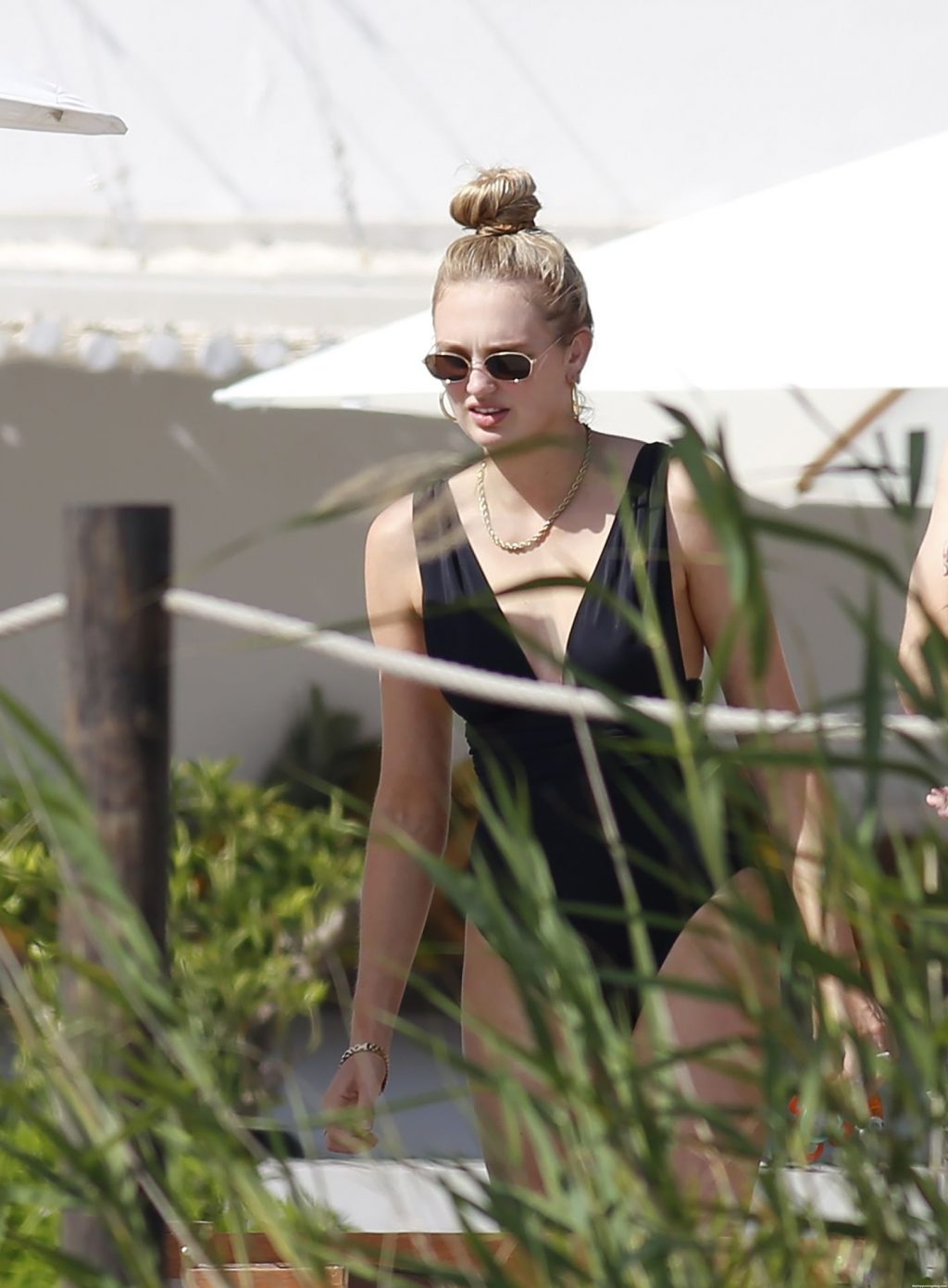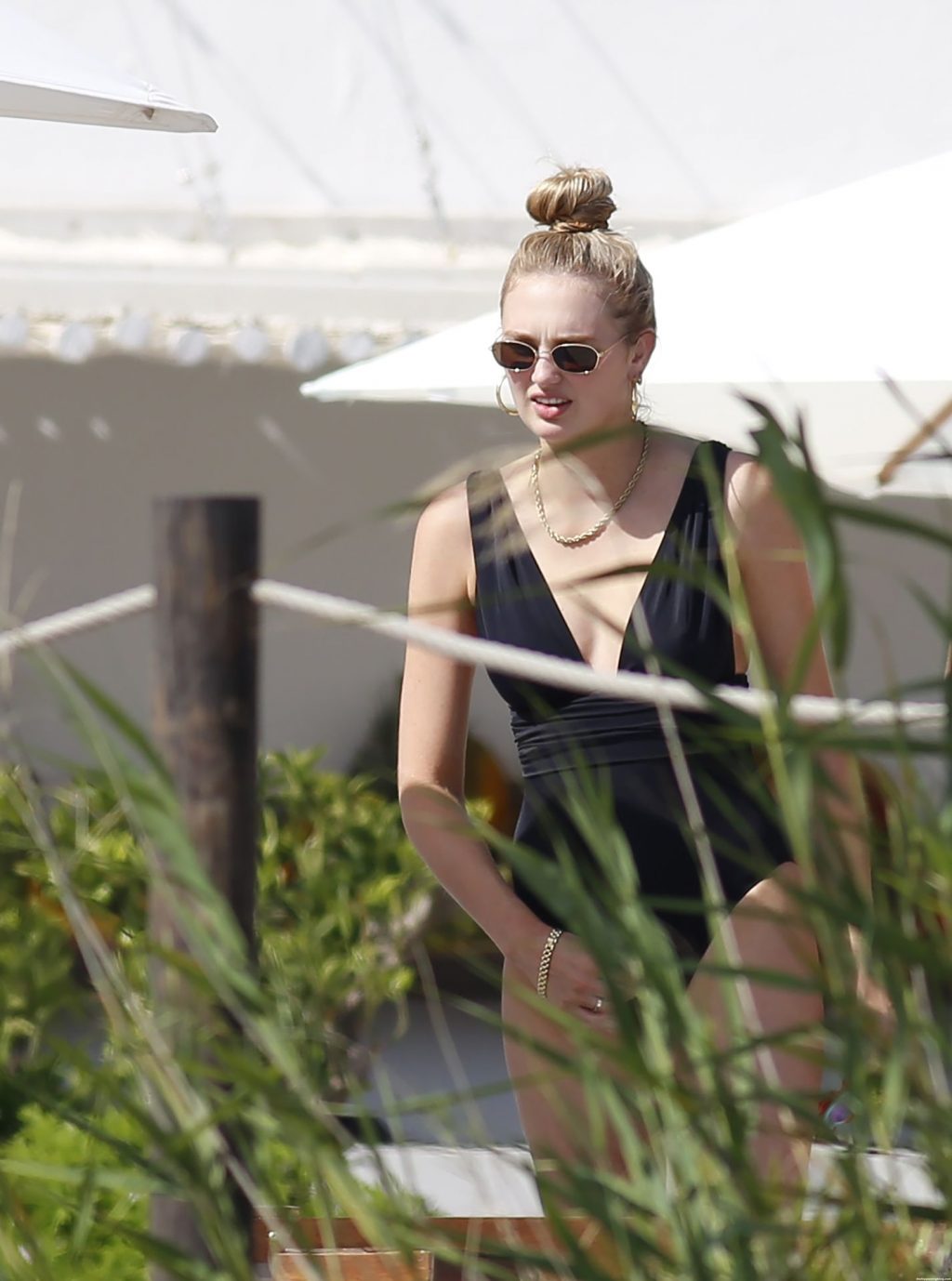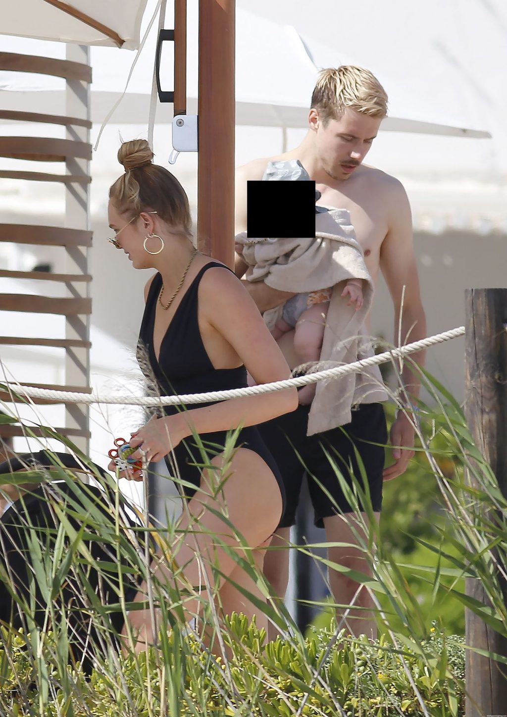 L’ange de Victoria’s Secret Romee Strijd montre son incroyable corps après bébé dans un maillot de bain noir une pièce lors de vacances en famille à Ibiza samedi en compagnie de son bébé et de son mari, Laurens Van Leuween.