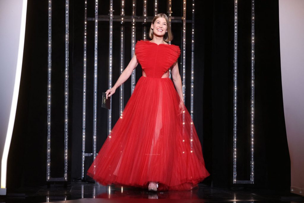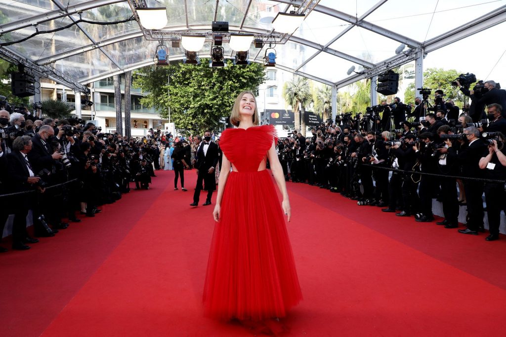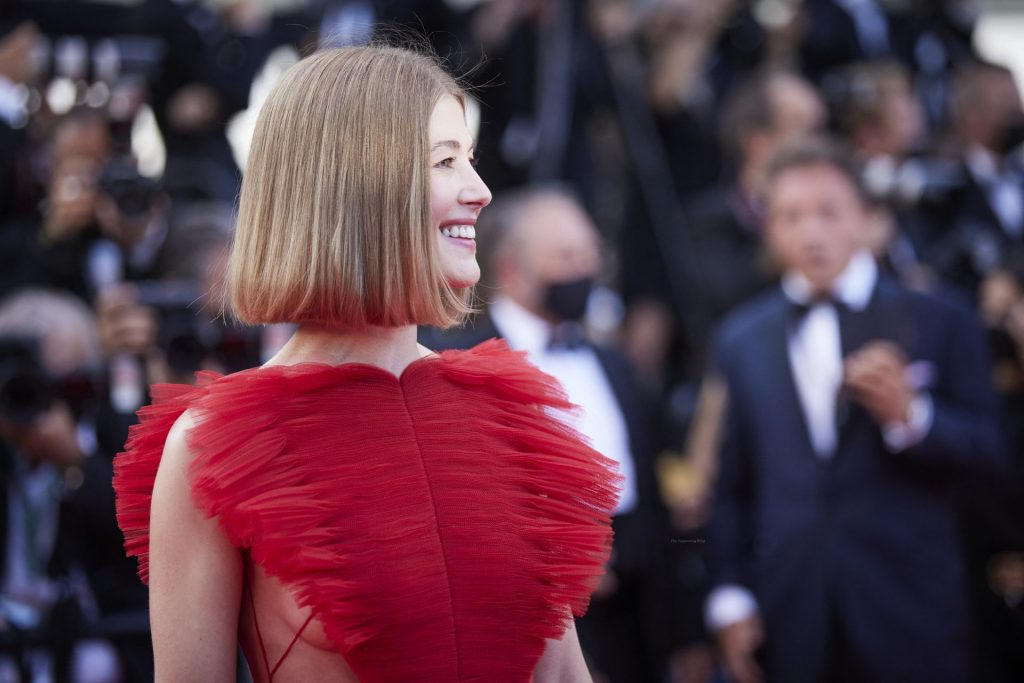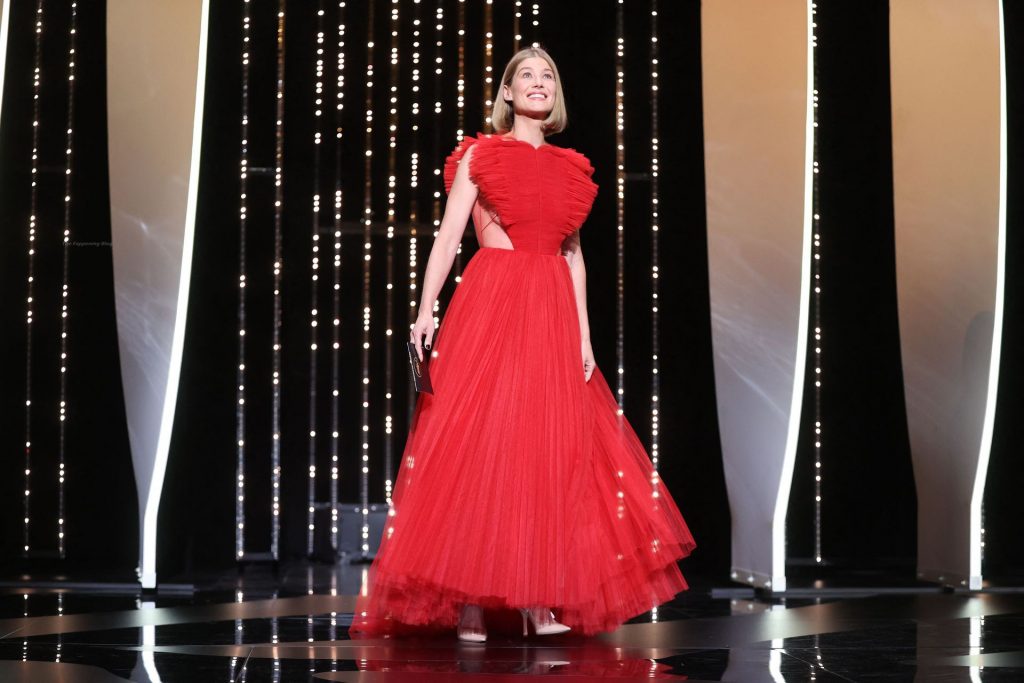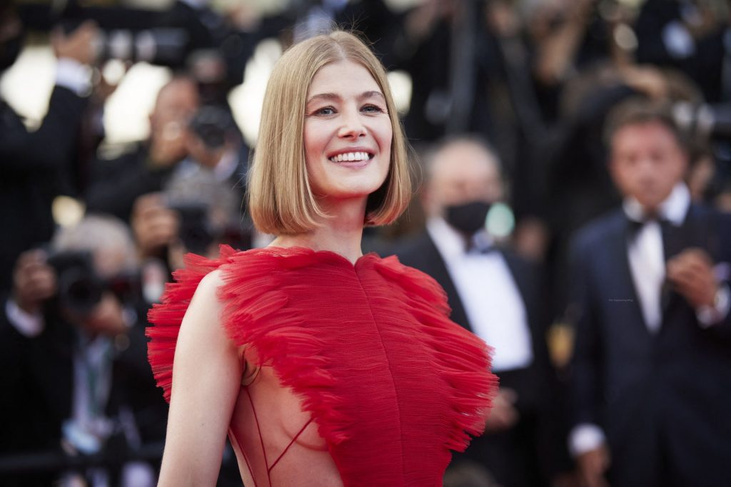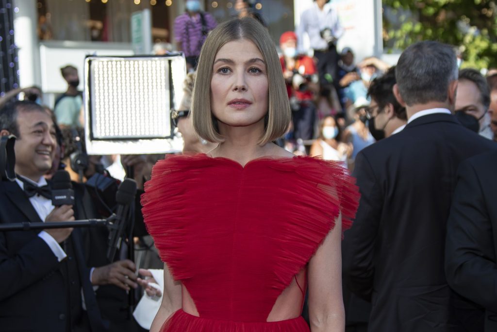 L’actrice Rosamund Pike arrive à la cérémonie de clôture et à la projection du film “OSS 117 : Alerte Rouge en Afrique Noire” (OSS 117 : From Africa with Love) à Cannes, France, 18/07/2021.