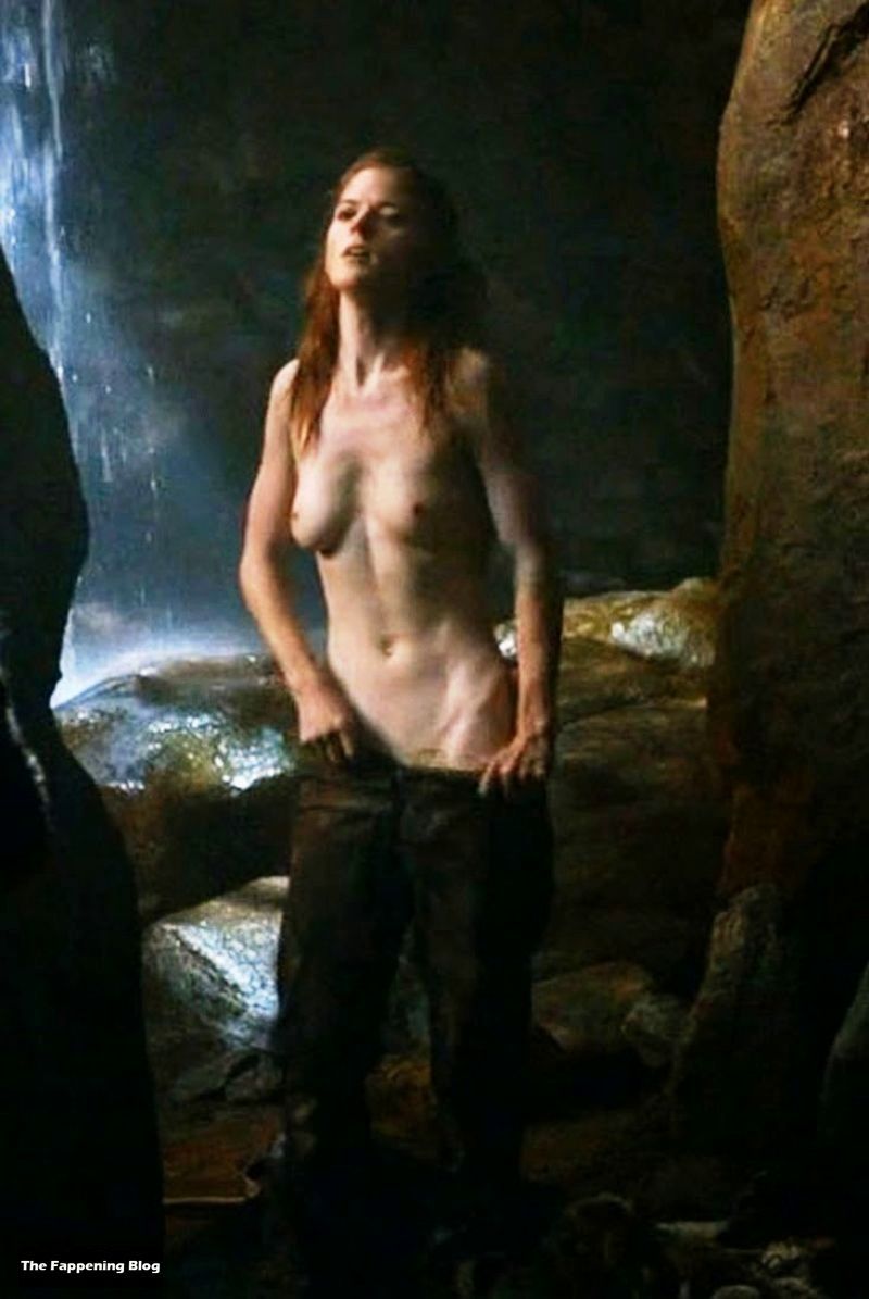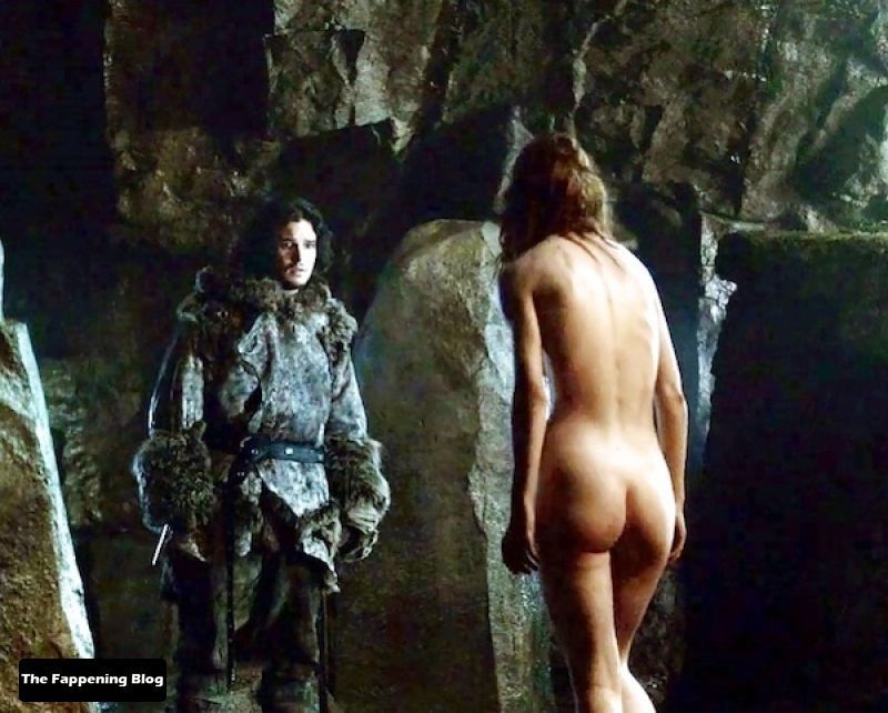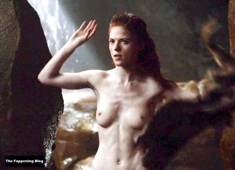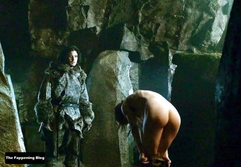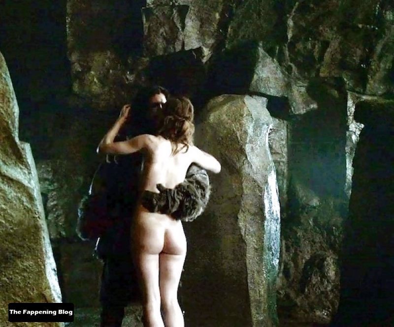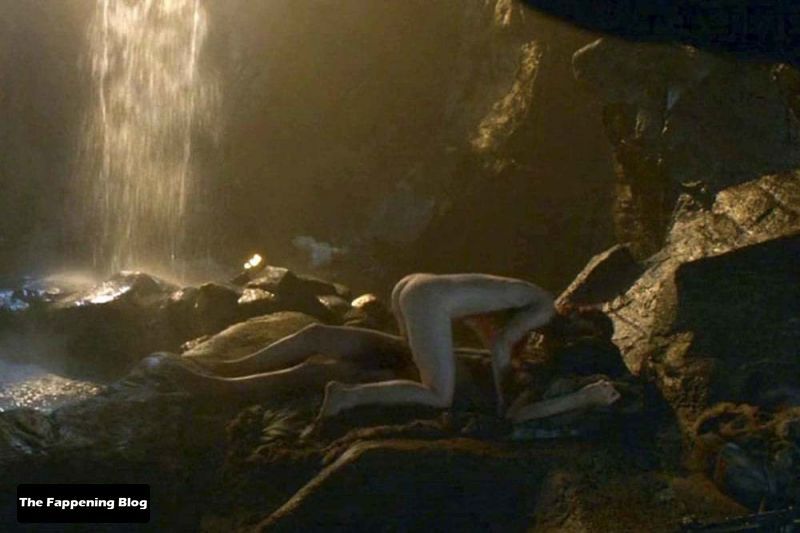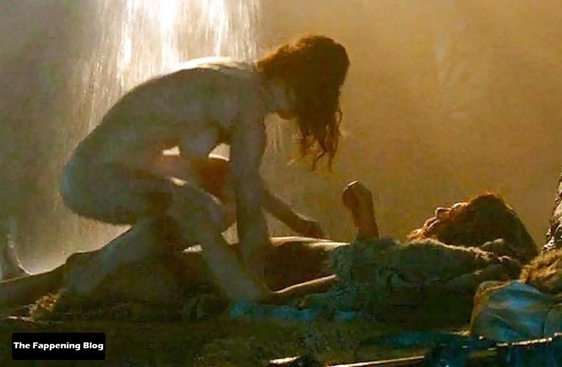 Rose Leslie est nue dans une grotte, montrant d’abord ses seins nus puis son cul et sa chatte nues. Elle embrasse ensuite Jon Snow, qui commence à l’embrasser sur la poitrine et le ventre. On voit ensuite Rose Leslie nue alors que la jeune femme est à califourchon sur l’homme allongé sur les rochers au sol de la grotte. Ensuite, elle saute de l’homme dans une piscine d’eau, et il la rejoint pour qu’ils puissent s’embrasser encore plus.