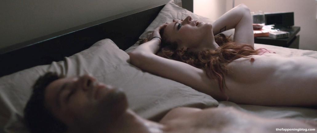 Naked Rose Leslie has doggy-style sex with her from behind, seen out of focus on a bed from across the room. We then get a clear view of her bare breasts.