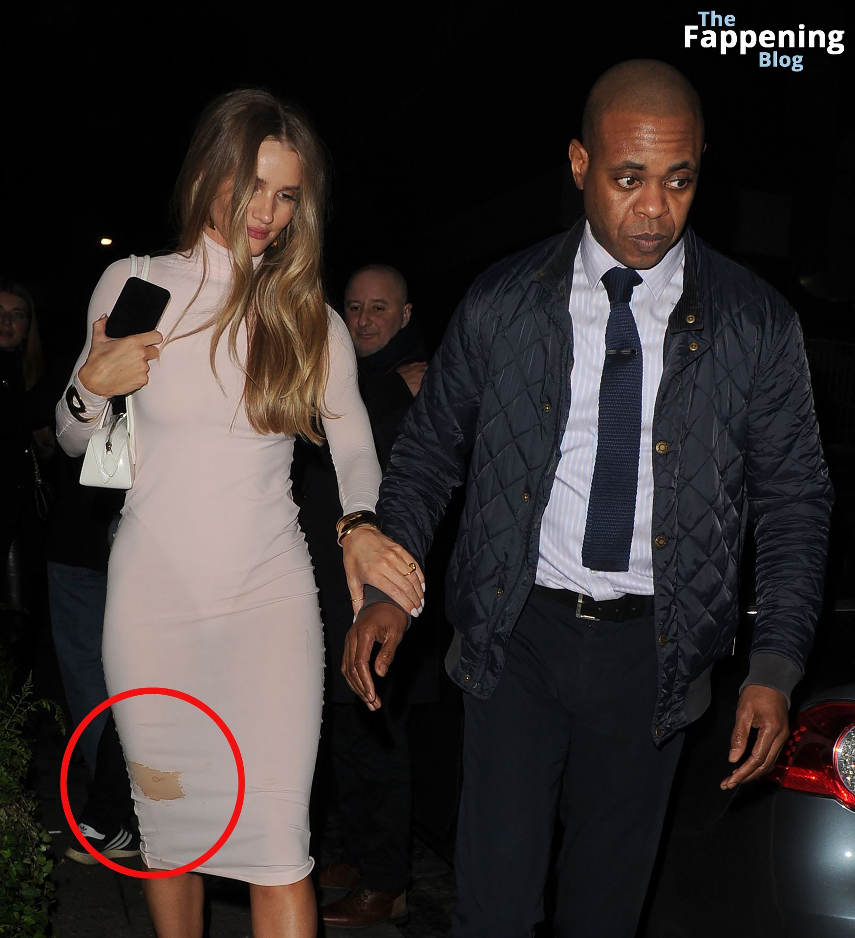 Rosie avait une tache de boisson sur sa robe, qui n’était pas là à son arrivée au Firehouse. Le mannequin portait une robe rose pâle avec un justaucorps en dessous, mettant en valeur sa silhouette enviable.
