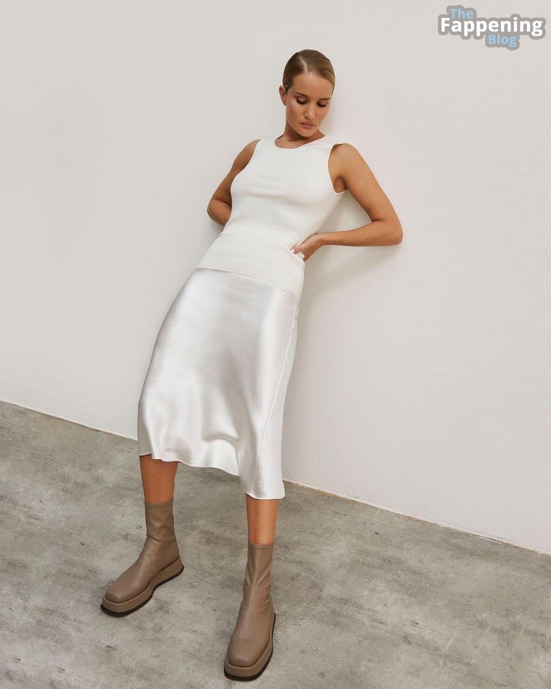 Le mannequin porte des bottes en cuir à talons associées à une mini-robe en soie de la même teinte, et pour attirer encore plus l’attention, Rosie Huntington-Whiteley a dévoilé un aperçu de sa culotte sous sa jupe. Cette combinaison est très élégante. Rosie mélange des bottines épaisses couleur latte avec une jupe en soie blanche et un t-shirt en coton côtelé. Ce contraste renforce le côté féminin.