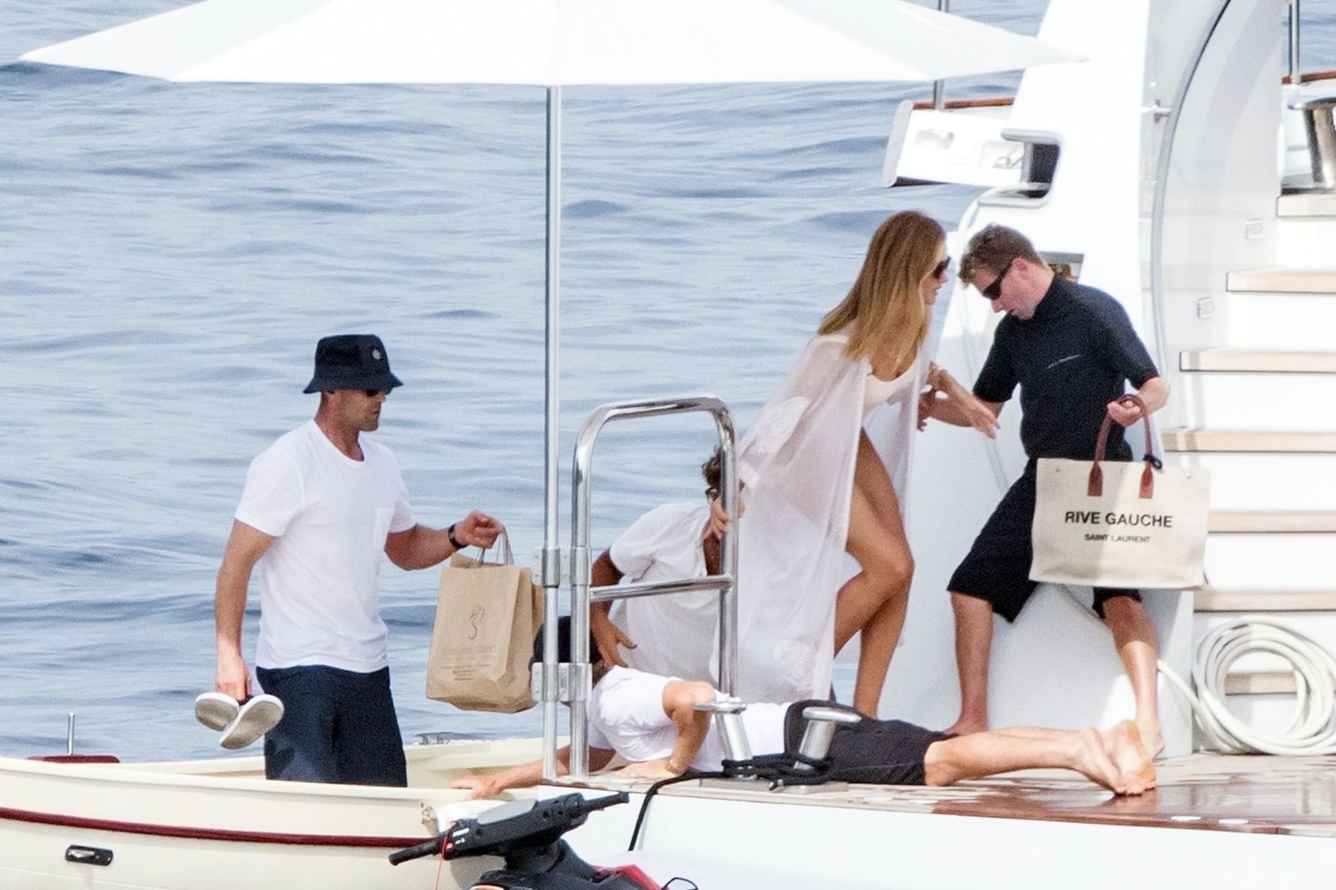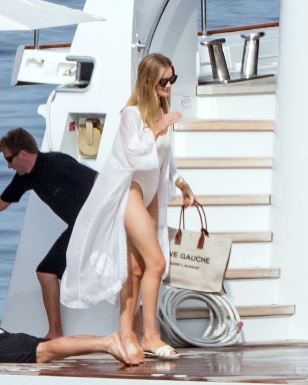 Rosie portait un maillot de bain blanc moulant mettant en valeur sa silhouette impressionnante et a été vue enlaçant Jason avec une étreinte amoureuse à bord de leur bateau de luxe avant de descendre à terre pour manger un morceau.