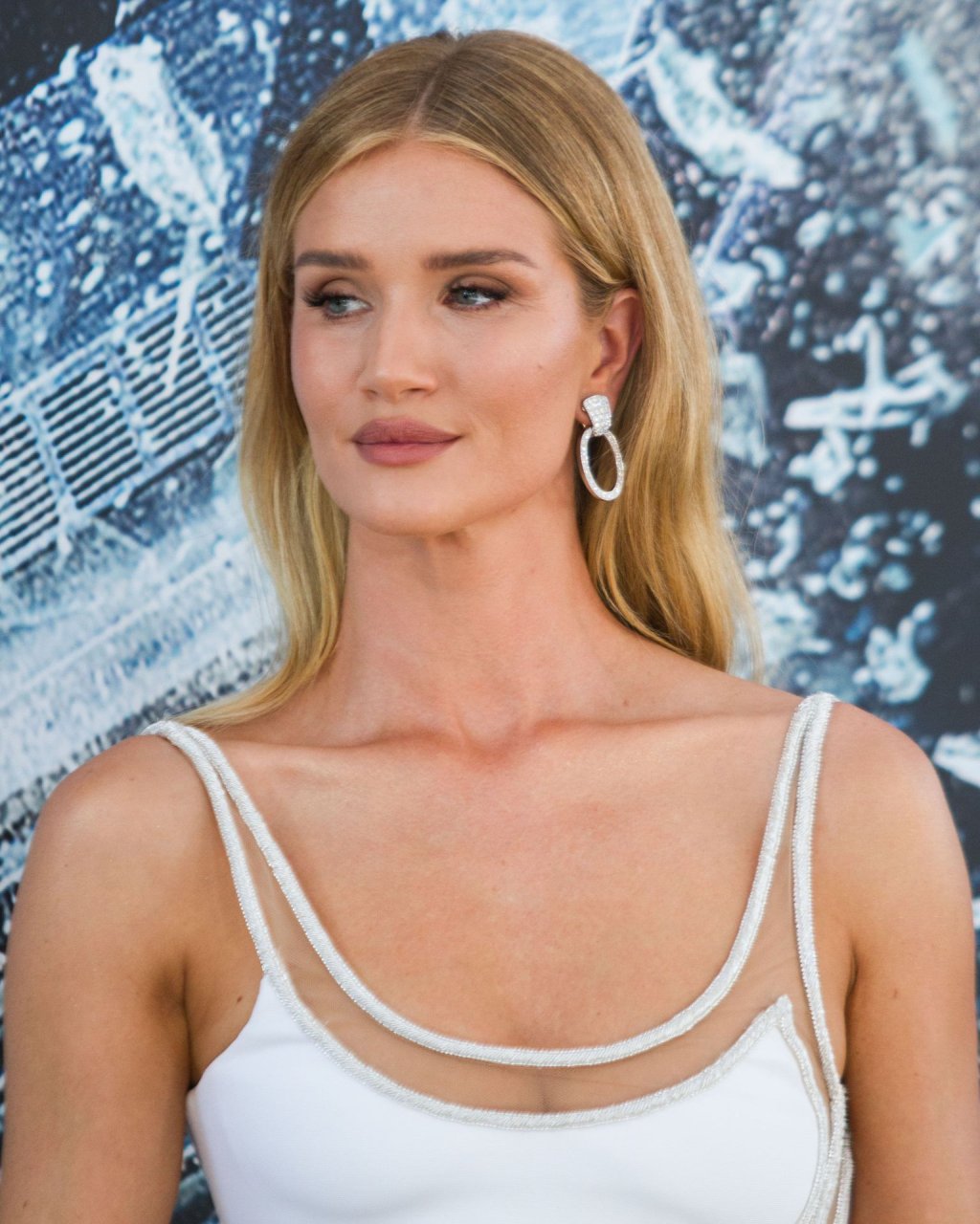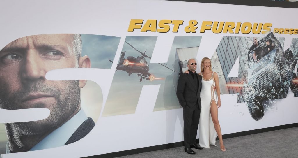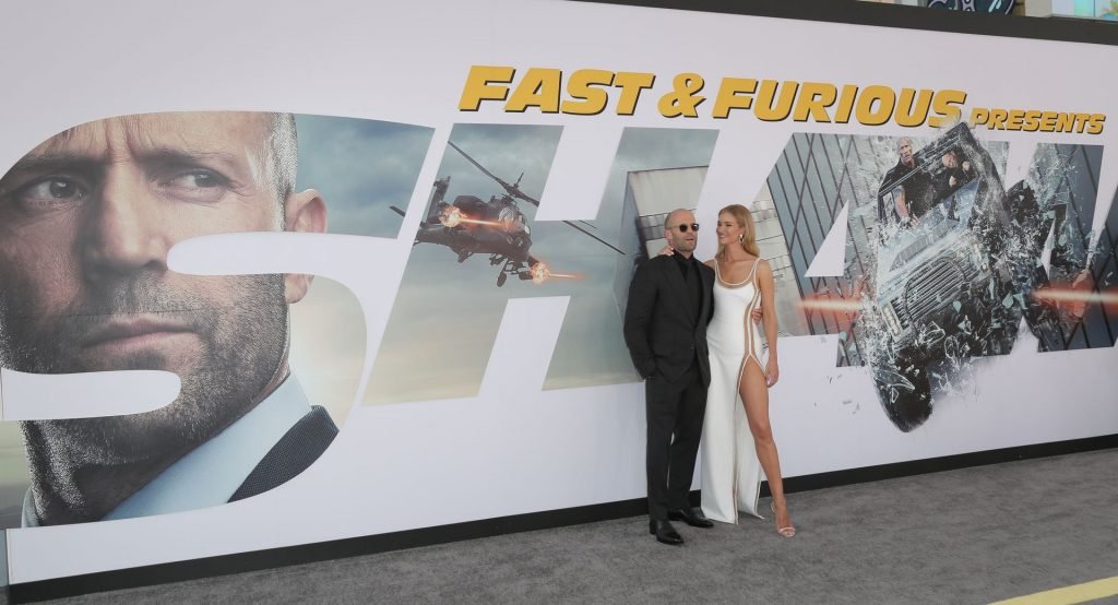 Rosie Huntington-Whiteley arrive avec Jason Statham à la première de “Fast & Furious Presents: Hobbs & Shaw” de Universal Pictures au Dolby Theatre à Hollywood, le 13/07/2019. Le mannequin a exhibé sa jambe sexy en portant une robe blanche moulante.