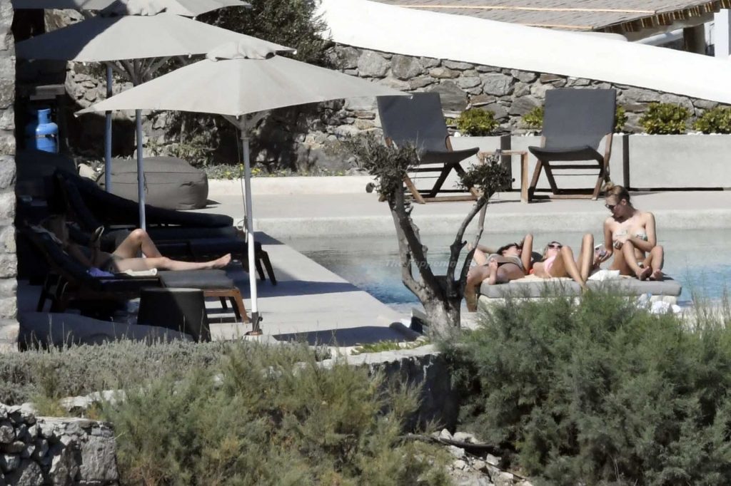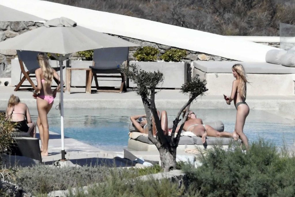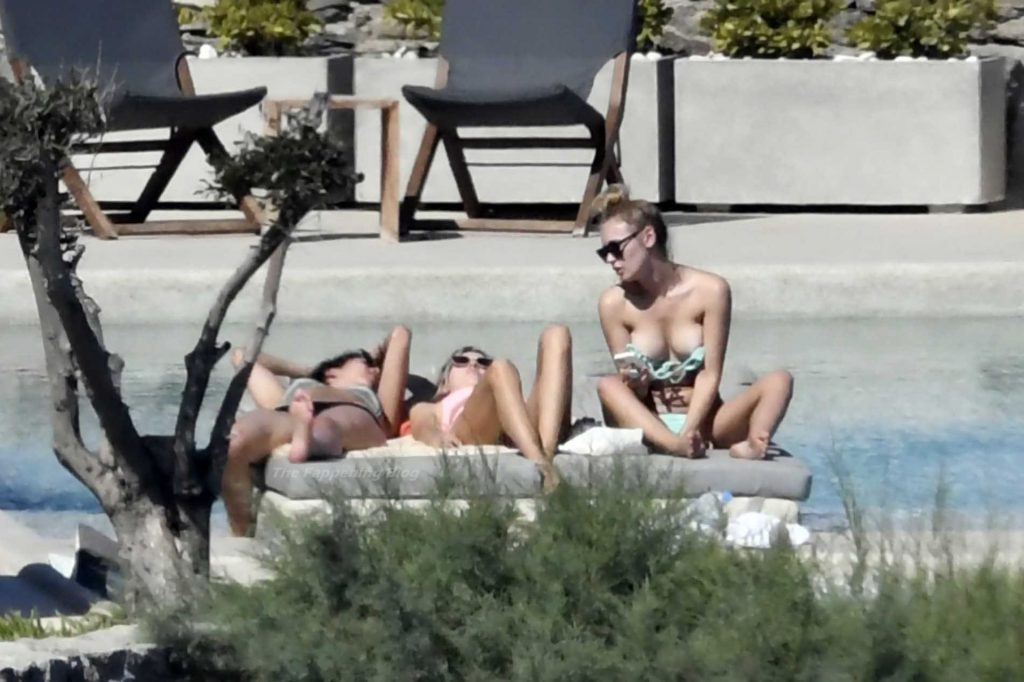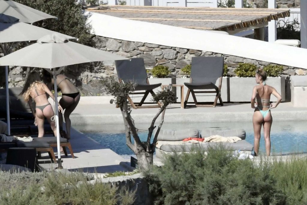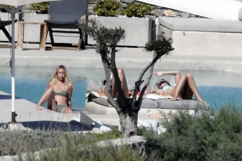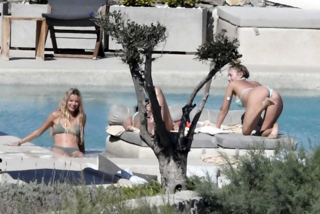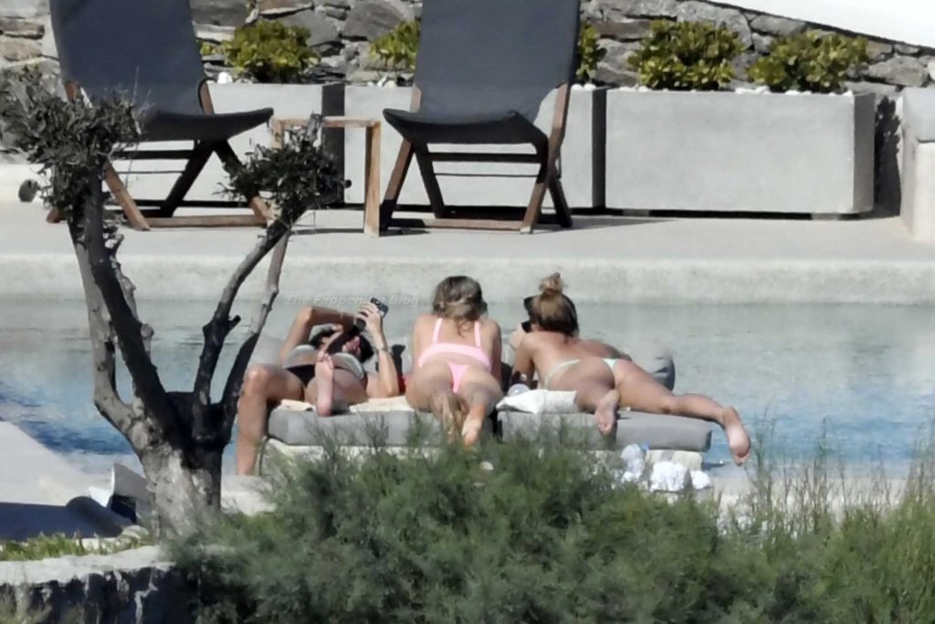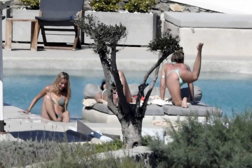 Les deux beautés en bikini et même topless se détendent et plaisantent avec d’autres amis tout en prenant le soleil au bord de la piscine pendant leur séjour de vacances à Mykonos.