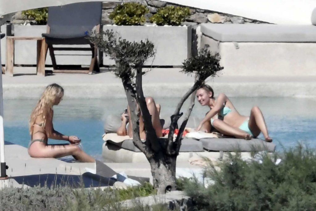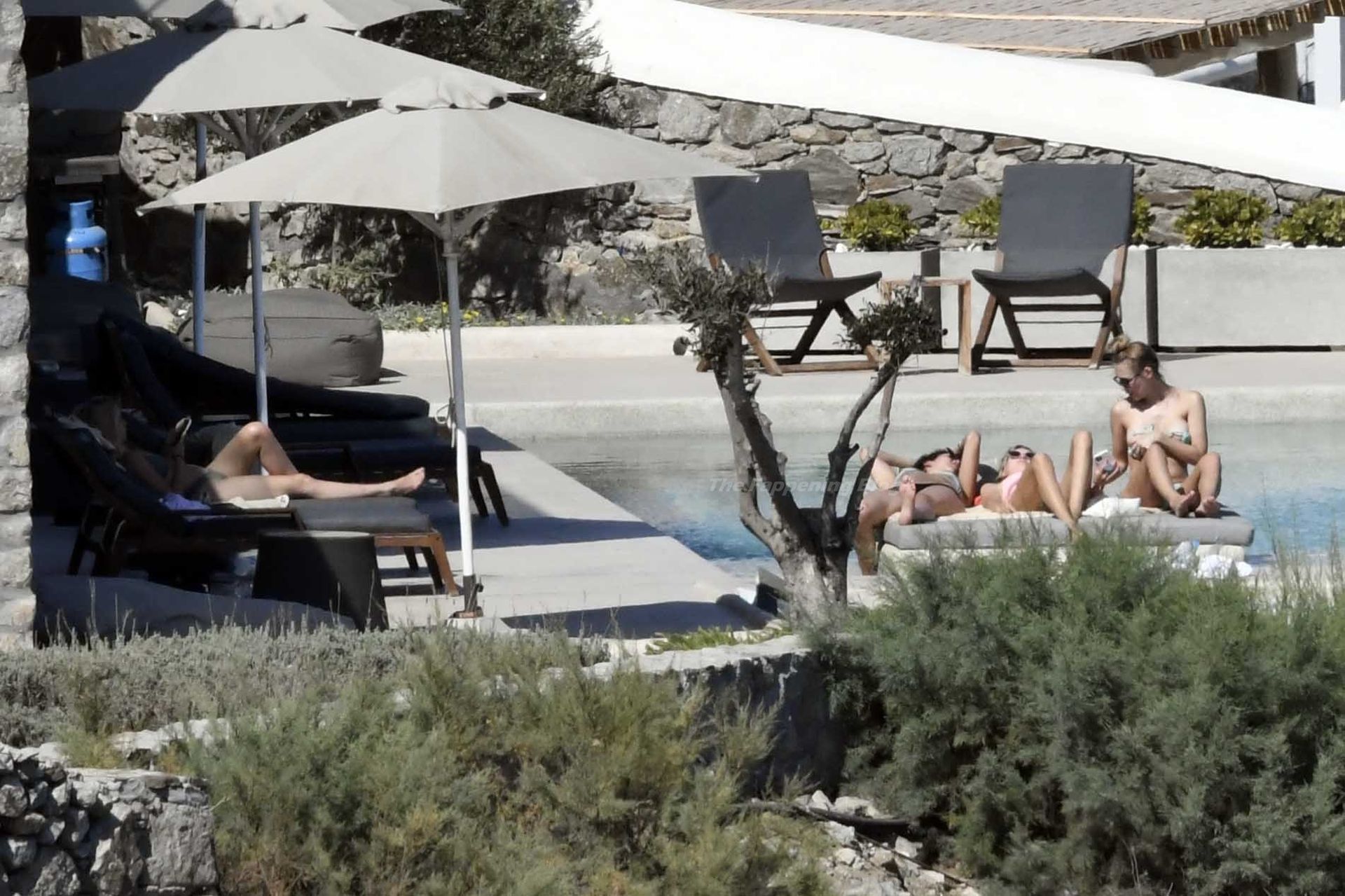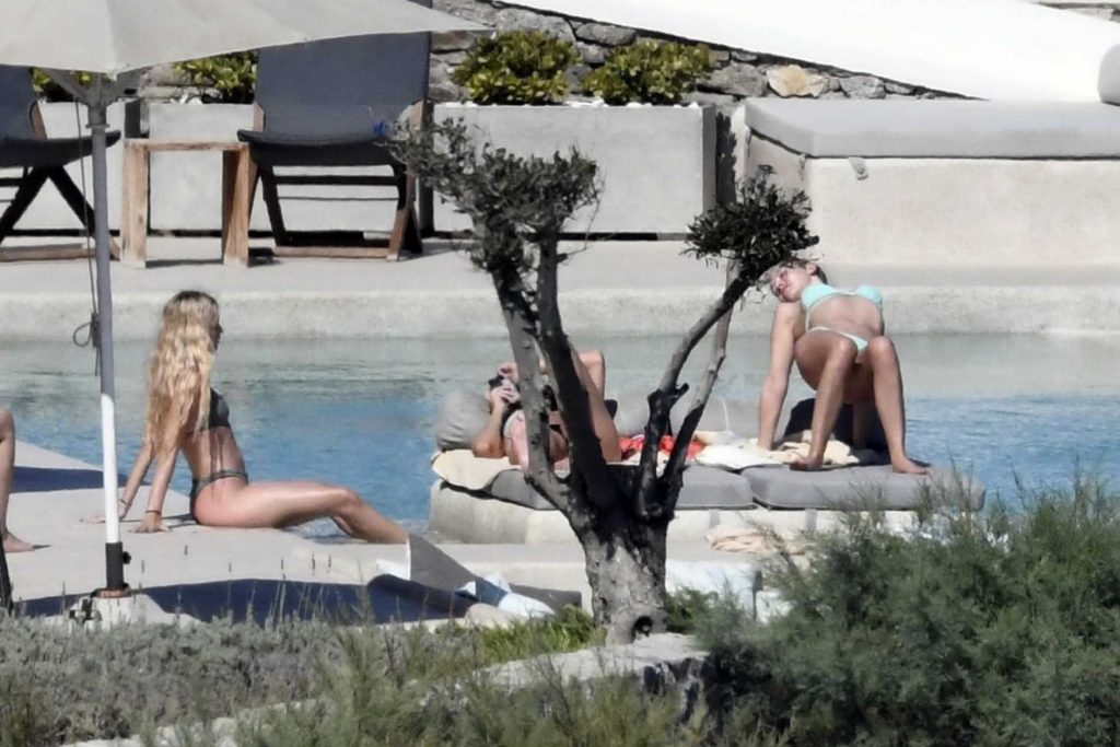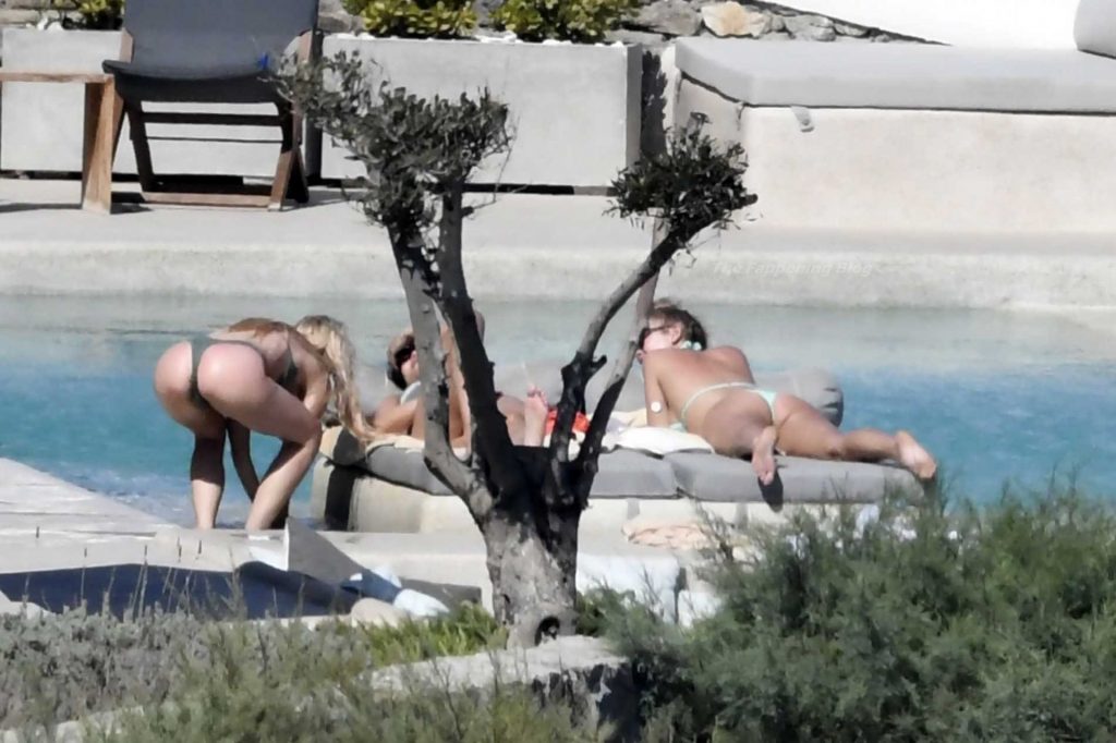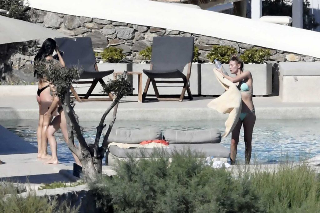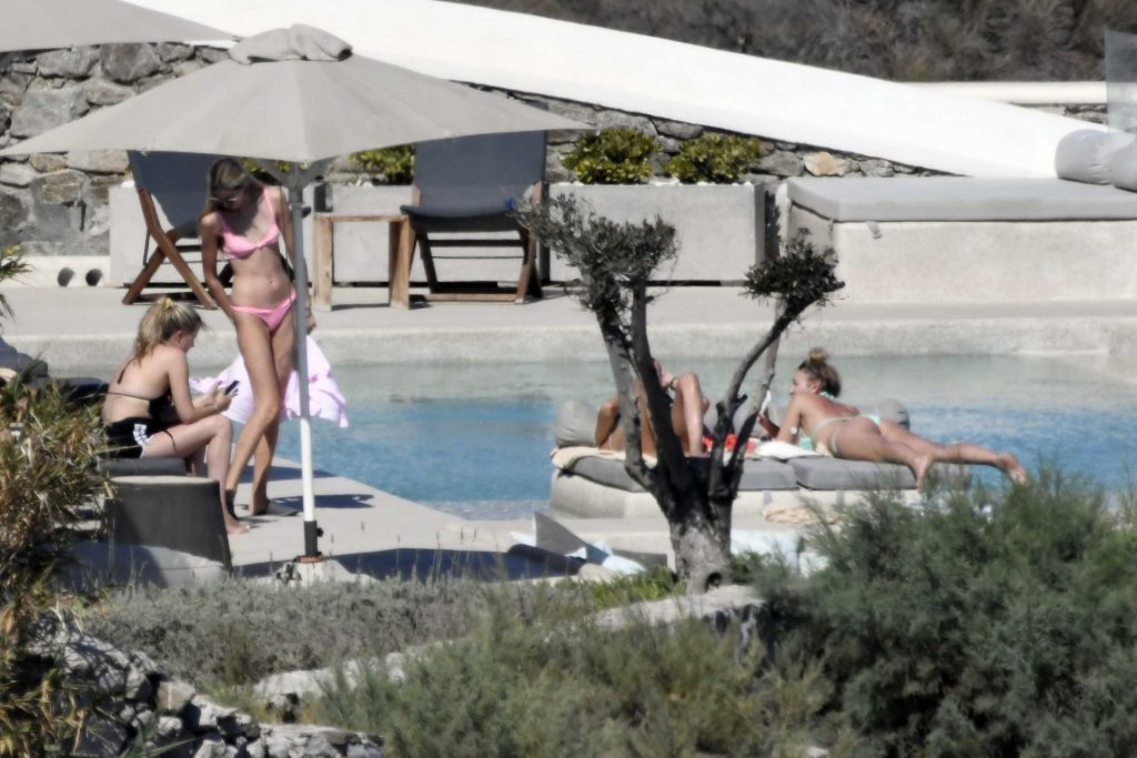 Les deux beautés en bikini et même topless se détendent et plaisantent avec d’autres amis tout en prenant le soleil au bord de la piscine pendant leur séjour de vacances à Mykonos.