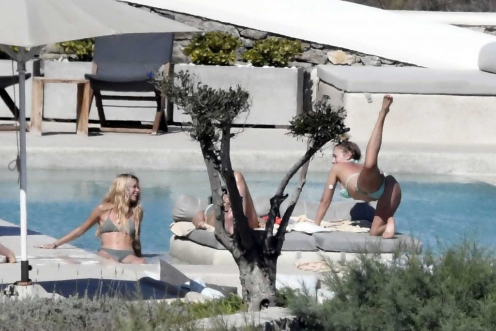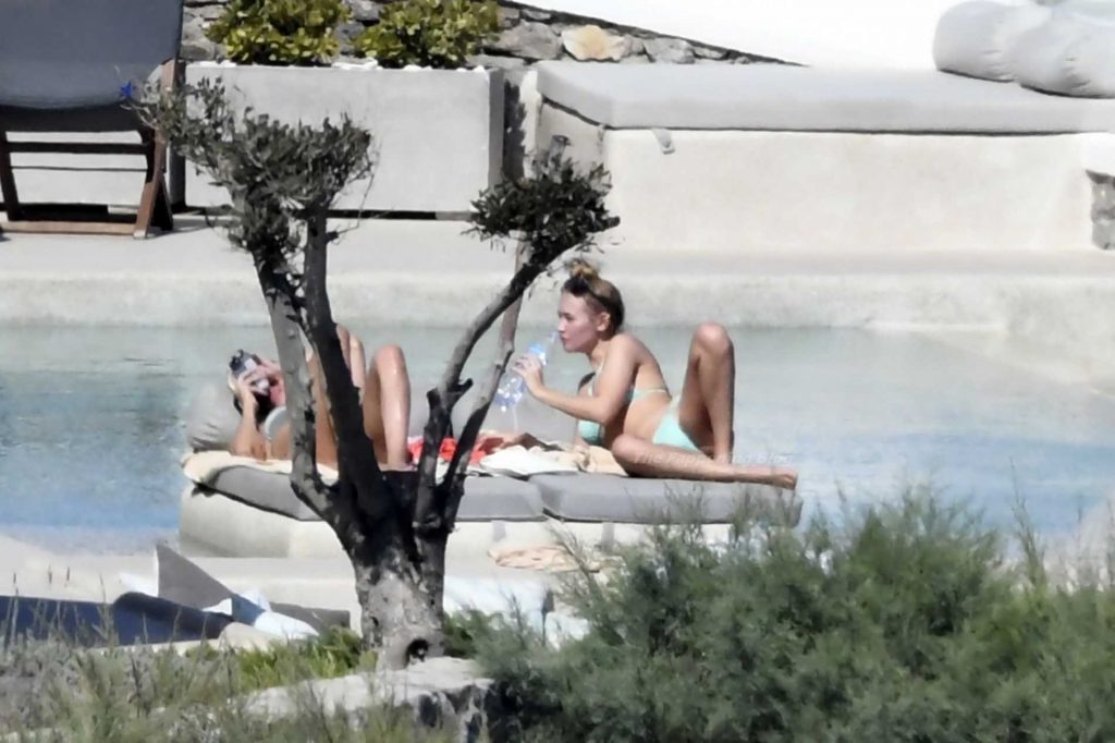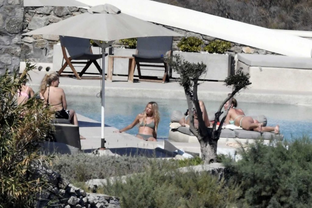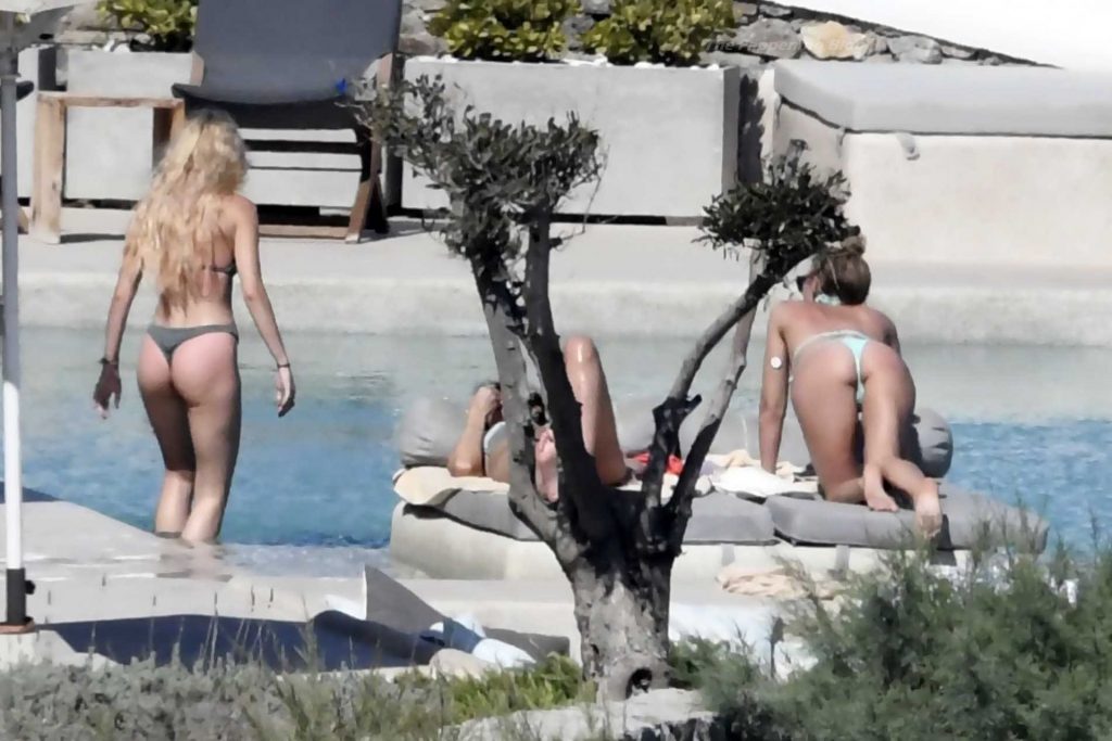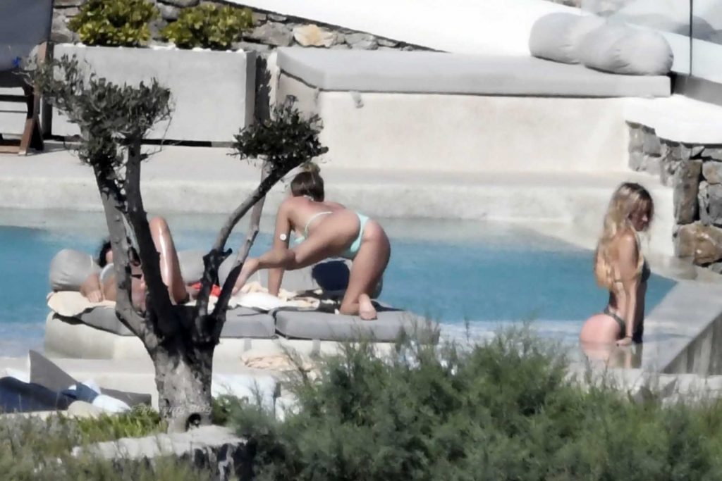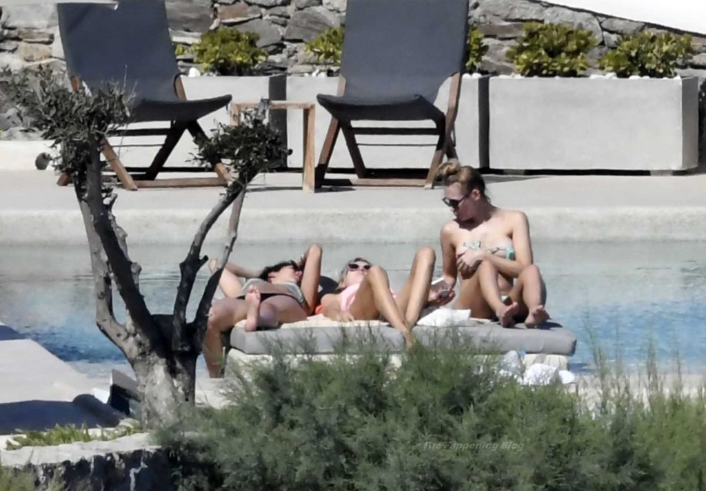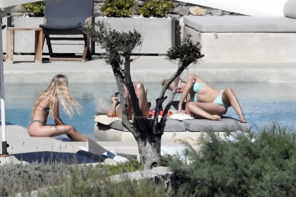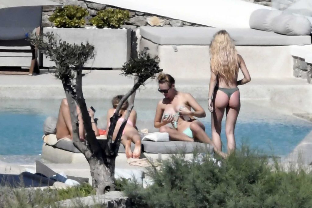 Les deux beautés en bikini et même topless se détendent et plaisantent avec d’autres amis tout en prenant le soleil au bord de la piscine pendant leur séjour de vacances à Mykonos.