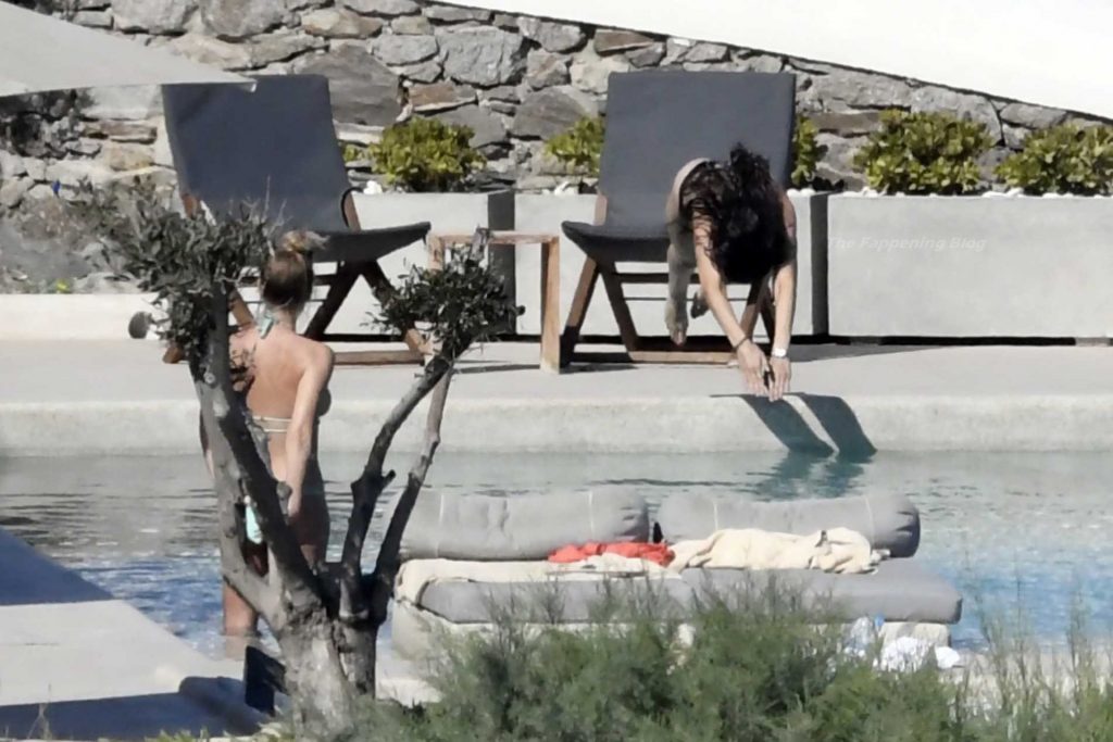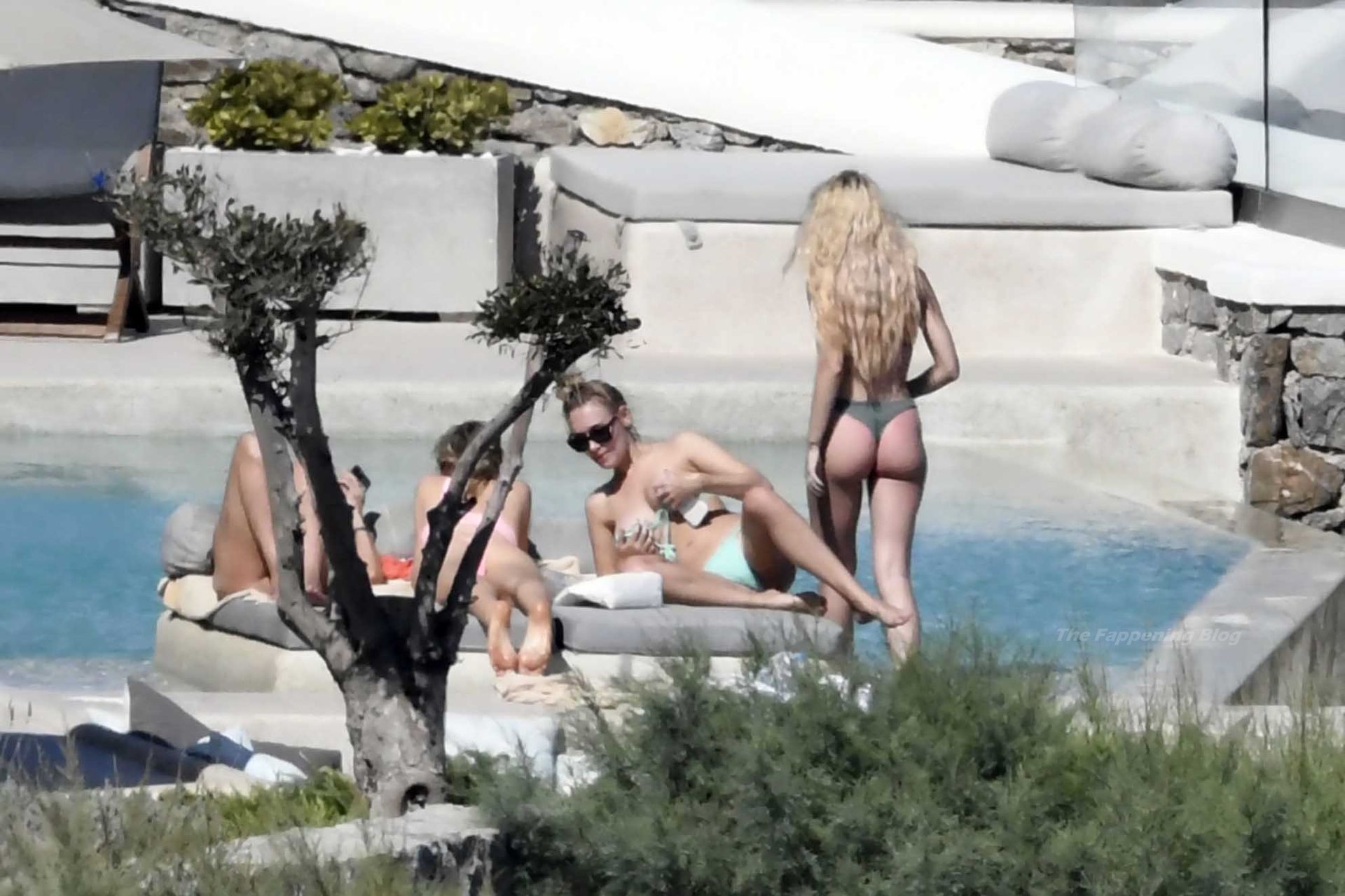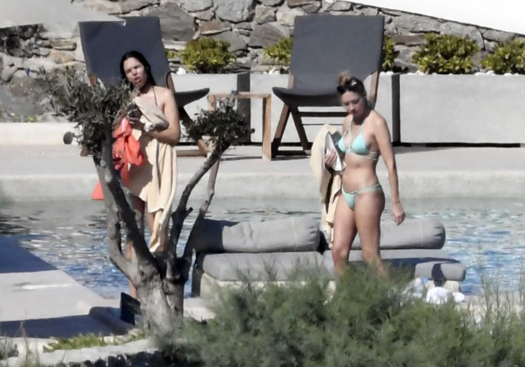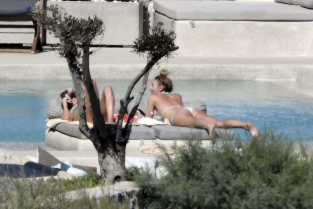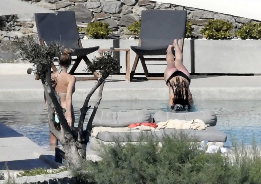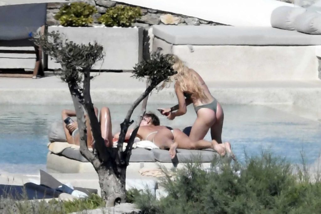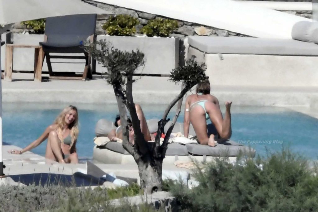 Les deux beautés en bikini et même topless se détendent et plaisantent avec d’autres amis tout en prenant le soleil au bord de la piscine pendant leur séjour de vacances à Mykonos.
