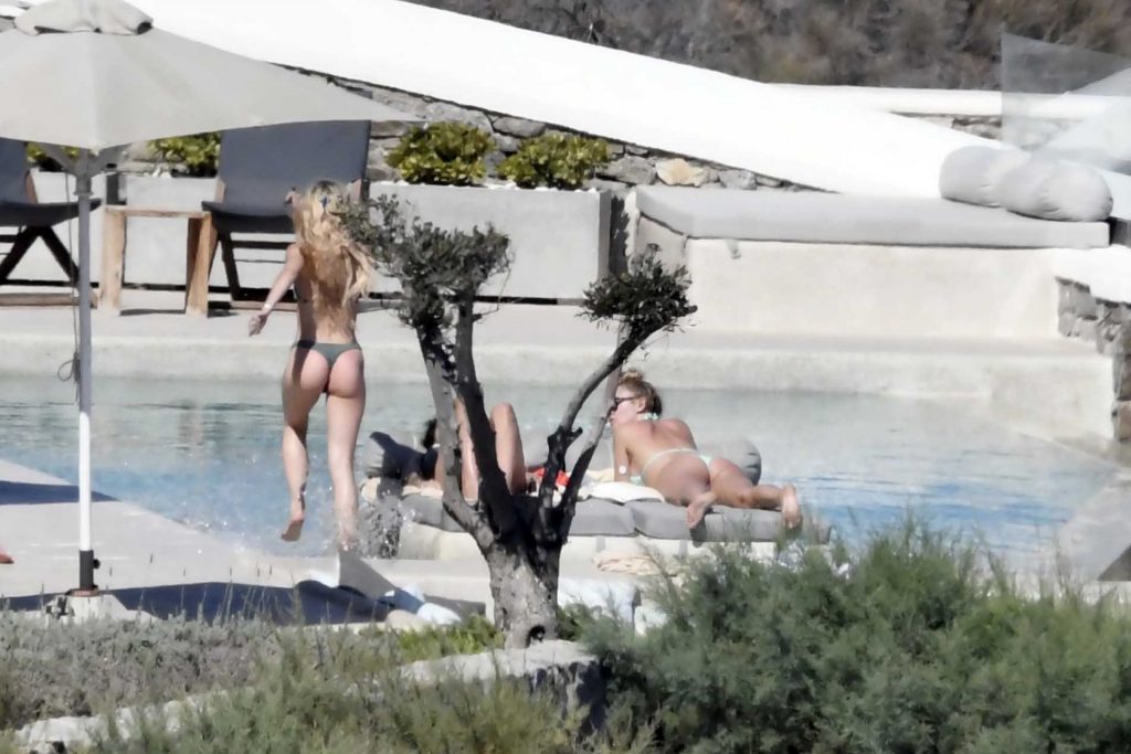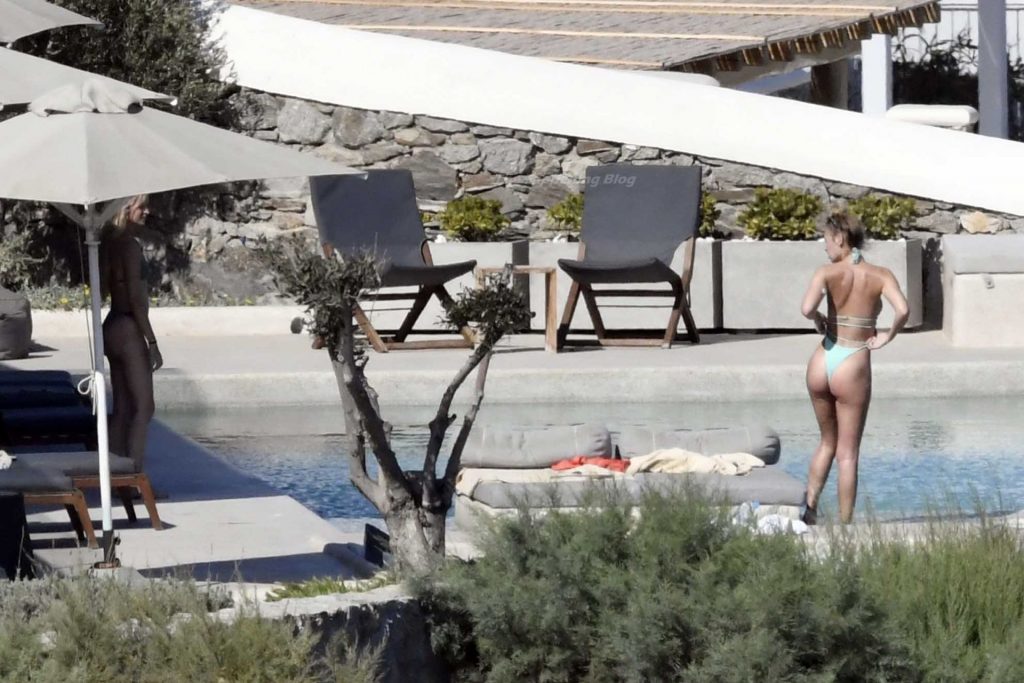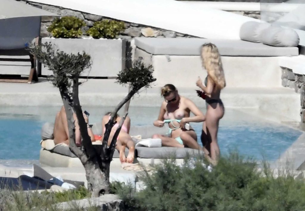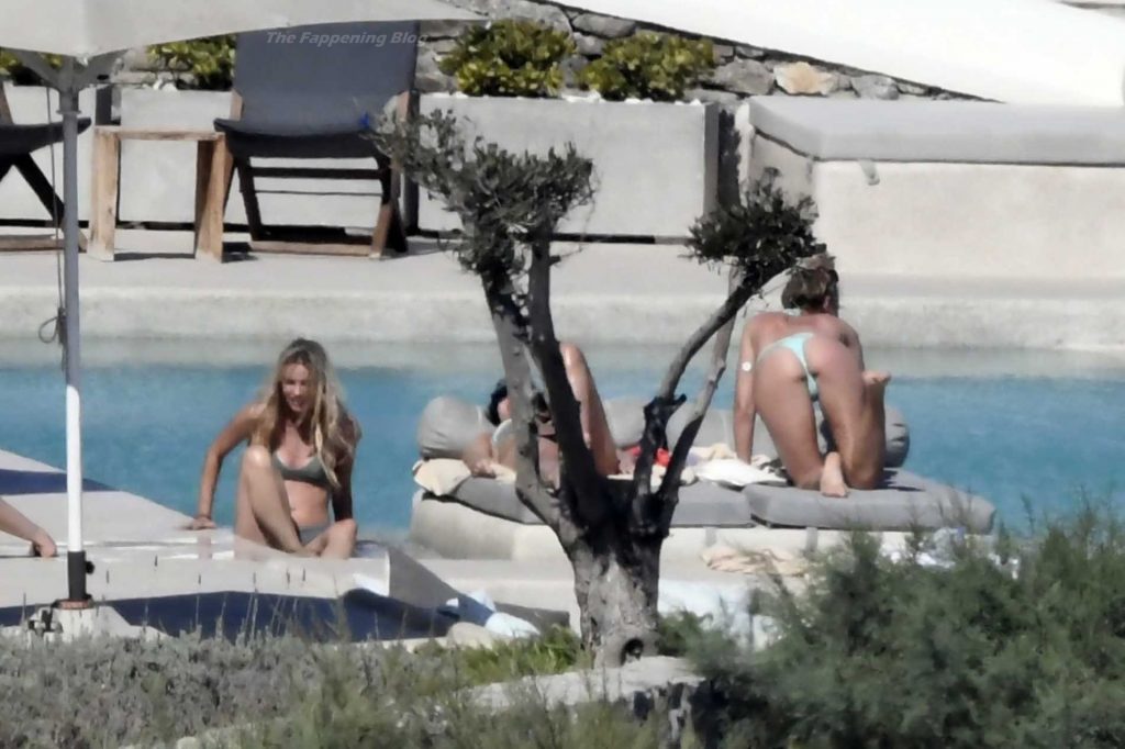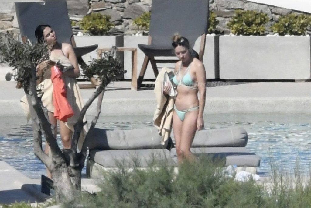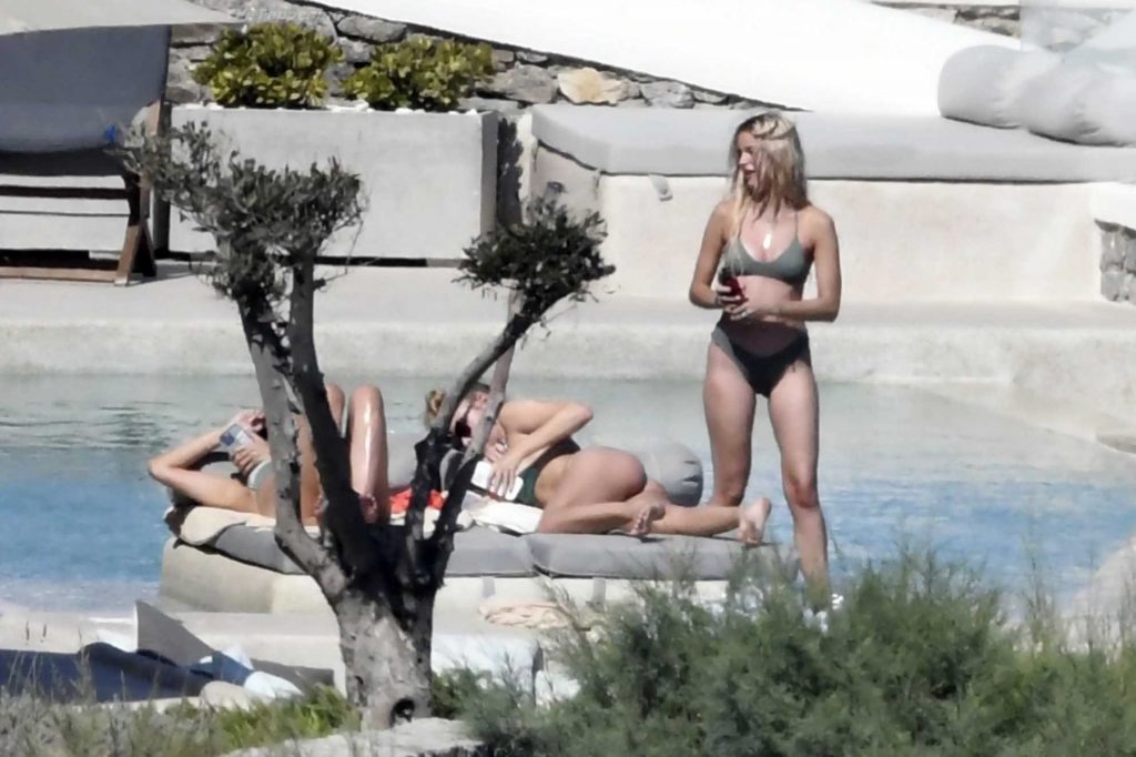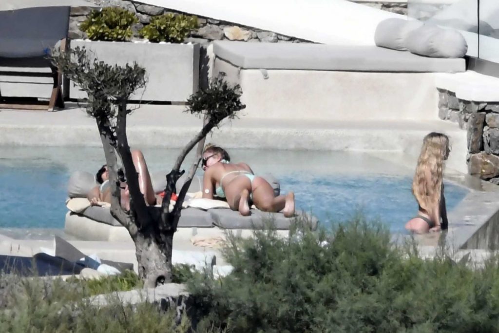 Les deux beautés en bikini et même topless se détendent et plaisantent avec d’autres amis tout en prenant le soleil au bord de la piscine pendant leur séjour de vacances à Mykonos.