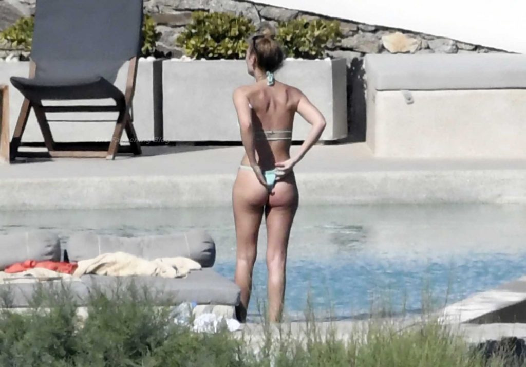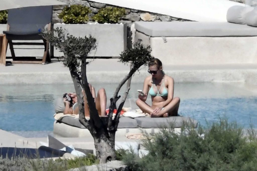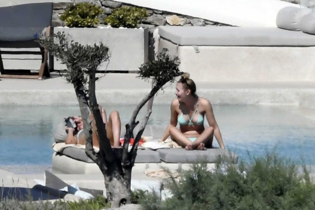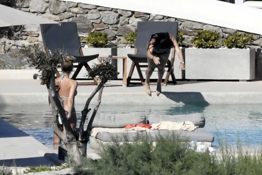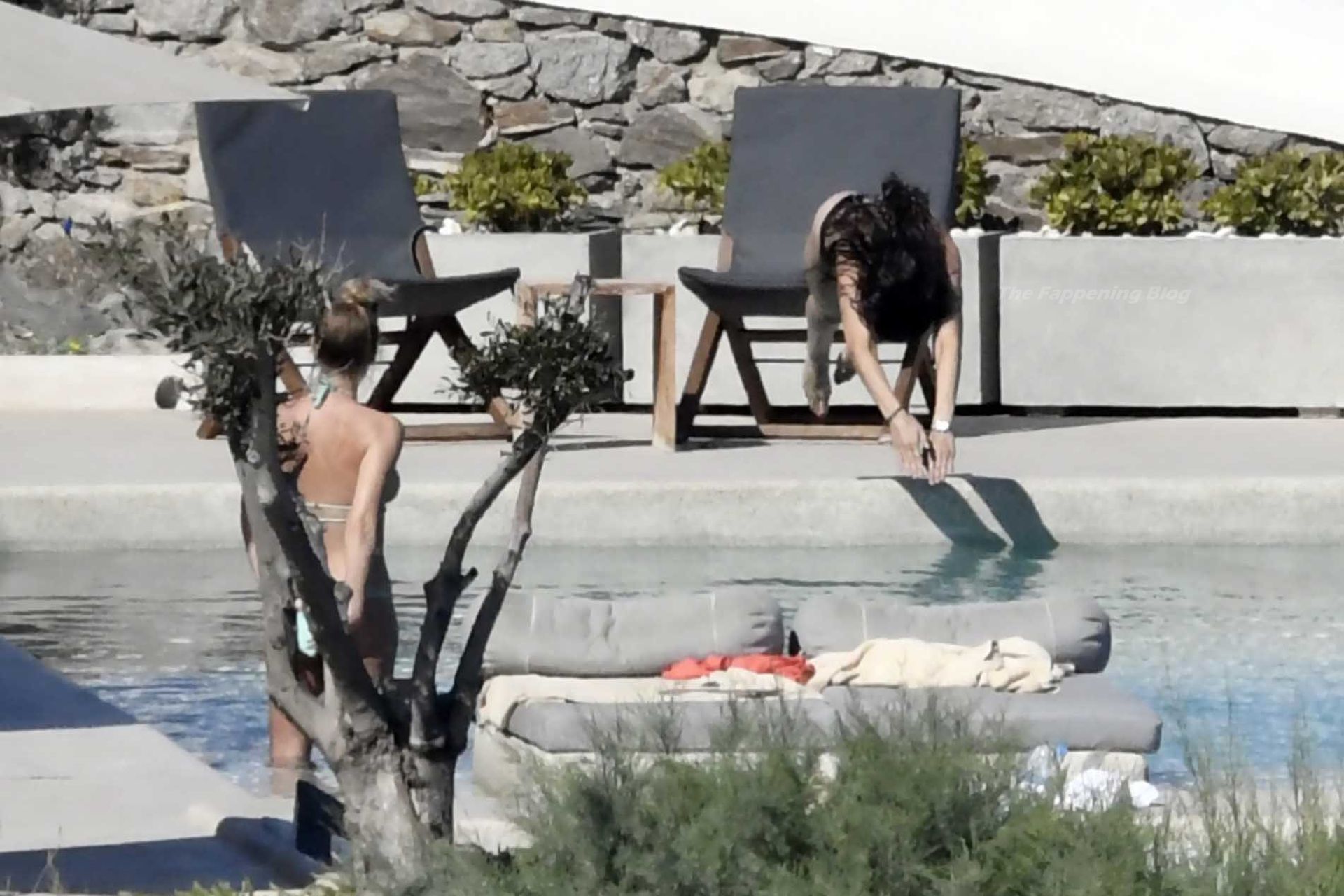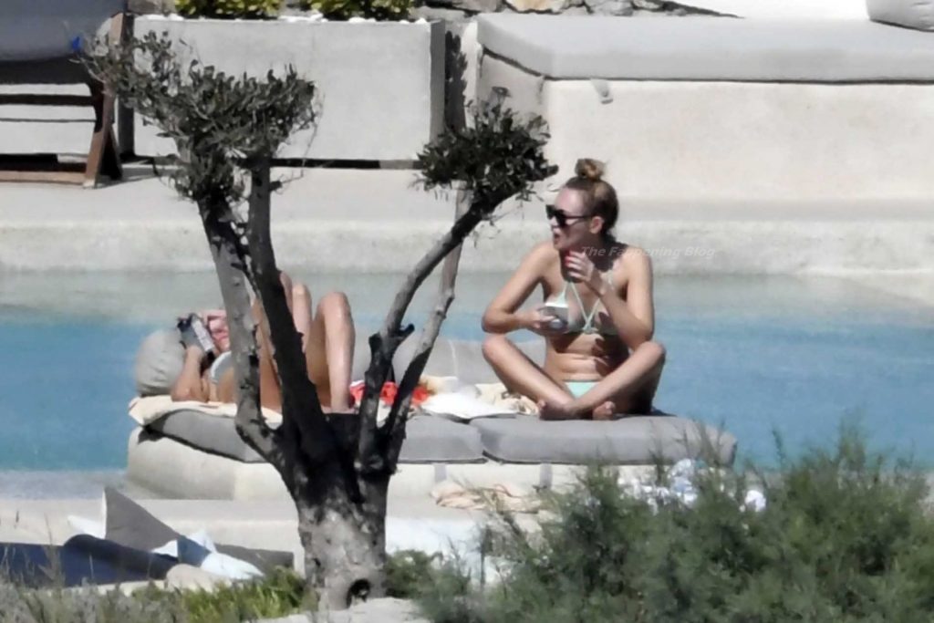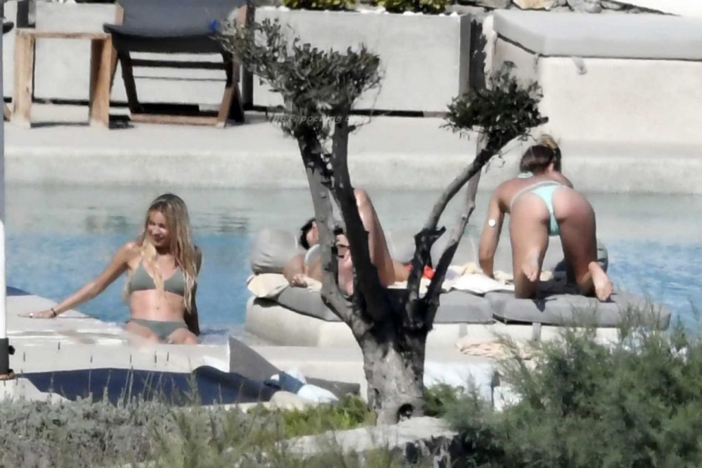 Les deux beautés en bikini et même topless se détendent et plaisantent avec d’autres amis tout en prenant le soleil au bord de la piscine pendant leur séjour de vacances à Mykonos.