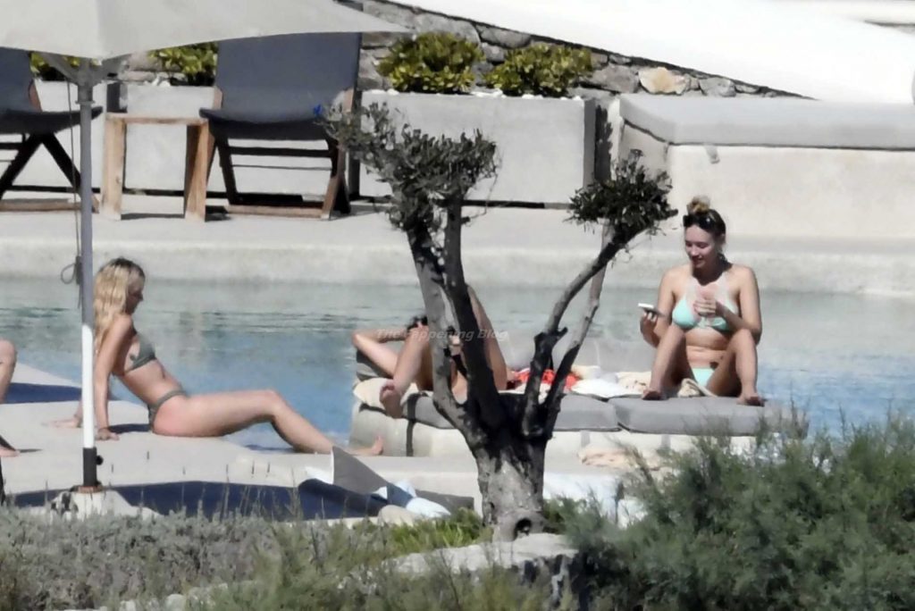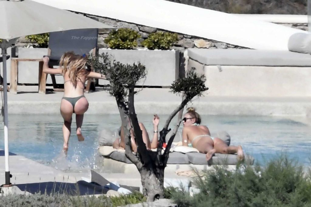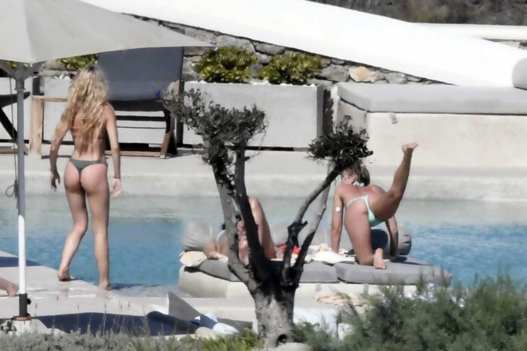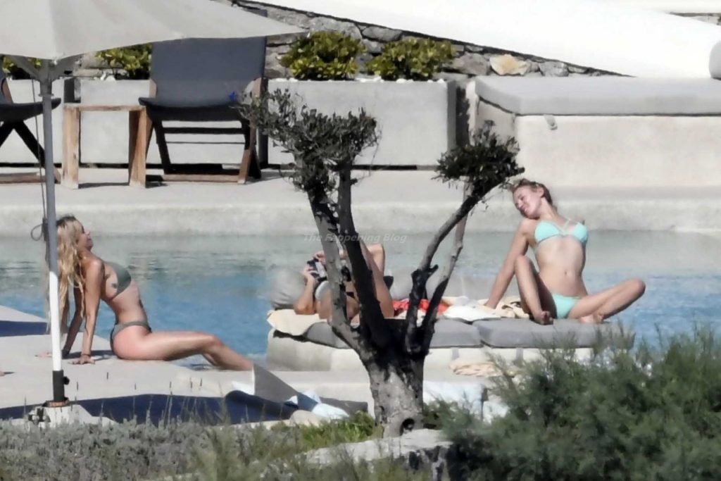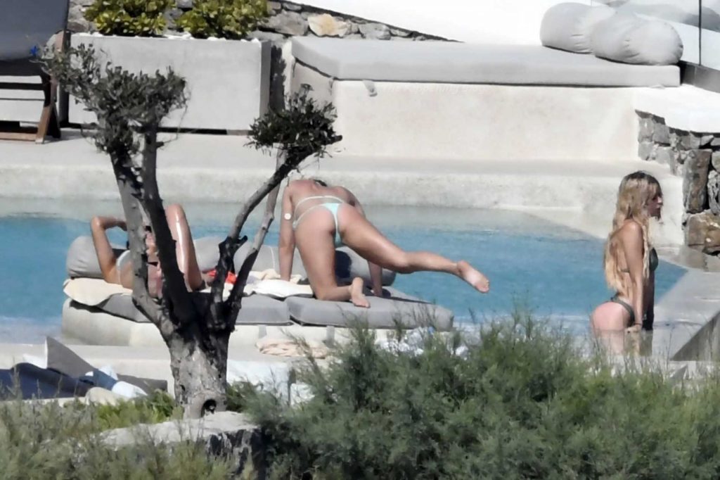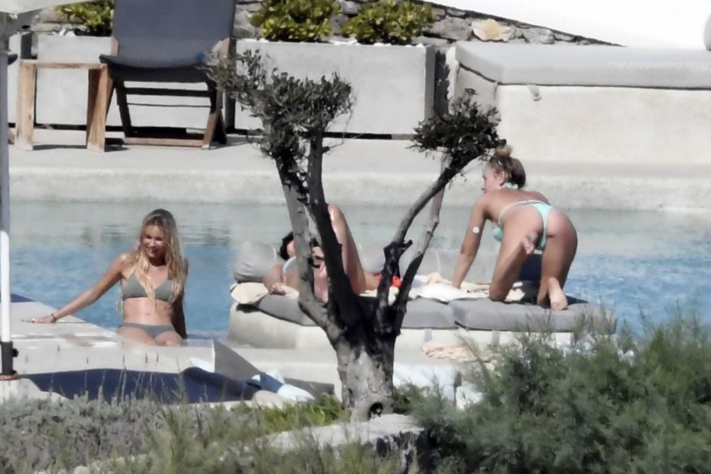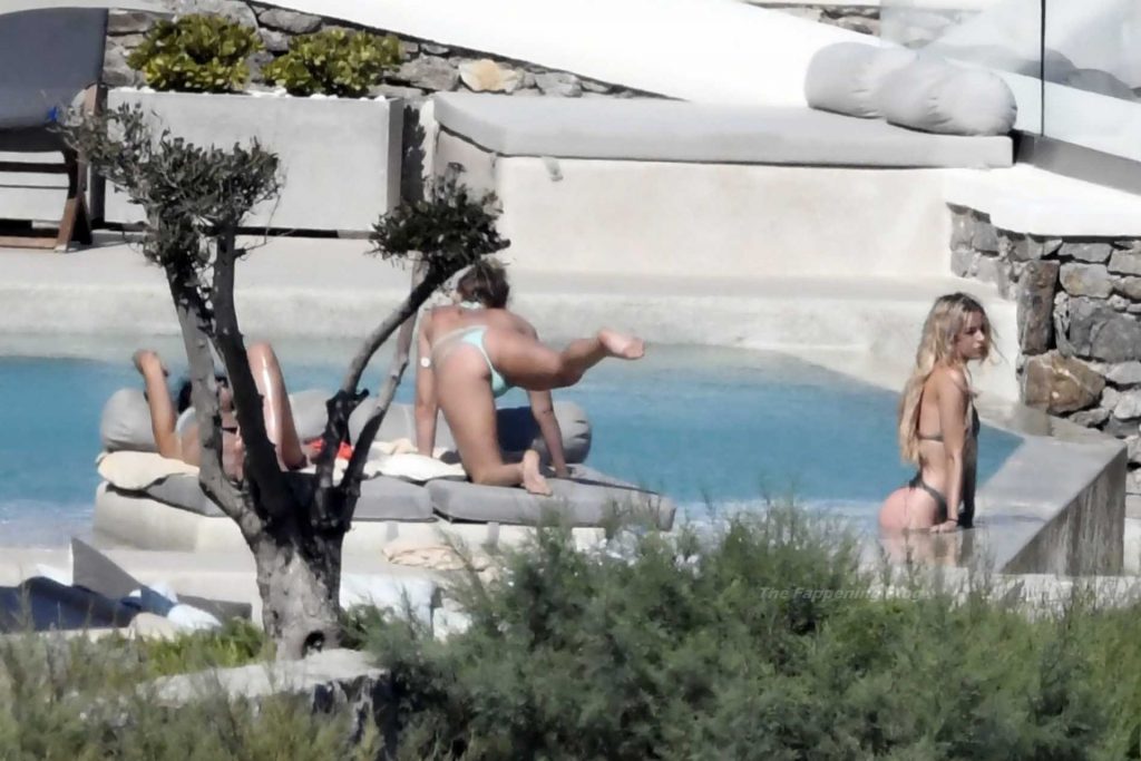 Les mannequins Roxy Horner, petite amie de l’acteur Jack Peter Benedict Whitehall, Sophie Longford et Sarah Elizabeth Lovegrove profitent de l’été grec au bord de la piscine, 16/08/2021.