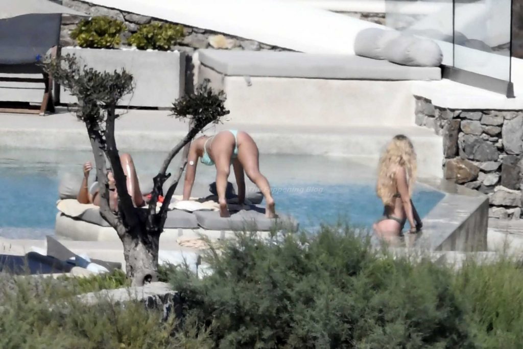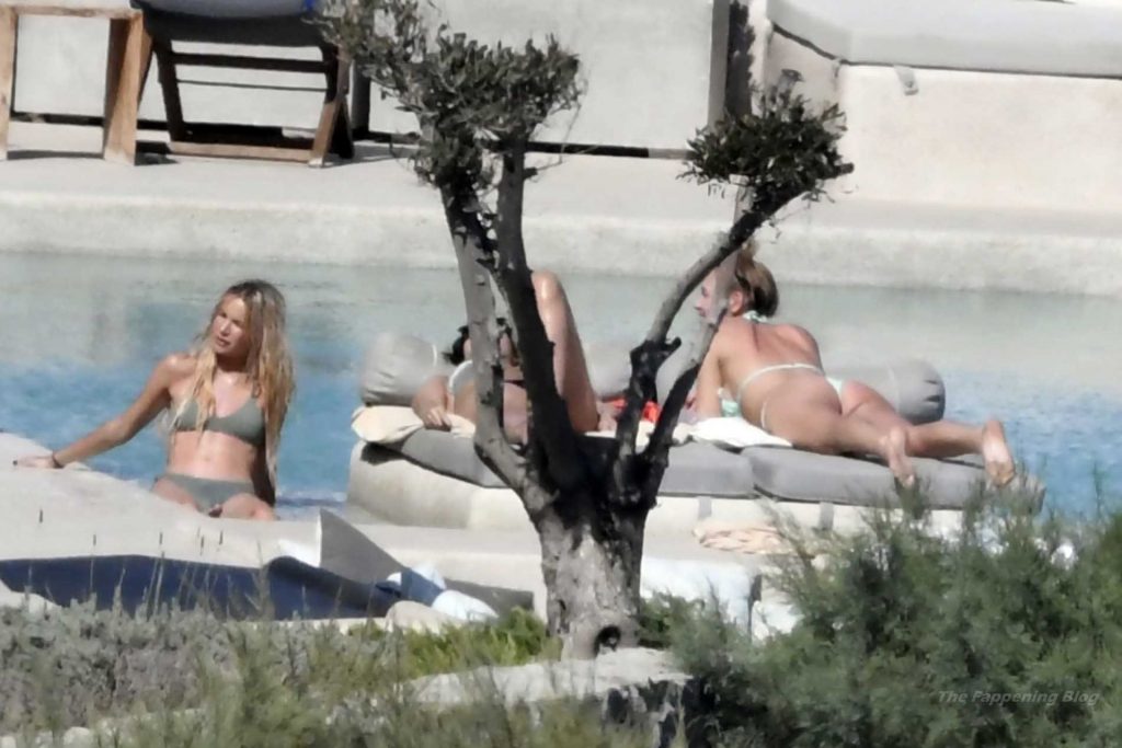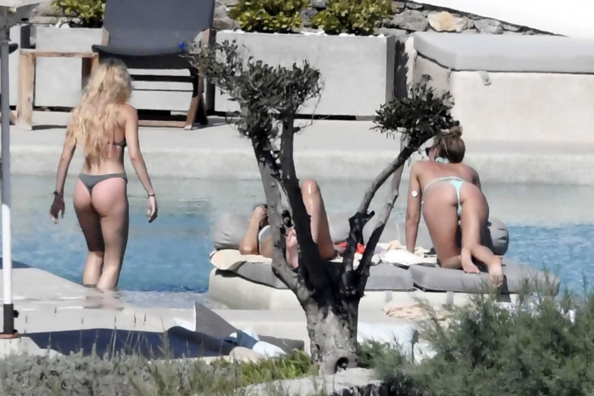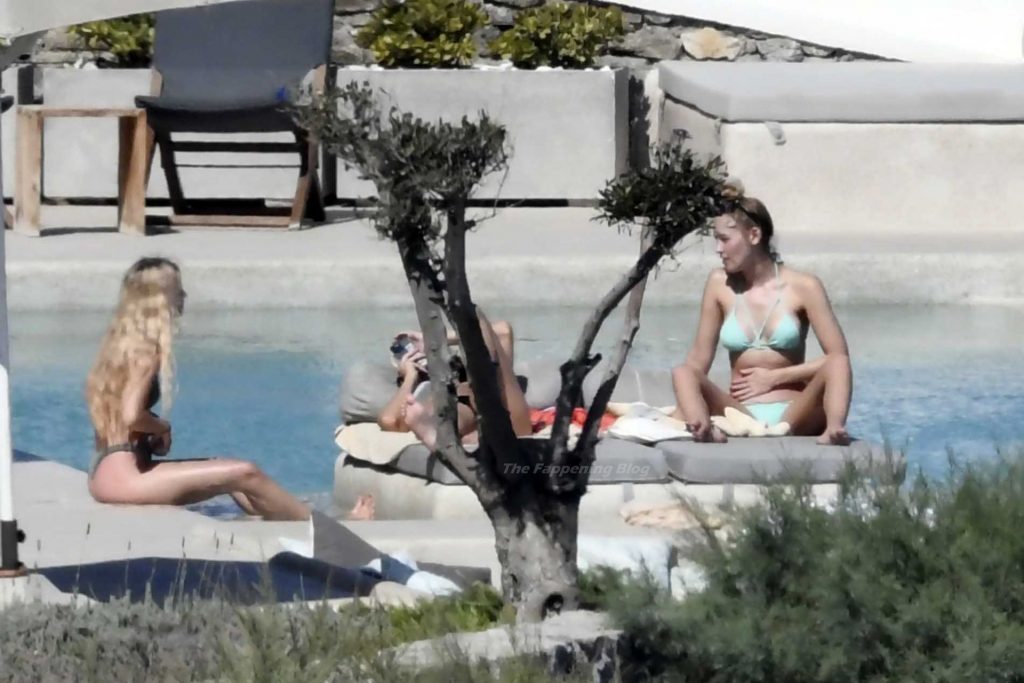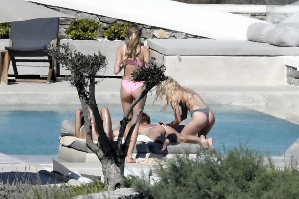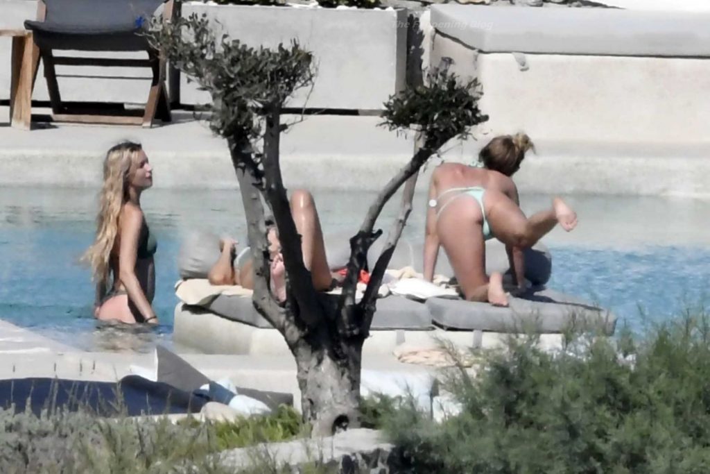 Les mannequins Roxy Horner, petite amie de l’acteur Jack Peter Benedict Whitehall, Sophie Longford et Sarah Elizabeth Lovegrove profitent de l’été grec au bord de la piscine, 16/08/2021.