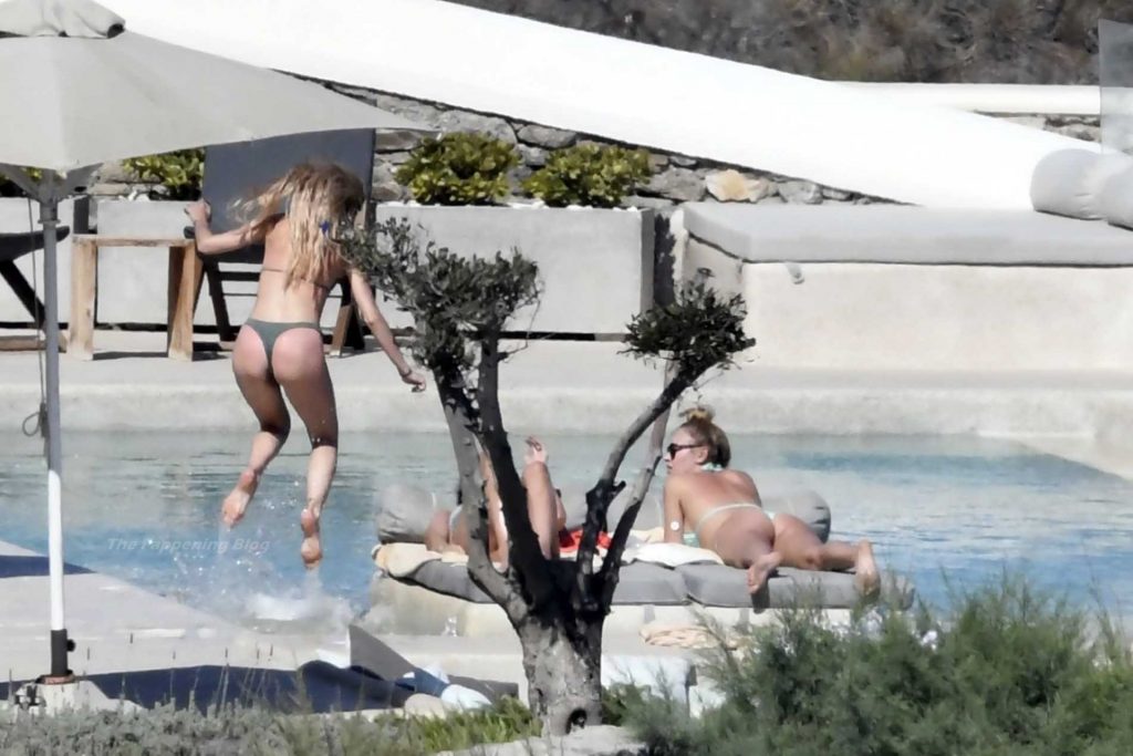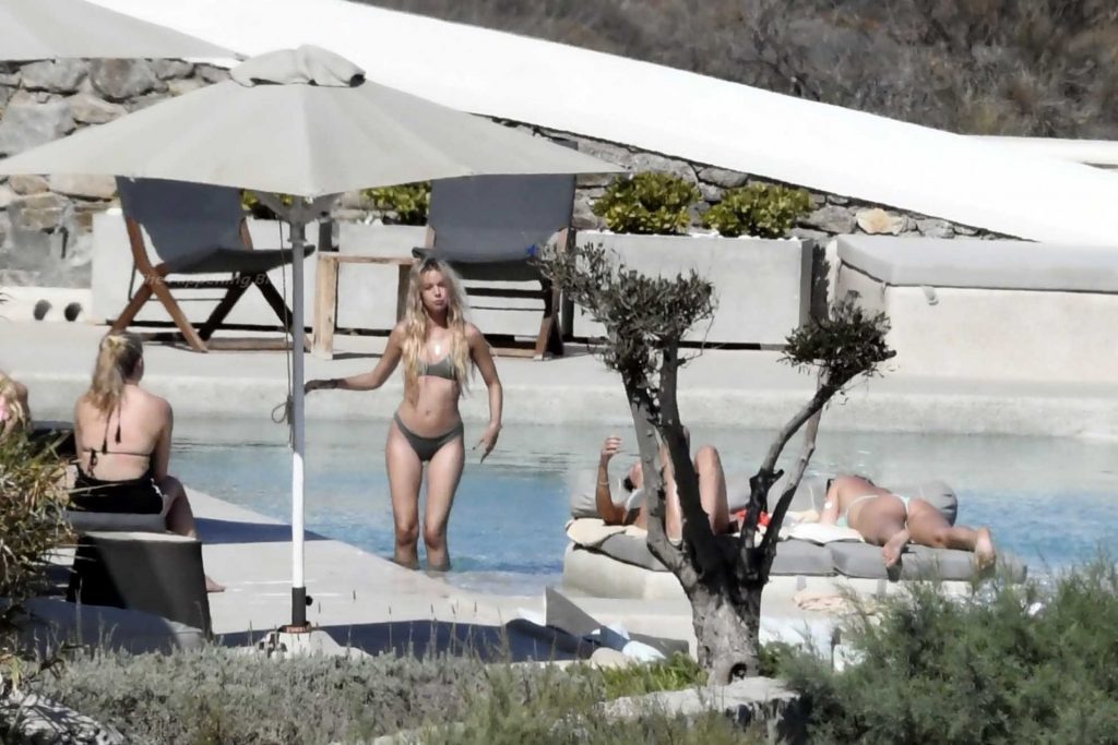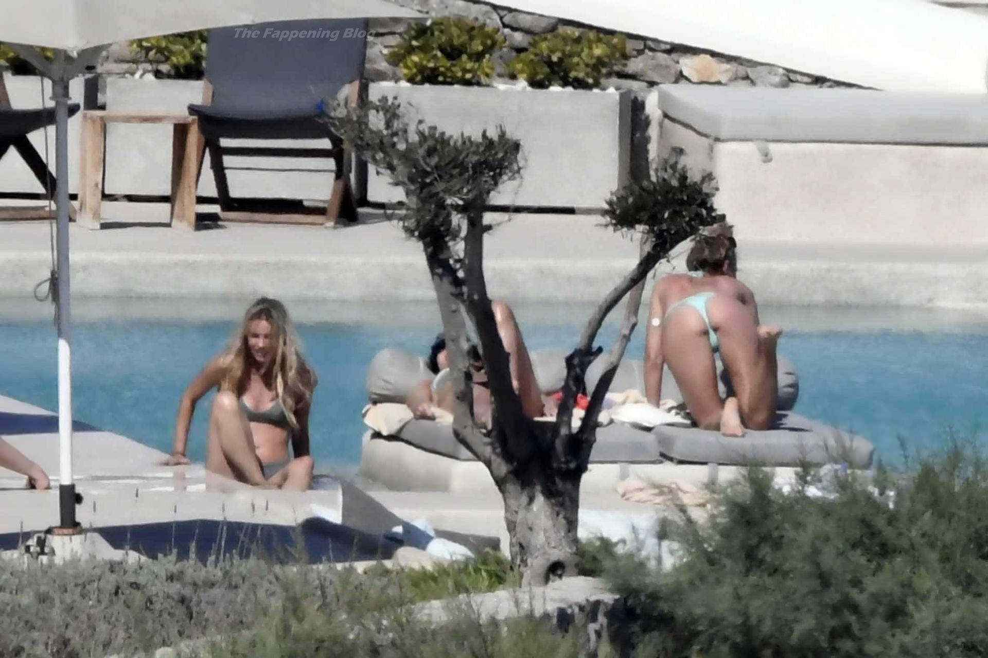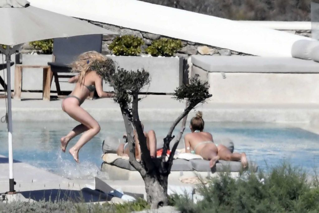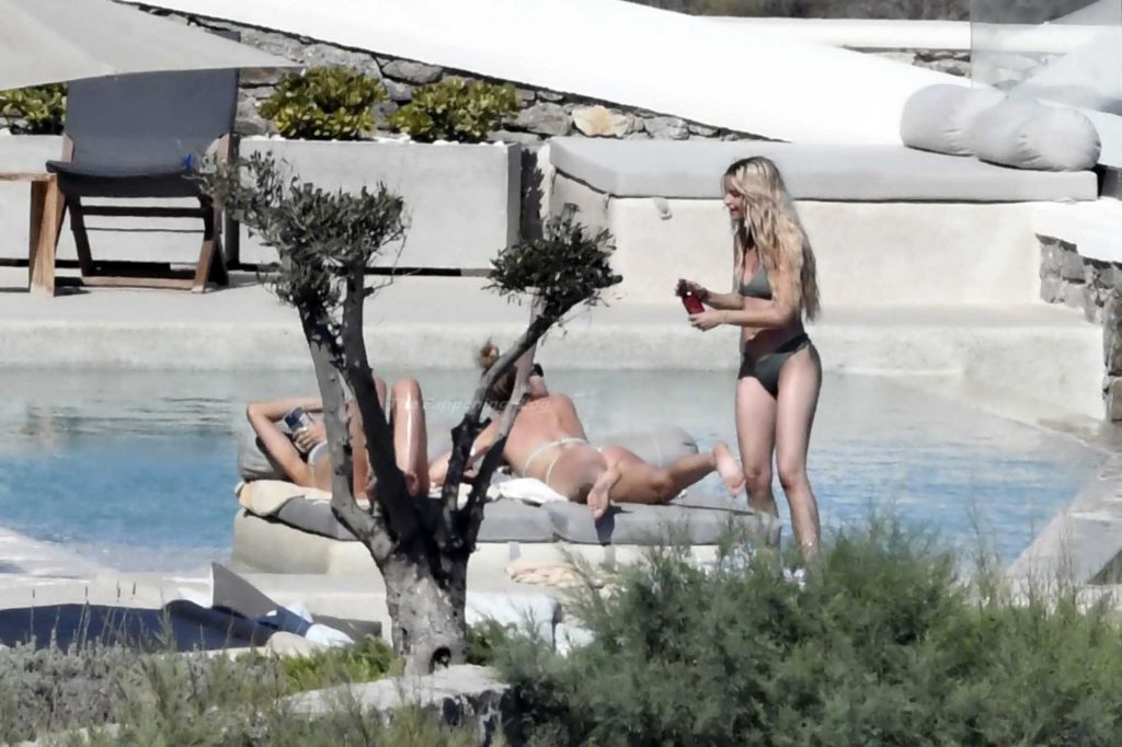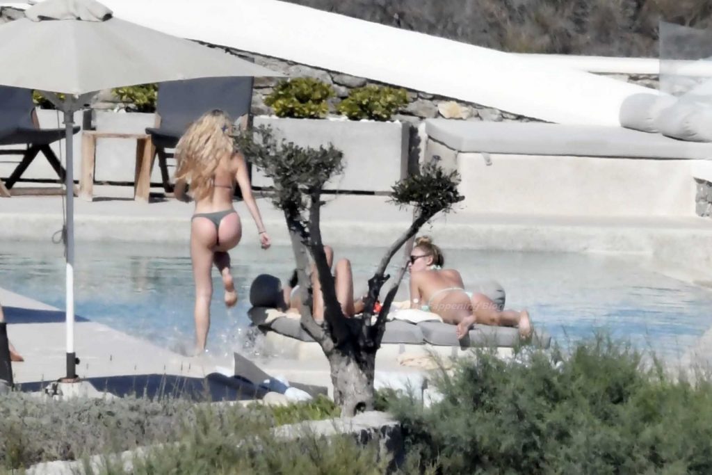 Les mannequins Roxy Horner, petite amie de l’acteur Jack Peter Benedict Whitehall, Sophie Longford et Sarah Elizabeth Lovegrove profitent de l’été grec au bord de la piscine, 16/08/2021.