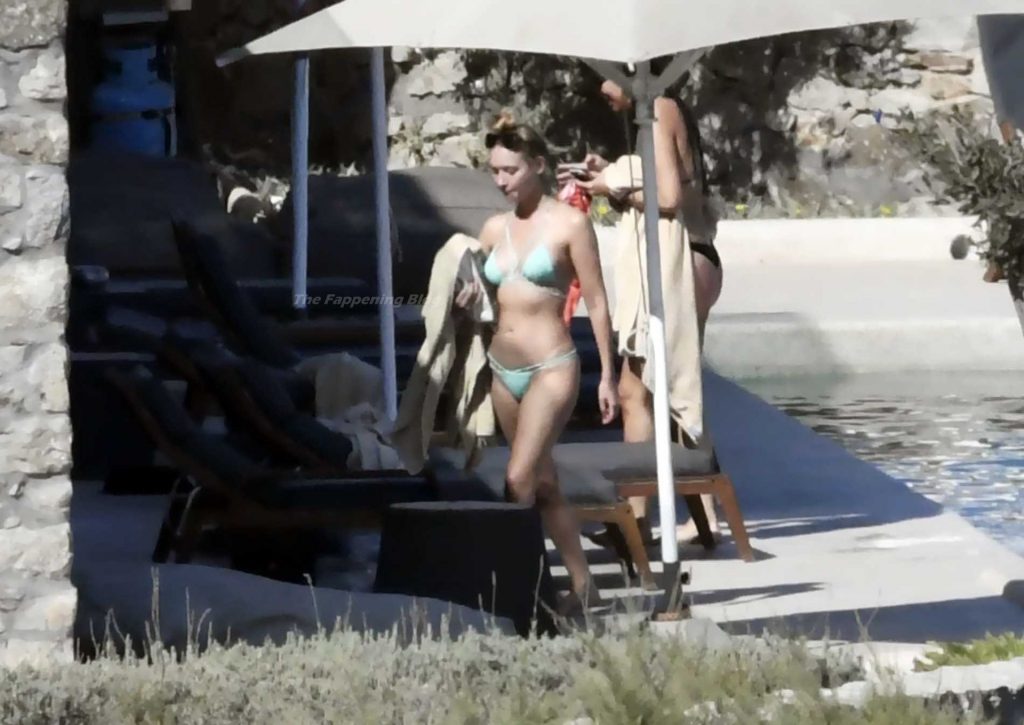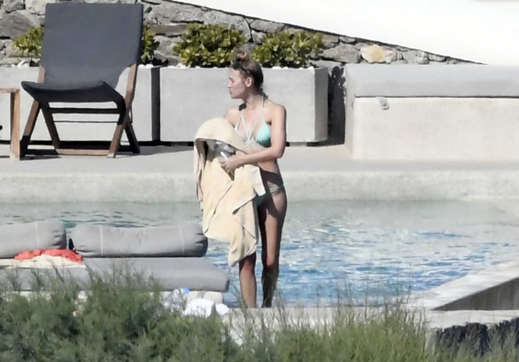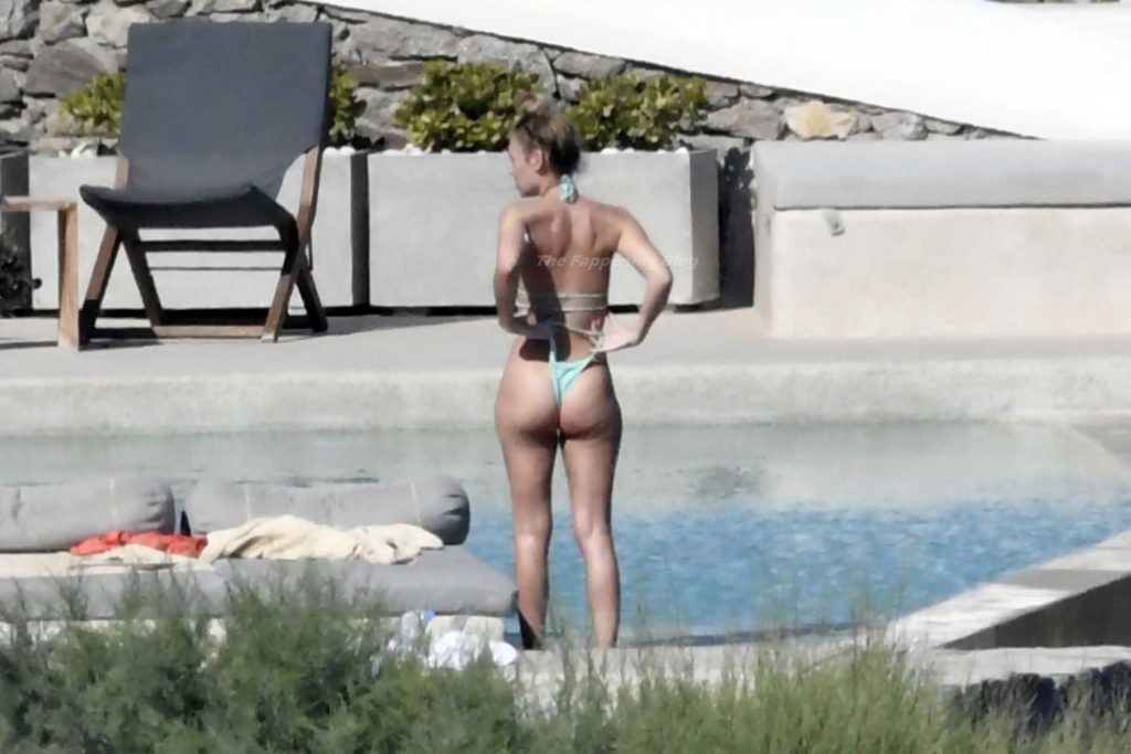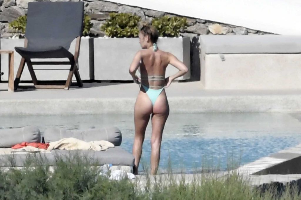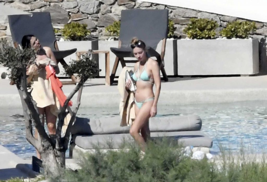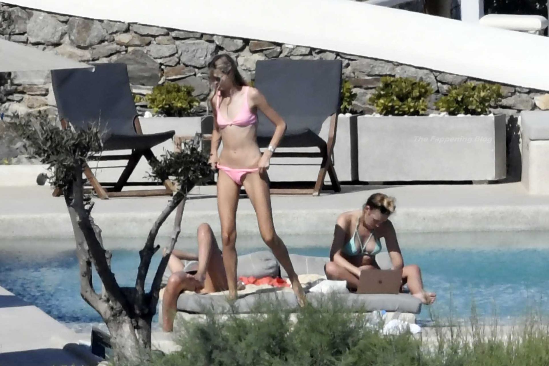 Les mannequins Roxy Horner, petite amie de l’acteur Jack Peter Benedict Whitehall, Sophie Longford et Sarah Elizabeth Lovegrove profitent de l’été grec au bord de la piscine, 16/08/2021.