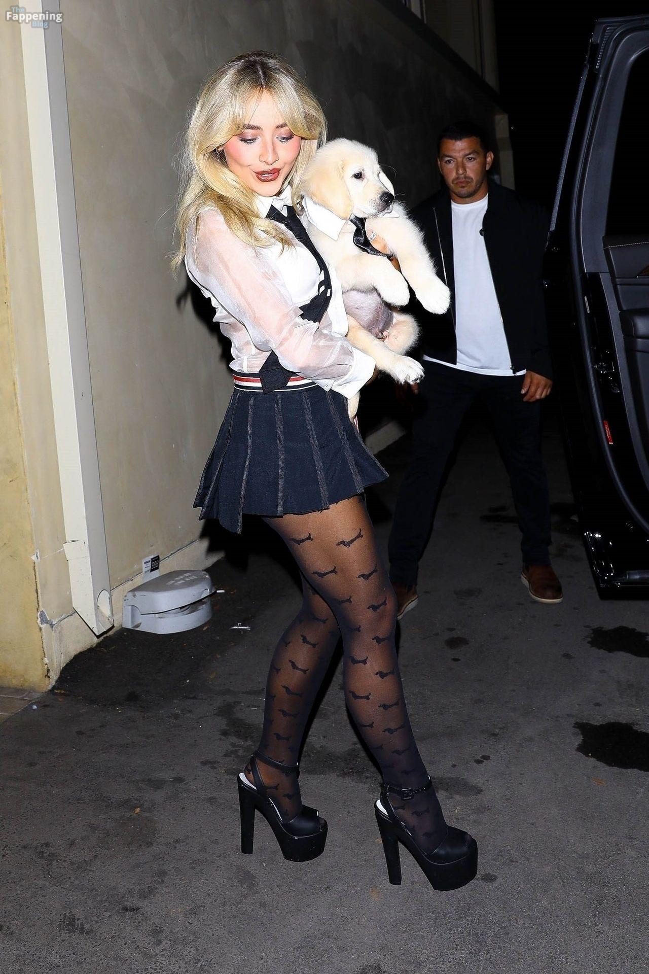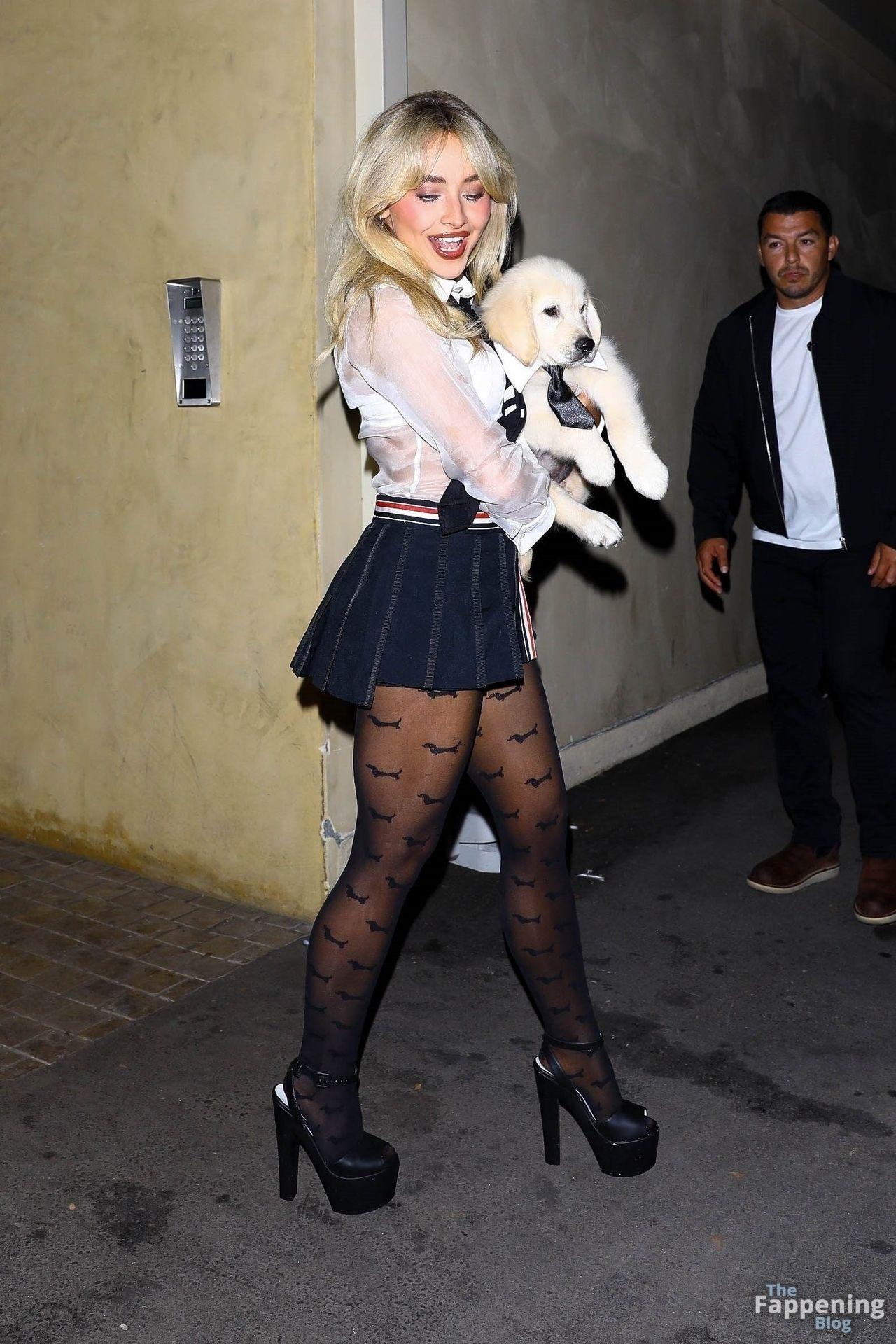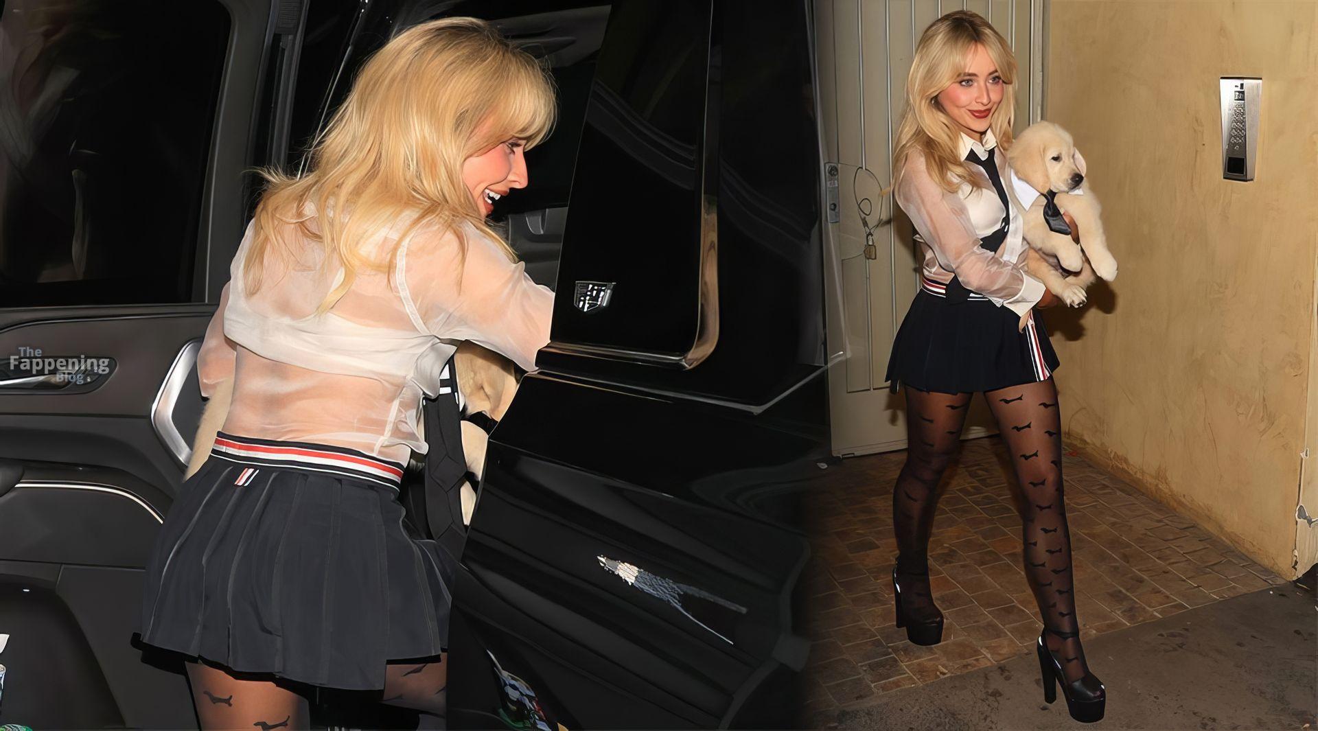 Découvrez Sabrina Carpenter à Los Angeles avec une blouse transparente et une mini-jupe, exhibant ses jambes et ses fesses lors de la sortie de l’album d’Alba.