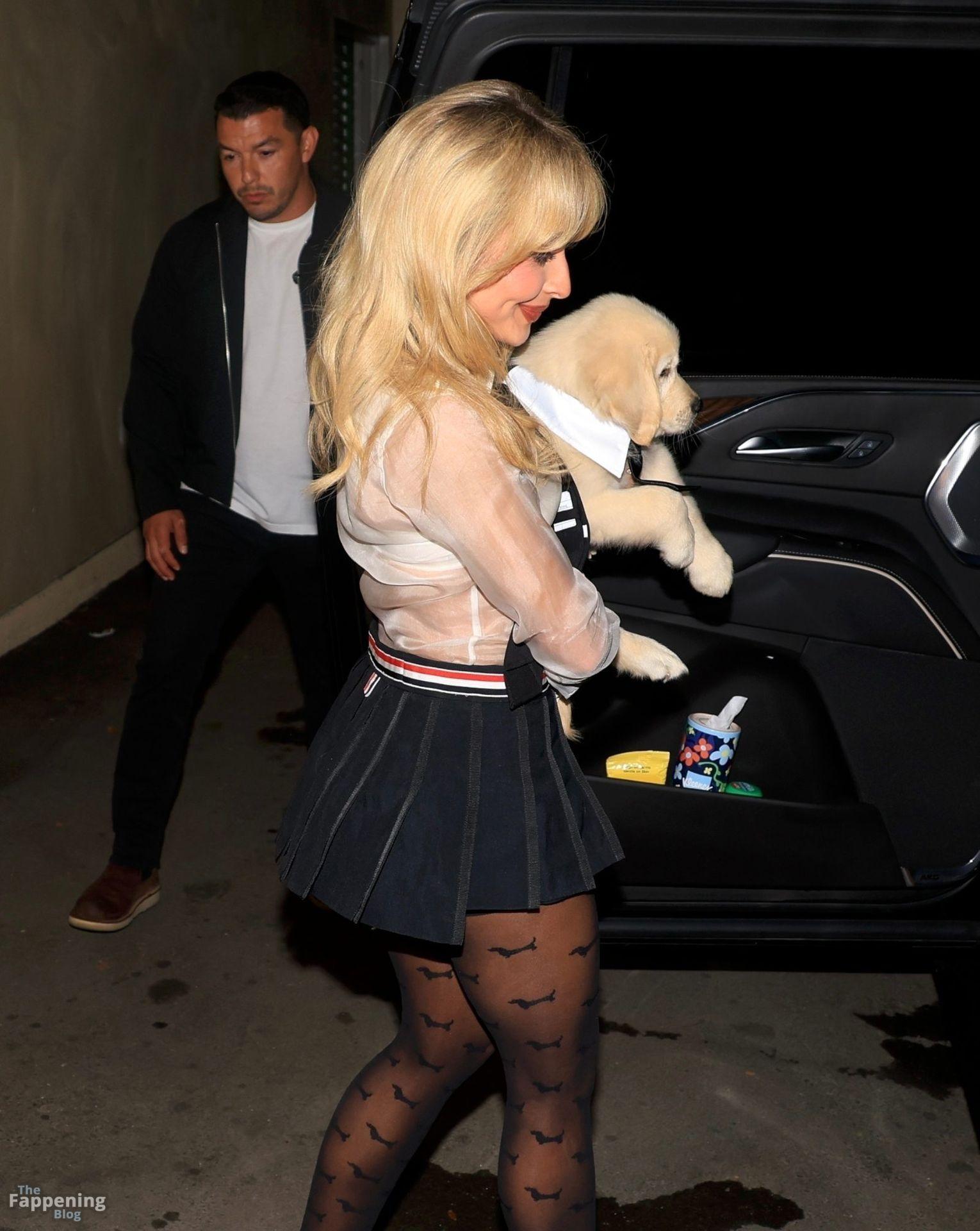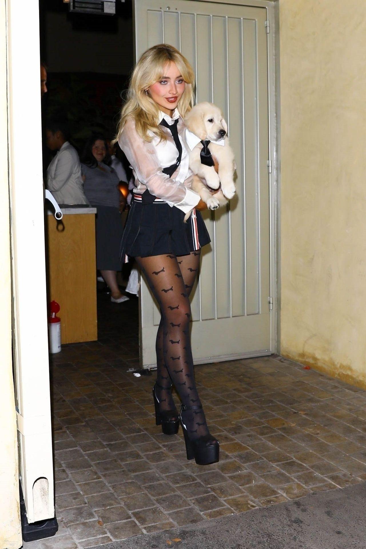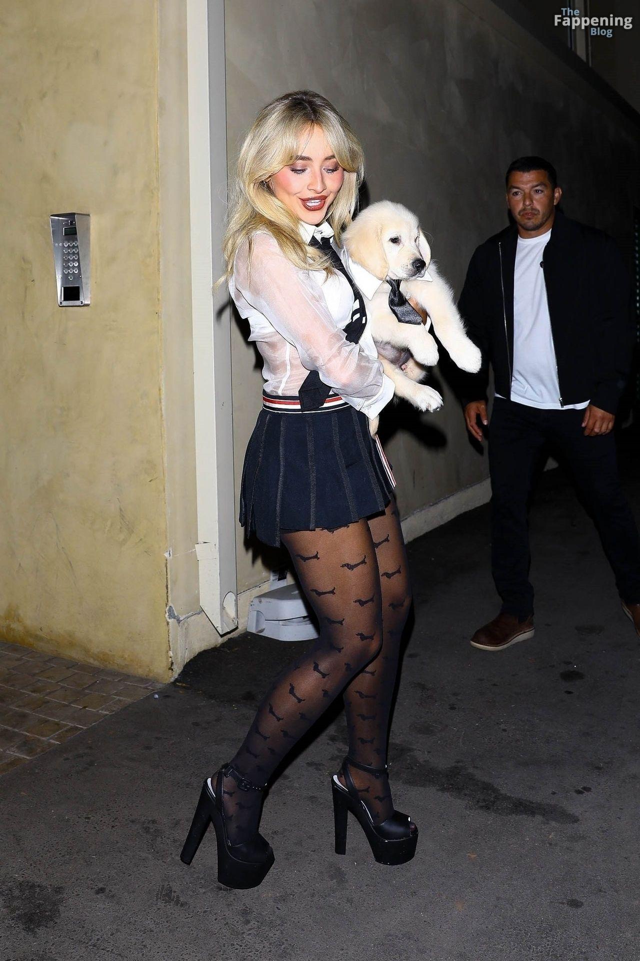Découvrez Sabrina Carpenter à Los Angeles avec une blouse transparente et une mini-jupe, exhibant ses jambes et ses fesses lors de la sortie de l’album d’Alba.