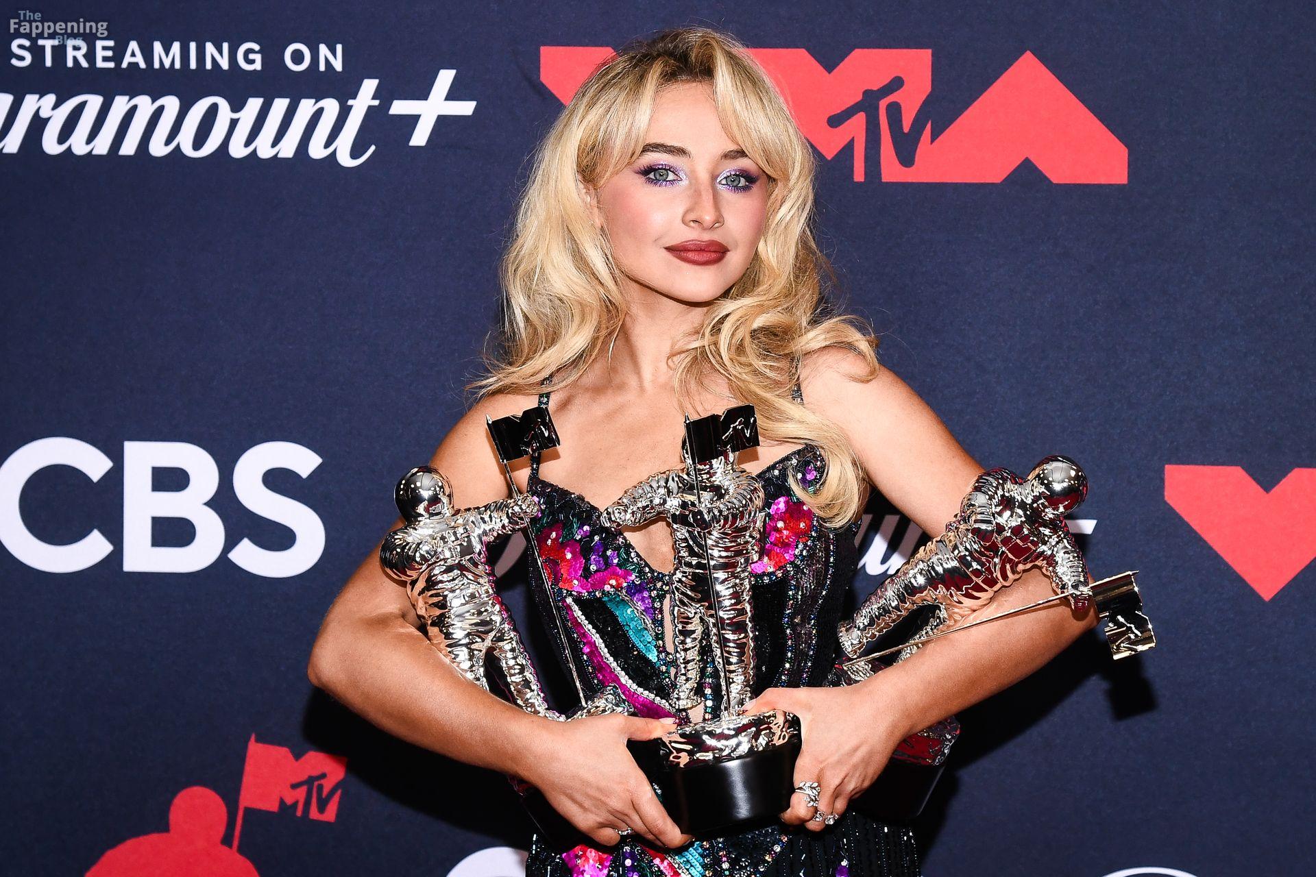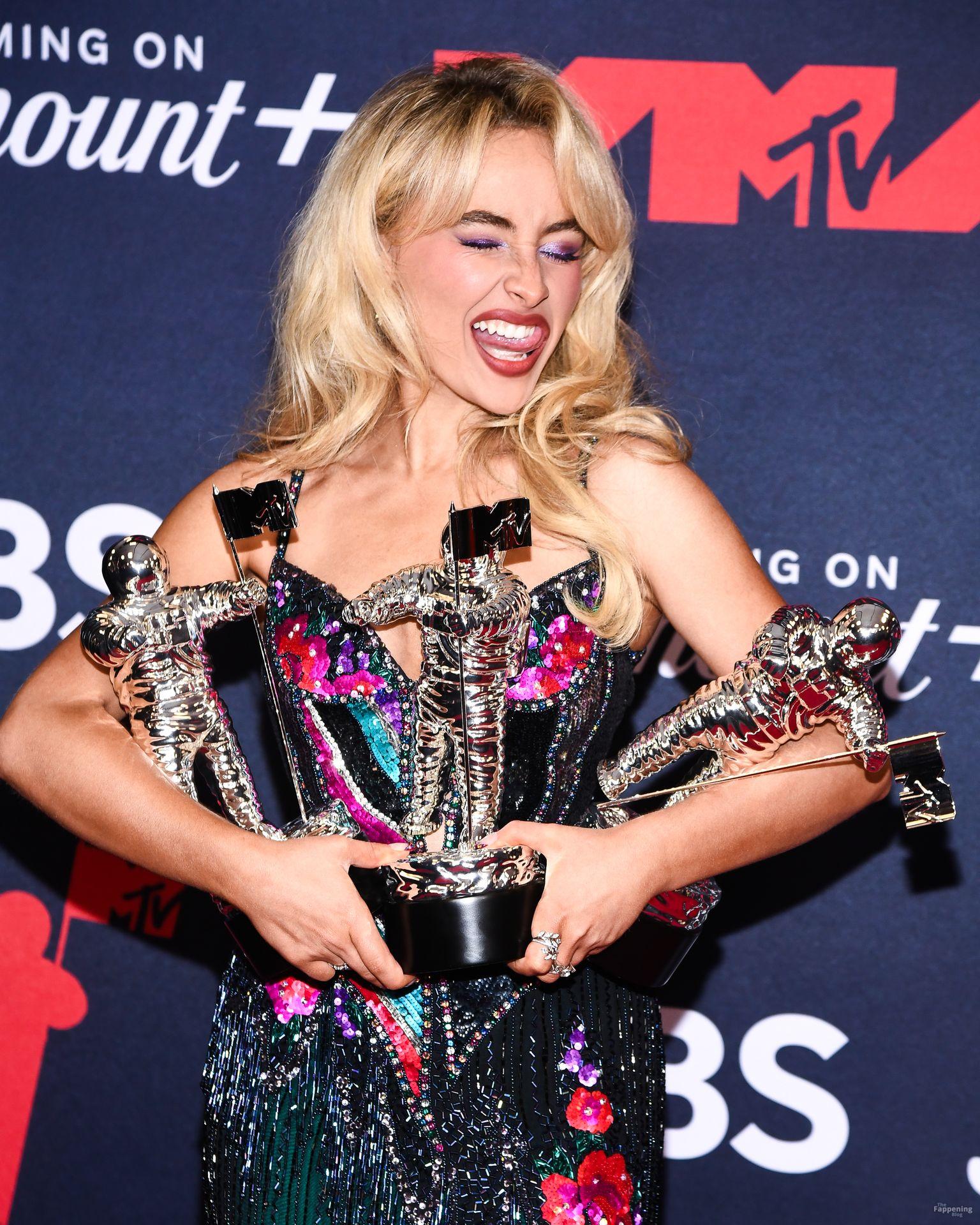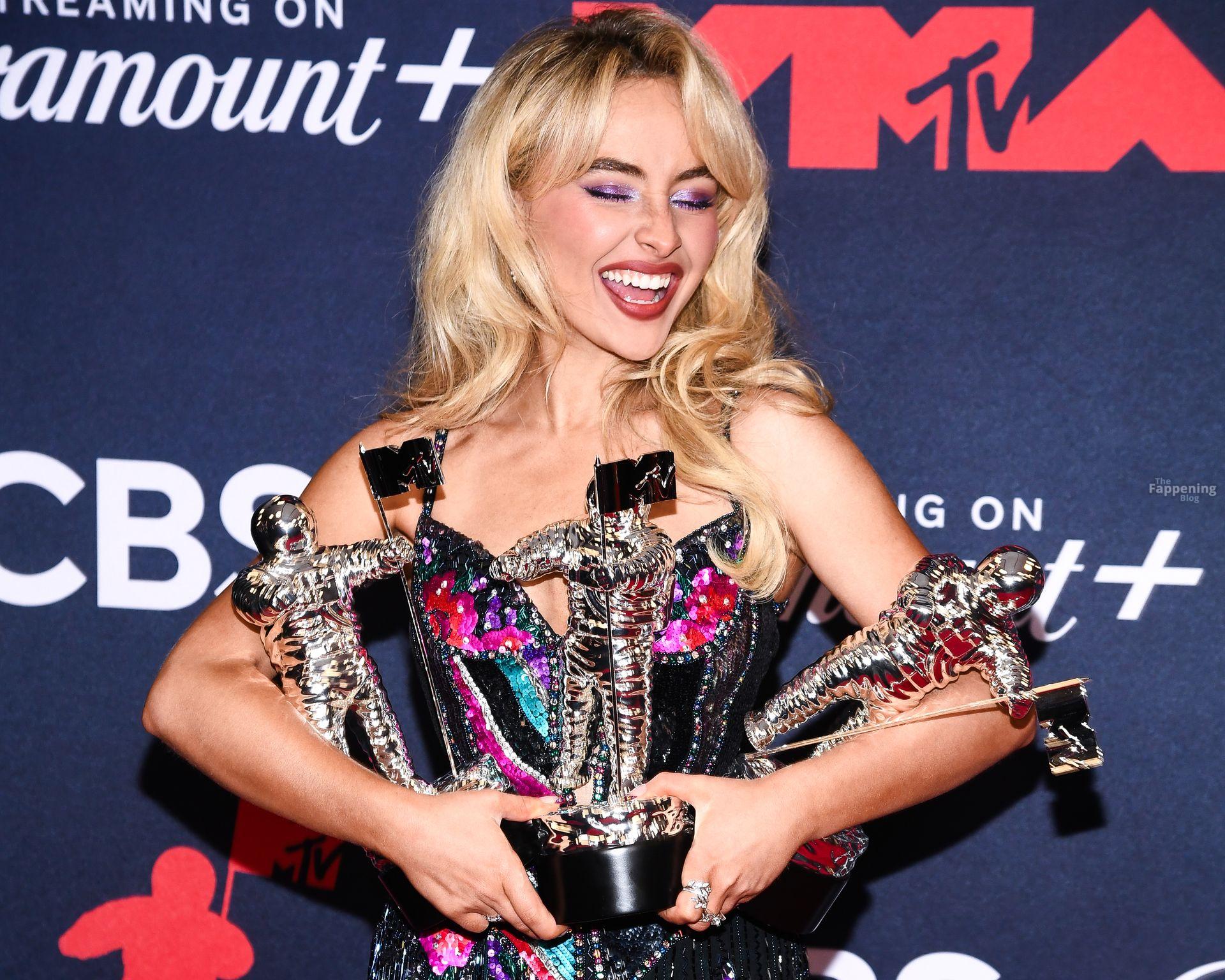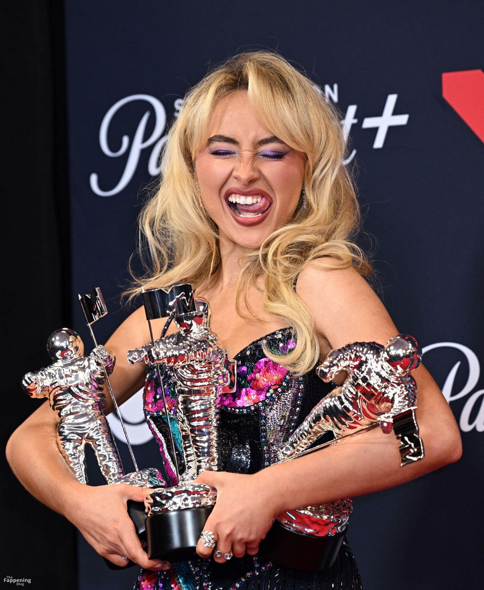La chanteuse, auteure-compositrice et actrice américaine Sabrina Carpenter, qui a remporté les prix du meilleur artiste pop, des meilleurs effets visuels, de la meilleure cinématographie, du meilleur montage et de la meilleure réalisation pour Manchild, ainsi que du meilleur album pour Short n’ Sweet, posait dans la salle de presse des MTV Video Music Awards 2025 à l’UBS Arena.