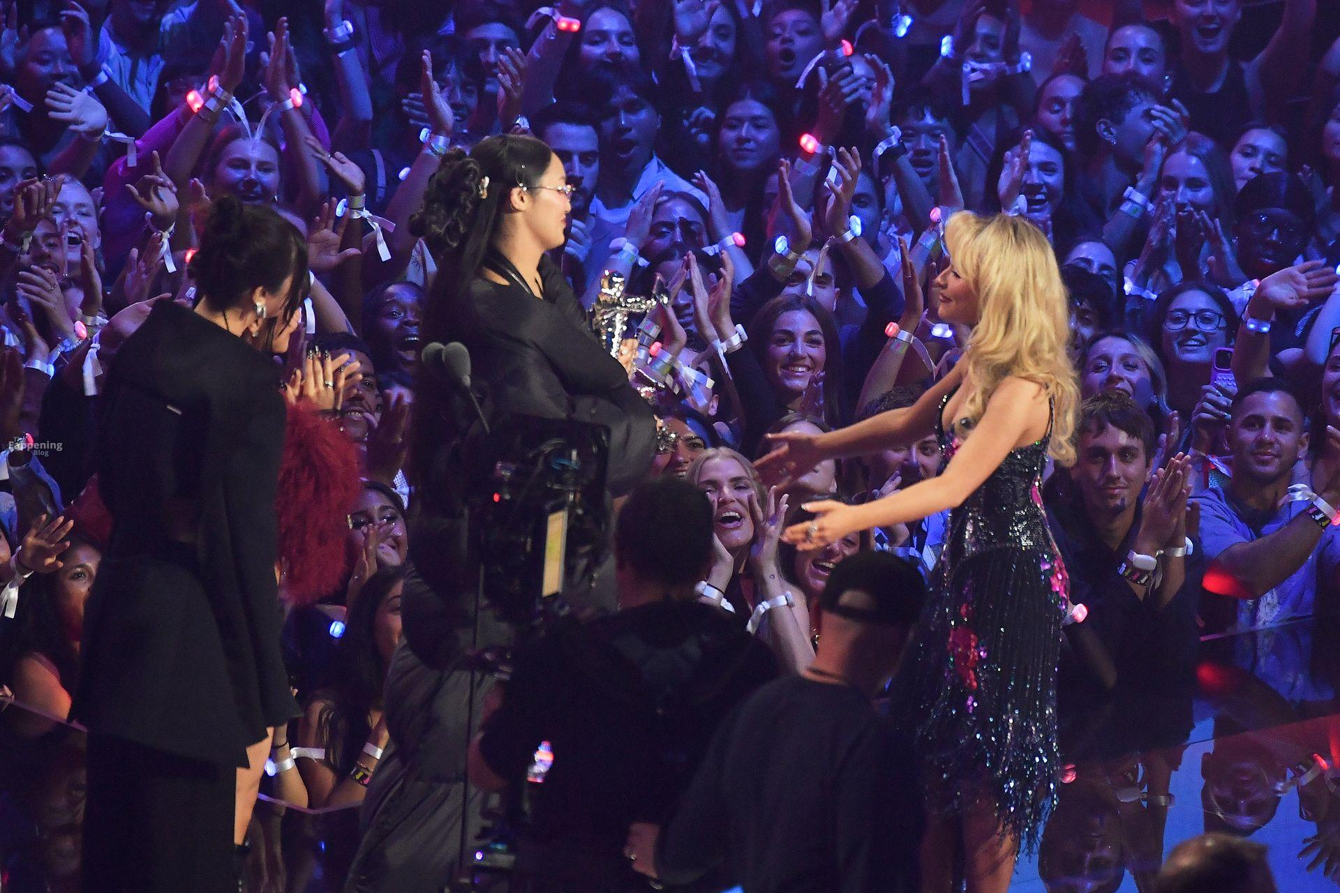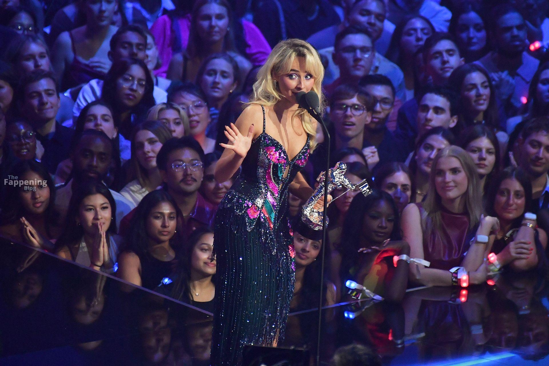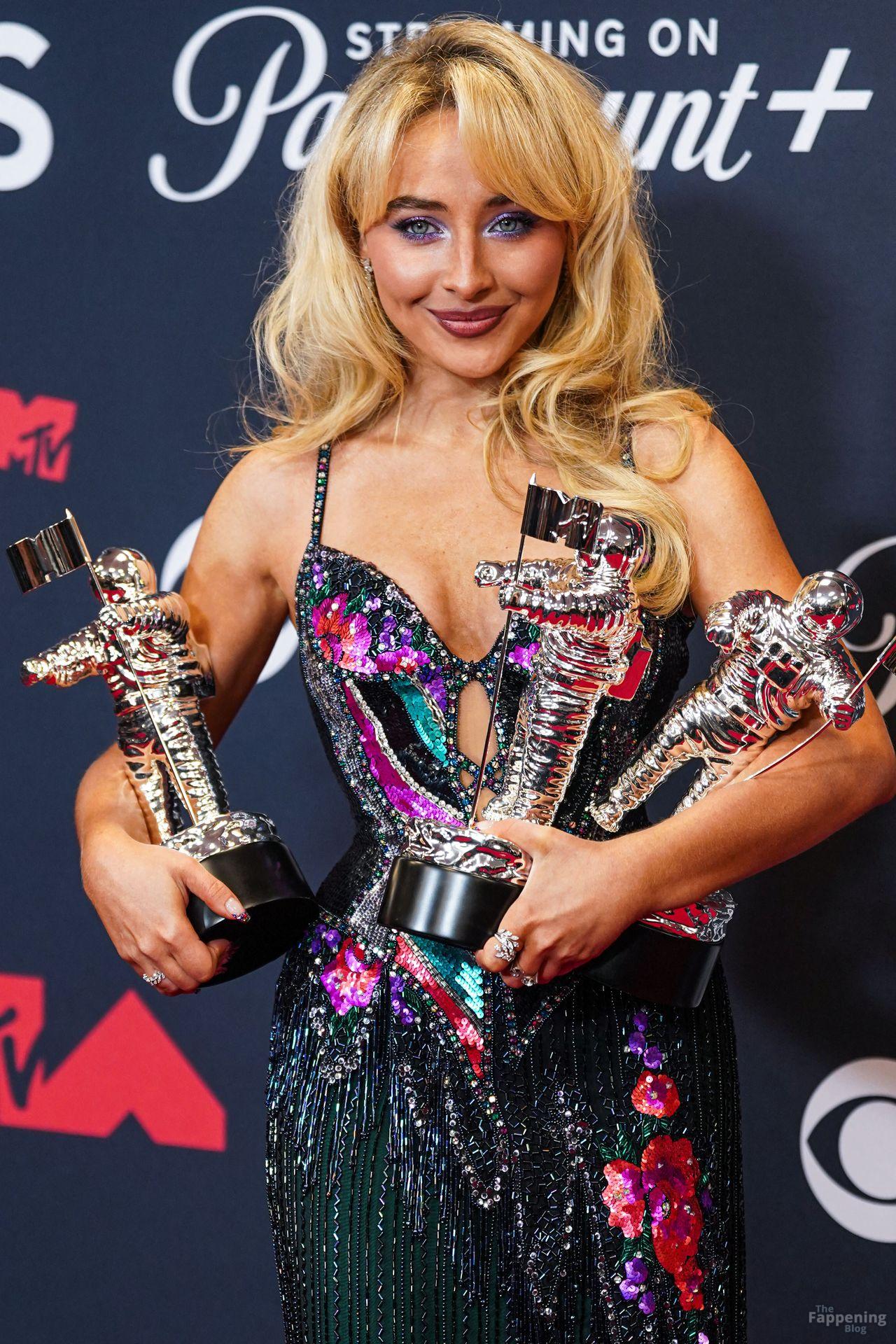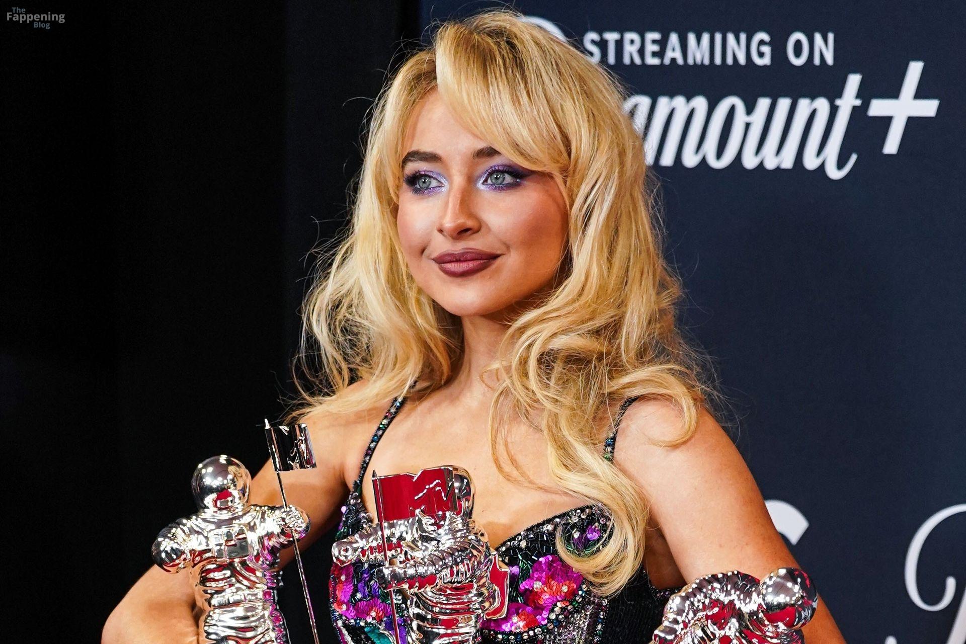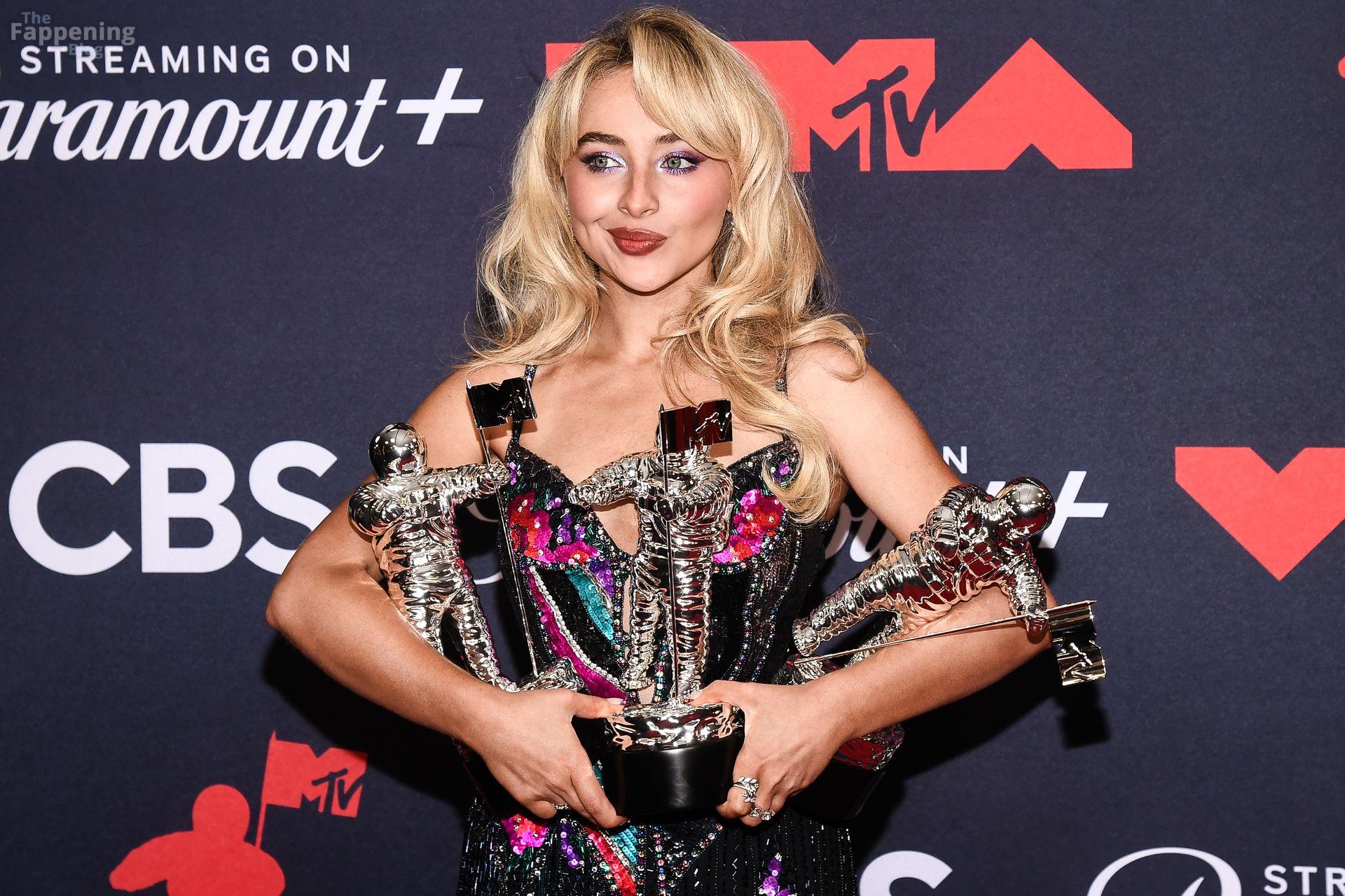 La chanteuse, auteure-compositrice et actrice américaine Sabrina Carpenter, qui a remporté les prix du meilleur artiste pop, des meilleurs effets visuels, de la meilleure cinématographie, du meilleur montage et de la meilleure réalisation pour Manchild, ainsi que du meilleur album pour Short n’ Sweet, posait dans la salle de presse des MTV Video Music Awards 2025 à l’UBS Arena.