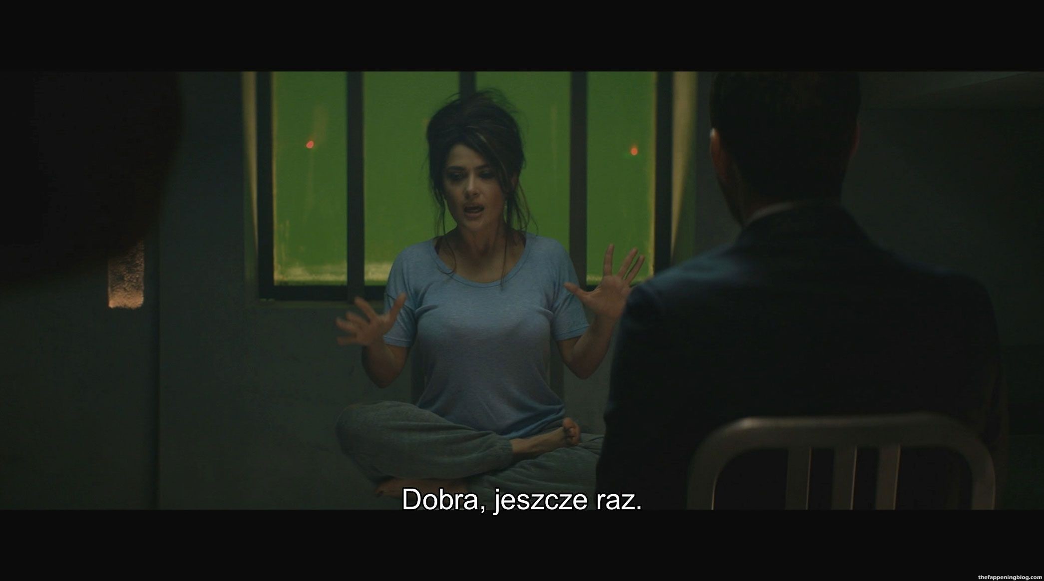 Before leaning down to embrace someone, Salma Hayek has a cast removed from her body to show her breasts.