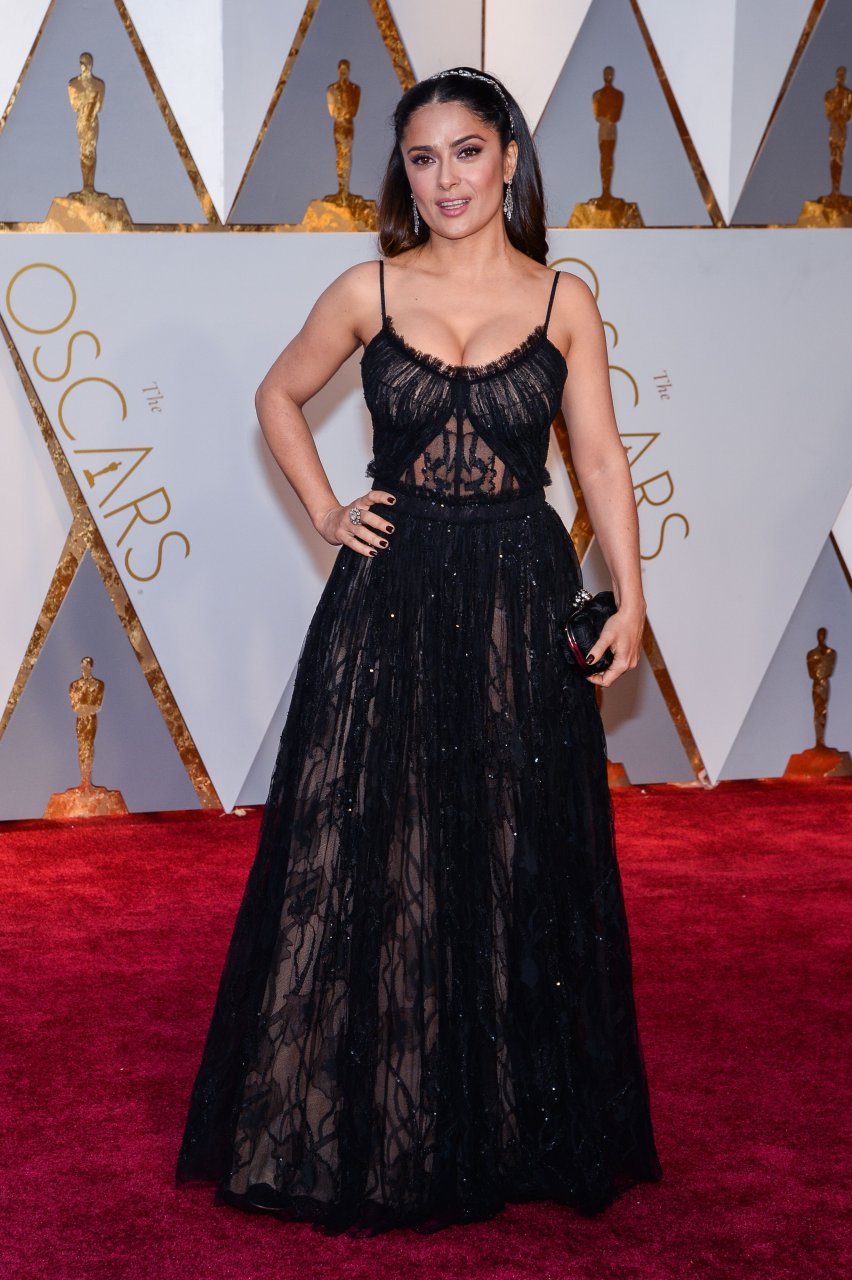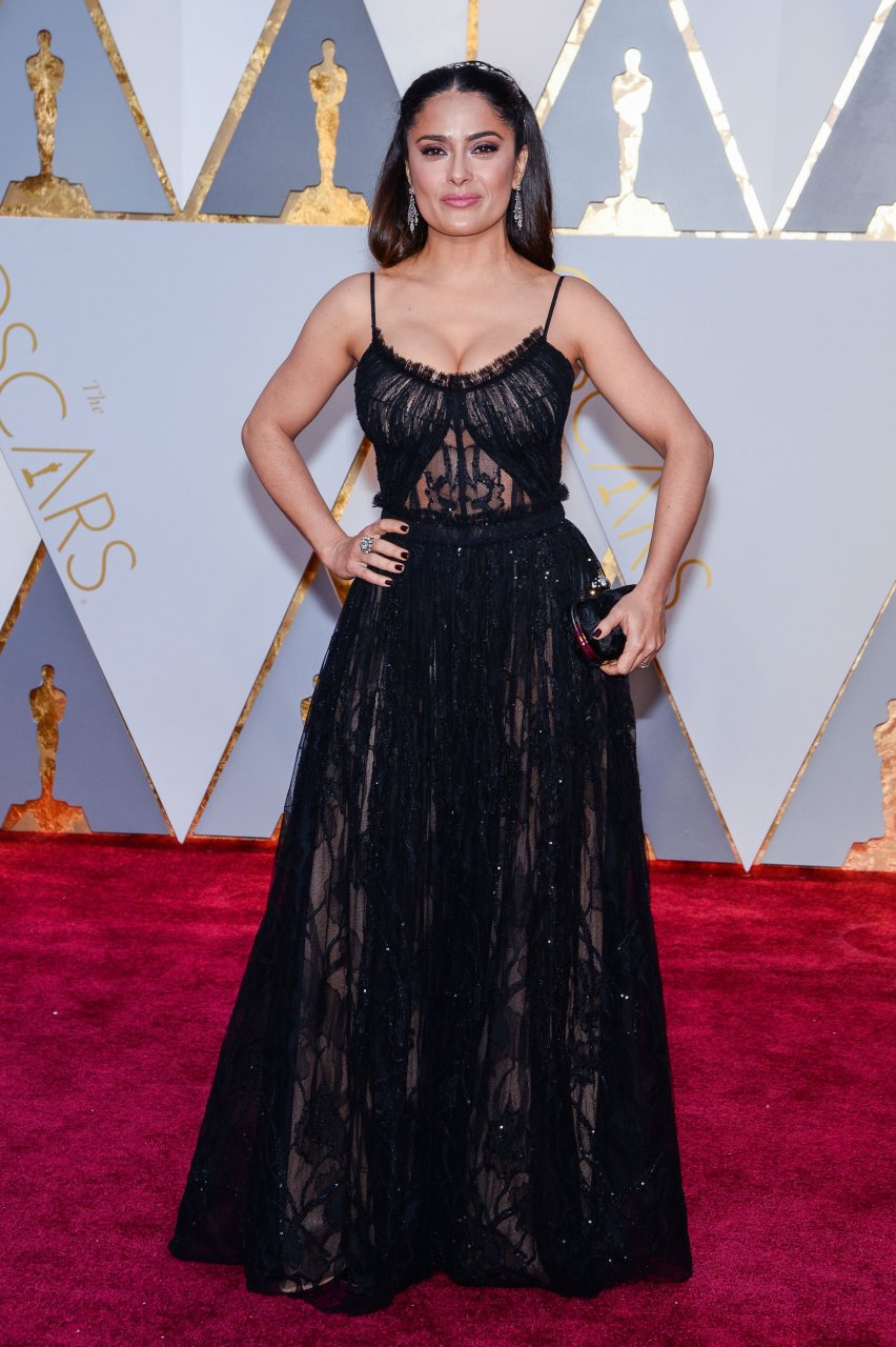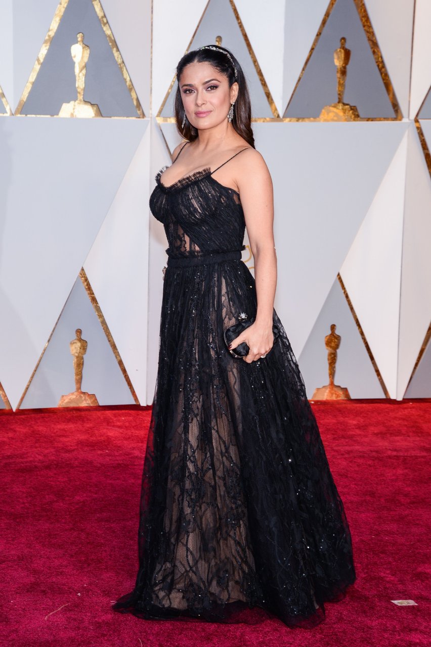 Salma Hayek porte une robe noire sexy transparente lors de la 89e cérémonie annuelle des Oscars à Hollywood, le 26/02/17. Salma Hayek Pinault est une actrice mexicaine/américaine (Frida (2002)), réalisatrice et productrice. Âge : 50 ans (née le 2 septembre 1966).