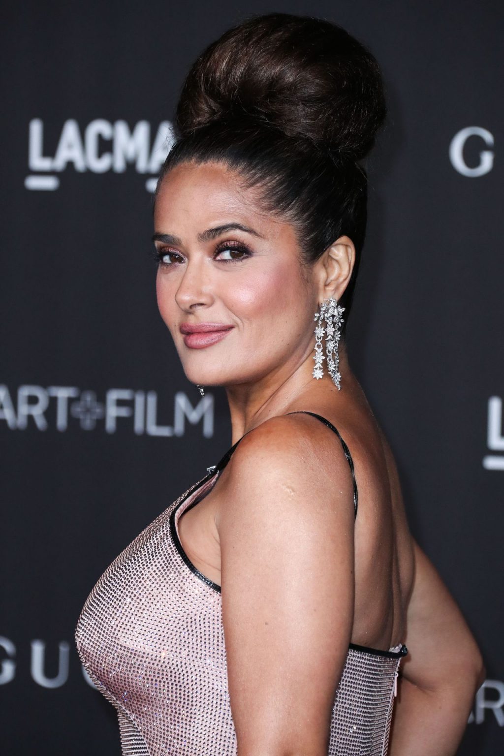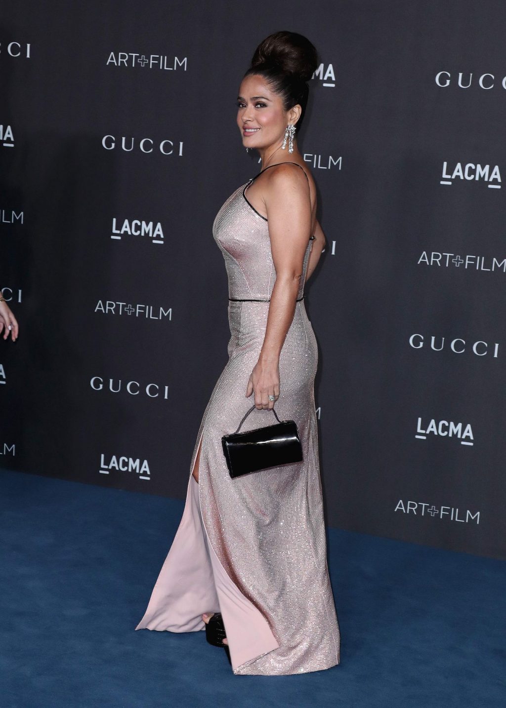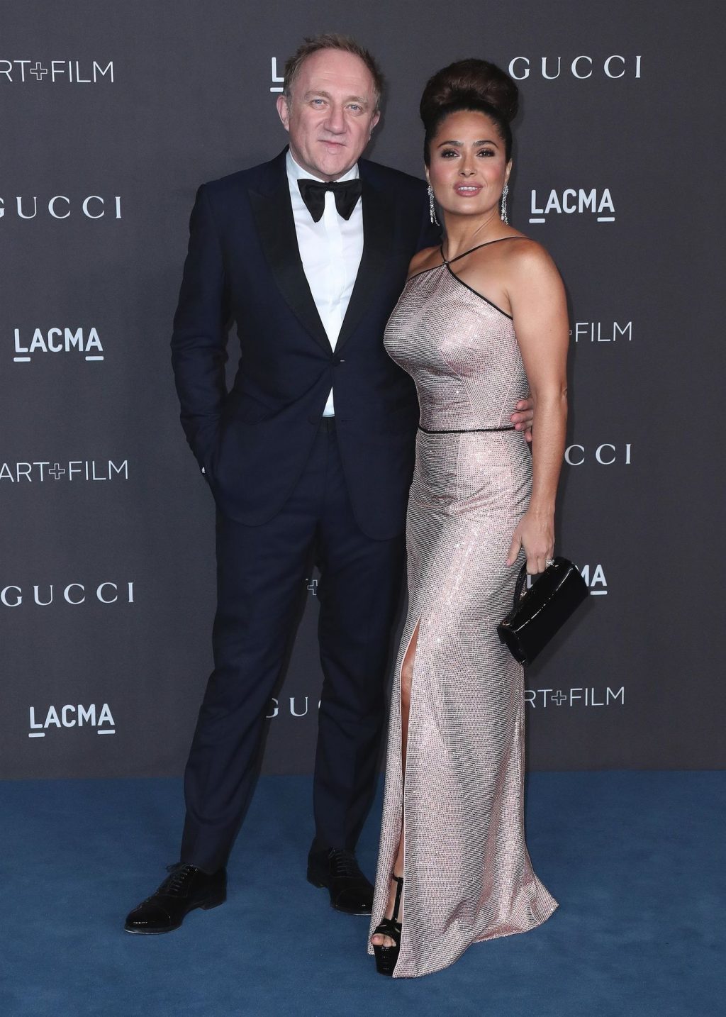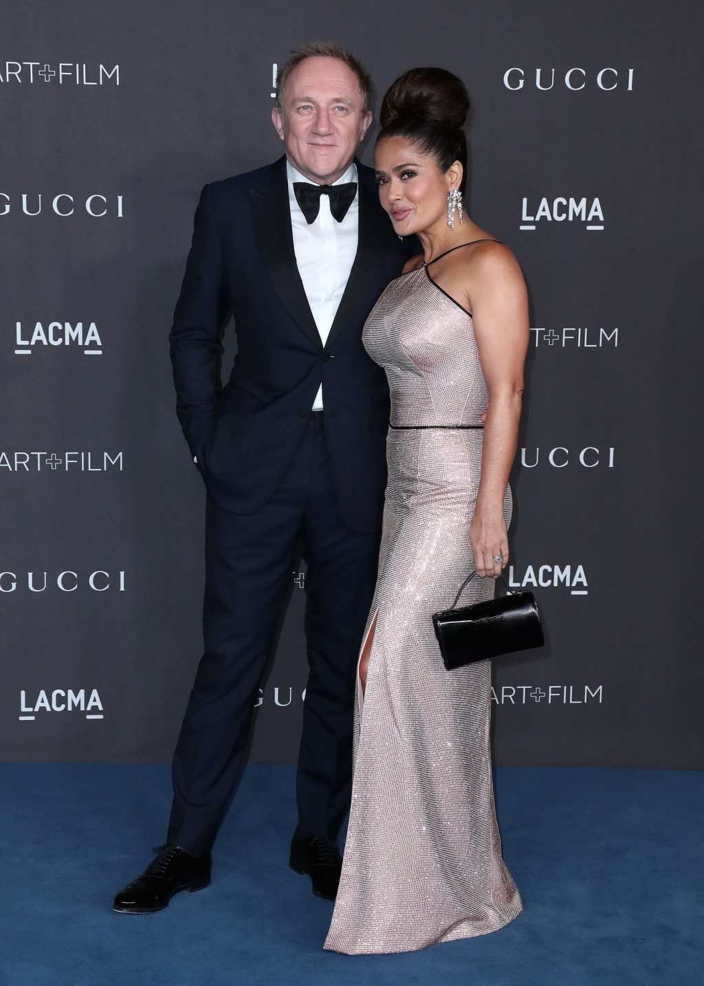 L’actrice pulpeuse Salma Hayek Pinault portant Gucci arrive au Gala Art + Film LACMA 2019 qui s’est tenu au Los Angeles County Museum of Art le 2 novembre 2019 à Los Angeles.