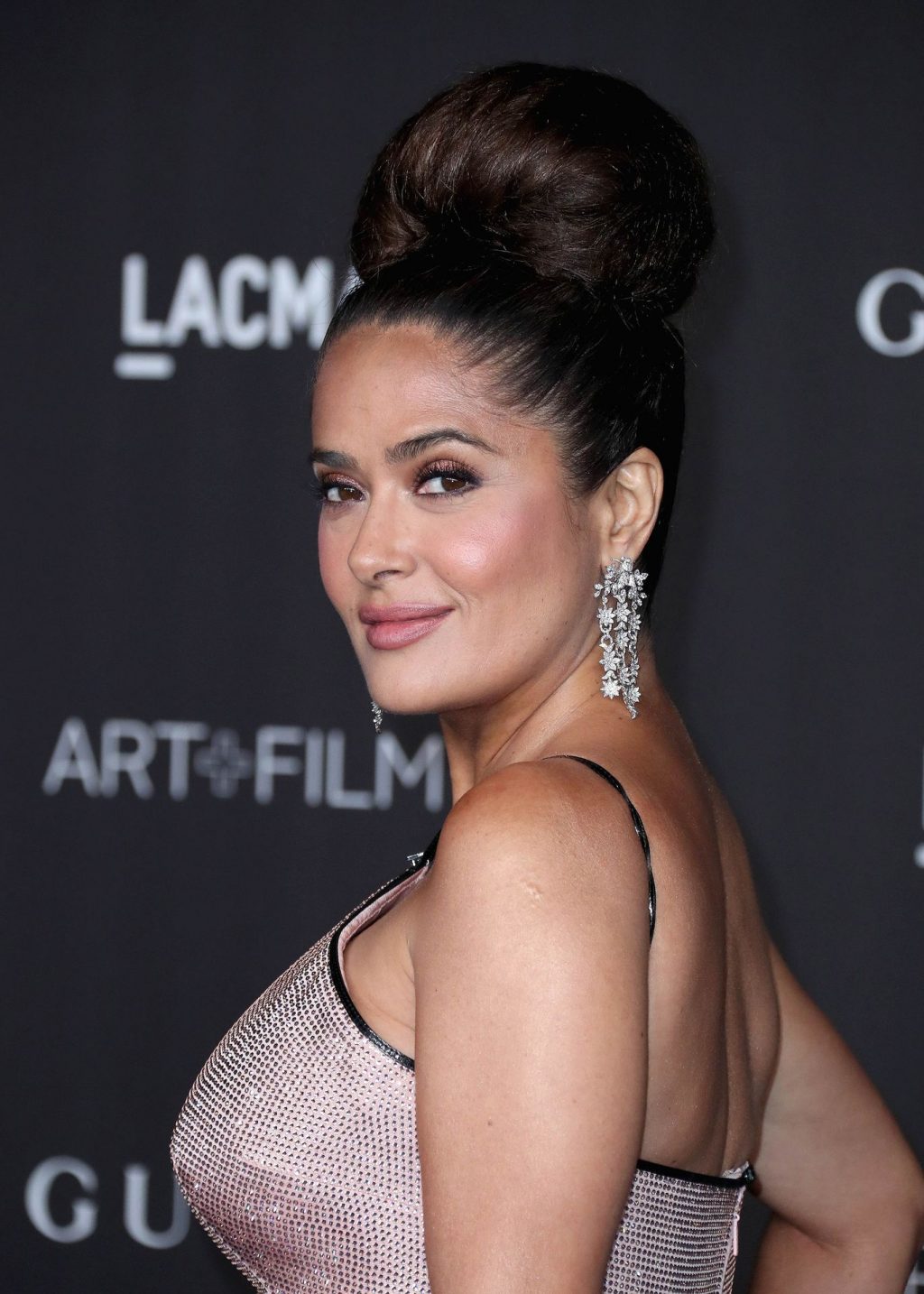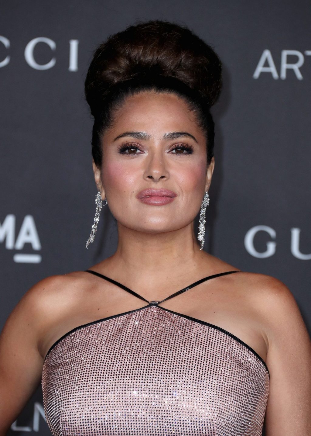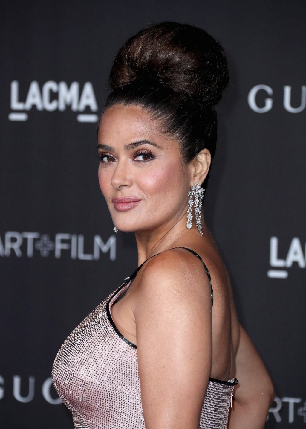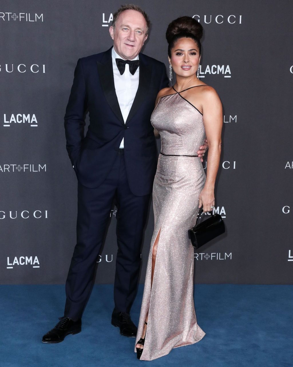 L’actrice pulpeuse Salma Hayek Pinault portant Gucci arrive au Gala Art + Film LACMA 2019 qui s’est tenu au Los Angeles County Museum of Art le 2 novembre 2019 à Los Angeles.