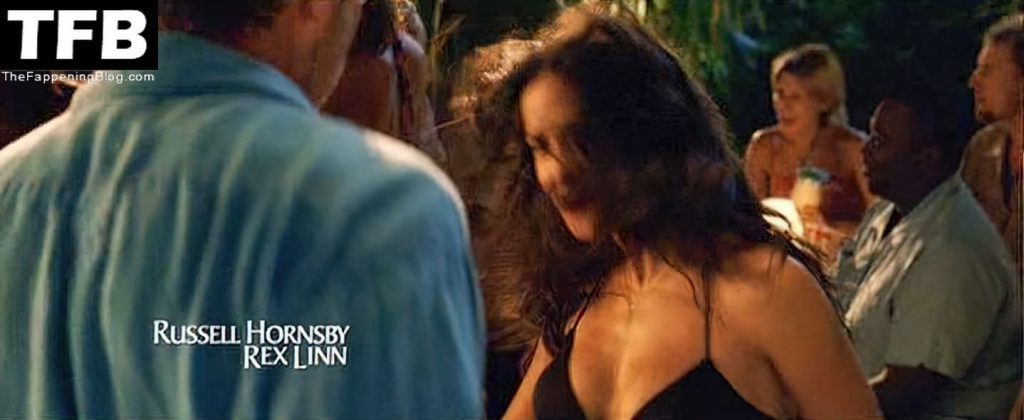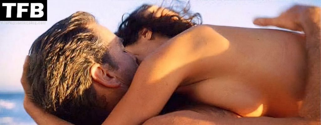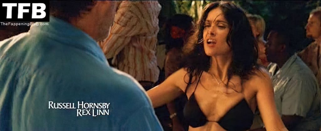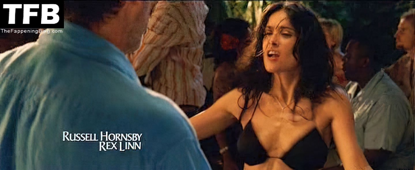 Salma Hayek est allongée nue sur un homme sur la plage, son sein gauche pressé contre sa poitrine alors qu’ils s’embrassent. Nous voyons ensuite Salma danser en haut de bikini noir, ses seins rebondissant alors qu’elle les secoue.