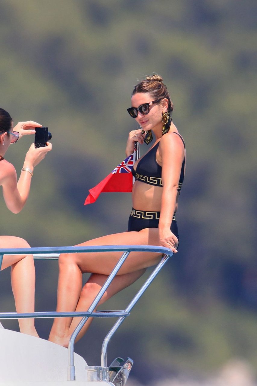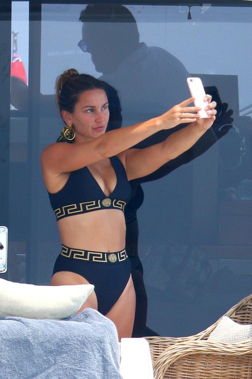 Sam Faiers a l’air sensationnelle en exhibant sa silhouette tonique dans un bikini noir Versace plongeant lors d’un voyage de filles de luxe à Cannes, 19/07/2019.