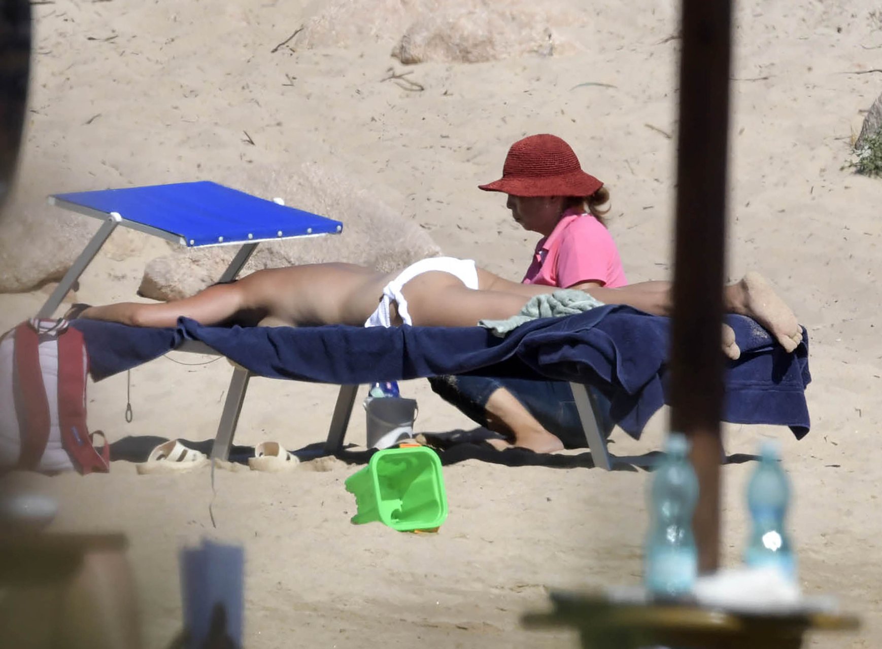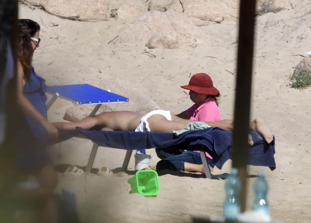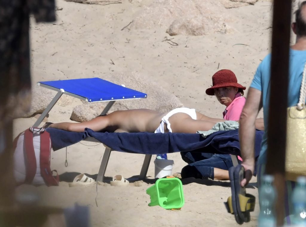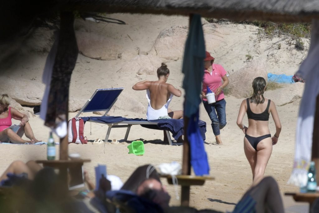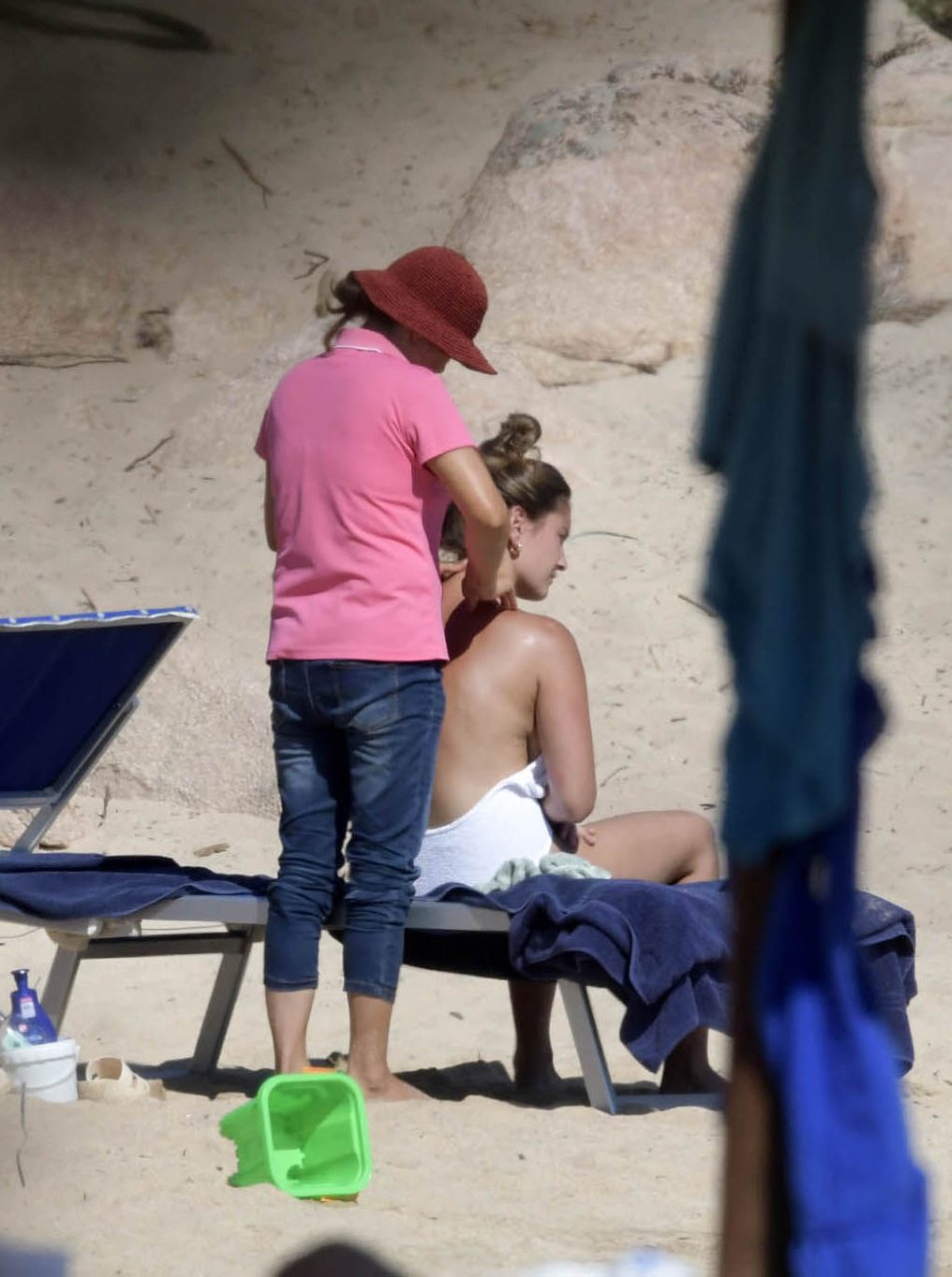 Le groupe est en vacances en famille sur l’île italienne ensoleillée de Sardaigne et séjourne à l’hôtel de luxe Cala di Volpe, 09/07/2018. Sam a exhibé sa silhouette de plage en portant un bikini multicolore alors qu’elle se baignait dans la mer.