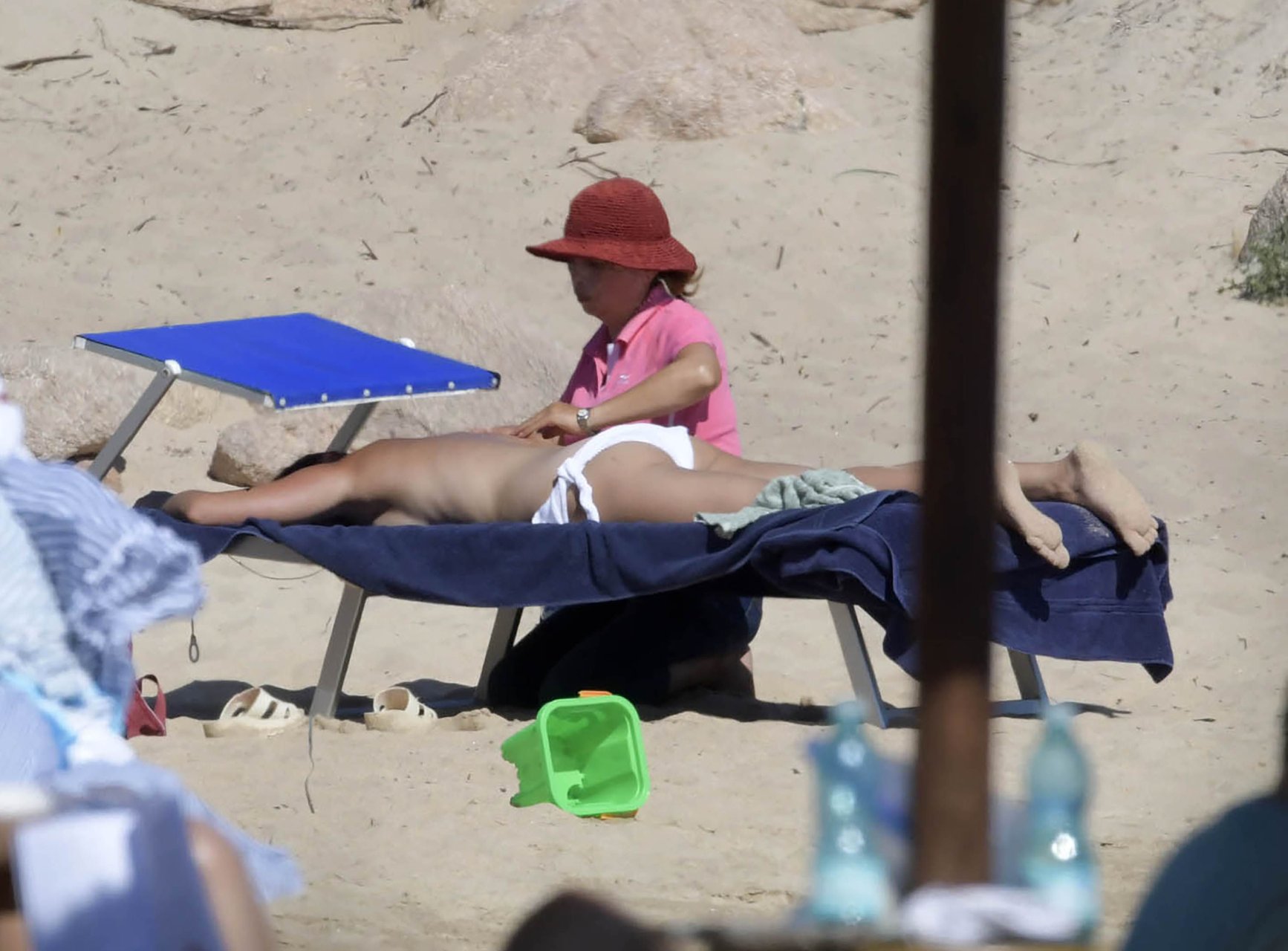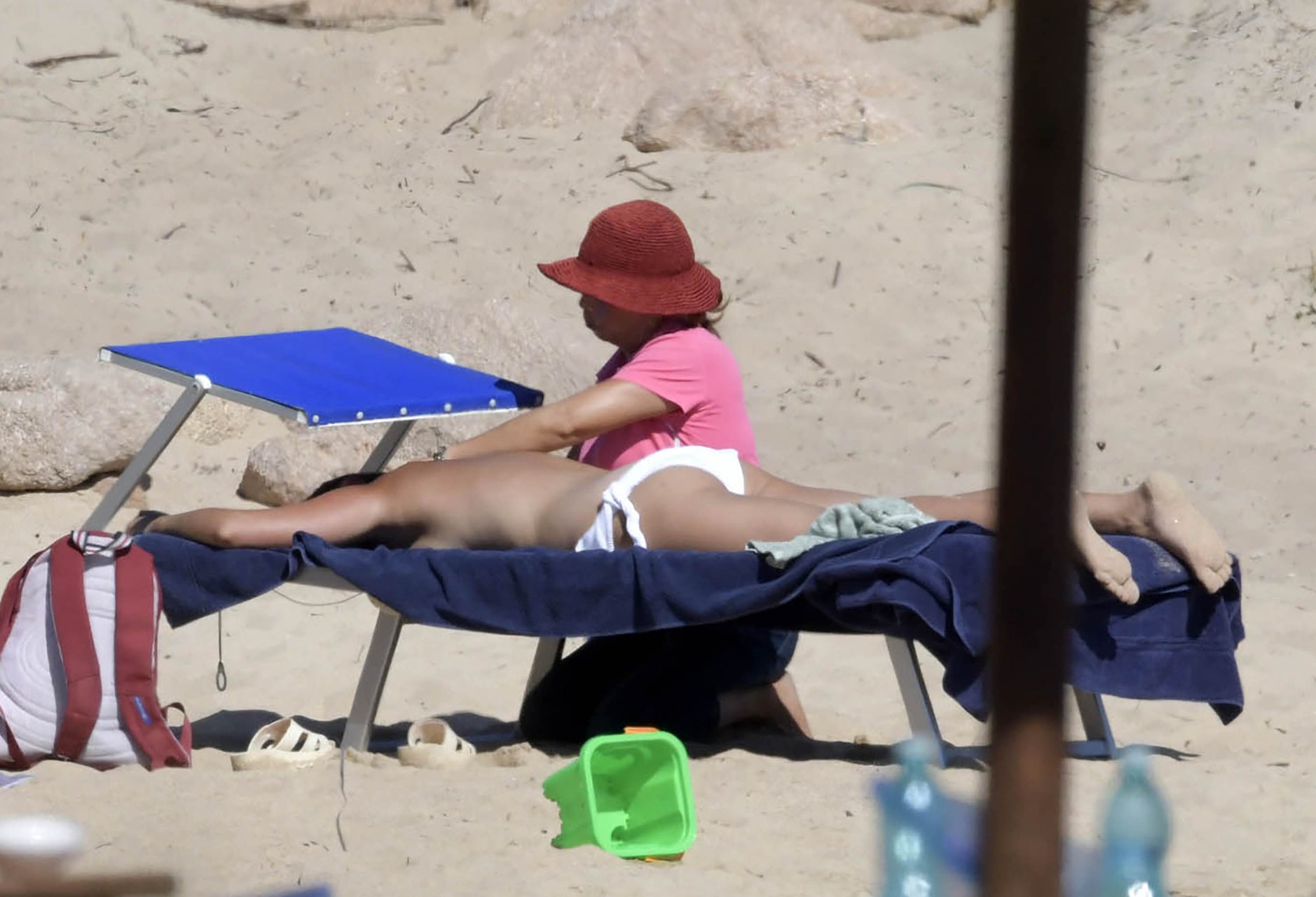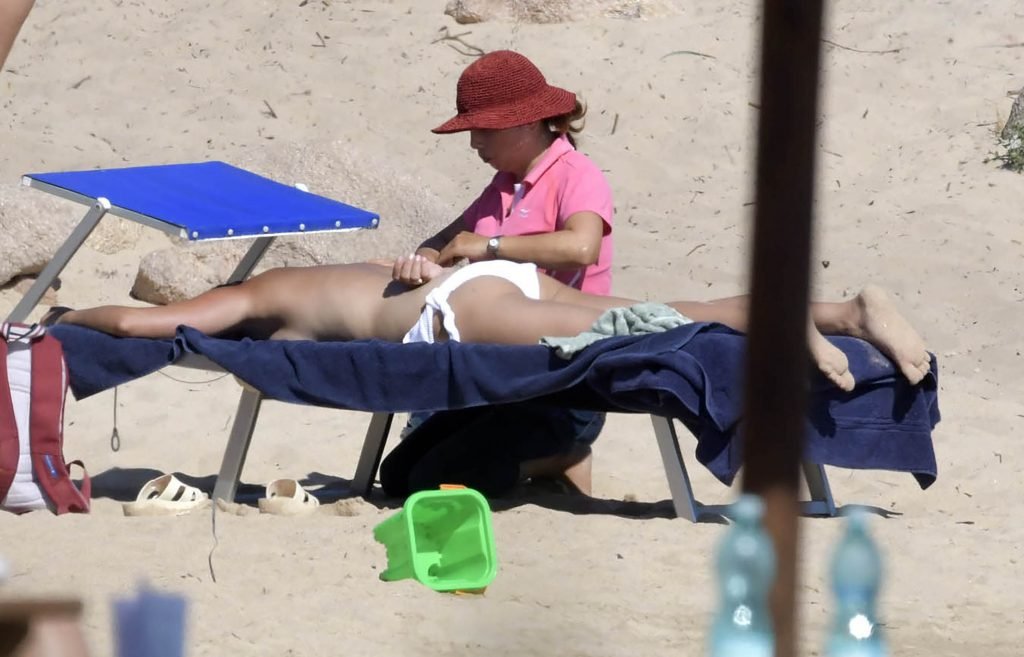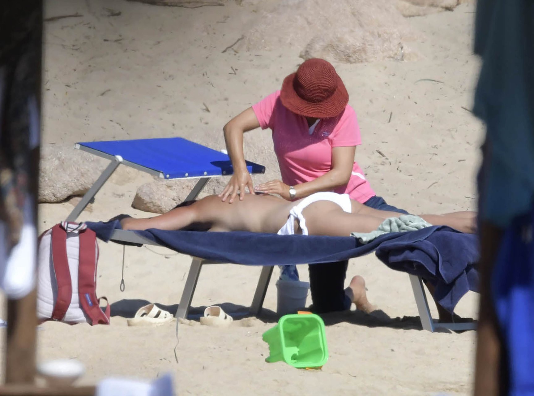 Le groupe est en vacances en famille sur l’île italienne ensoleillée de Sardaigne et séjourne à l’hôtel de luxe Cala di Volpe, 09/07/2018. Sam a exhibé sa silhouette de plage en portant un bikini multicolore alors qu’elle se baignait dans la mer.