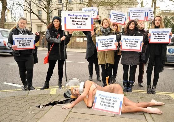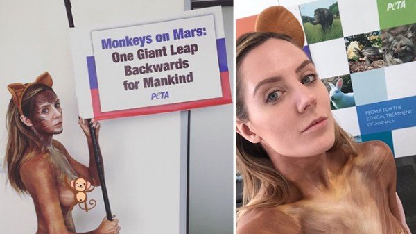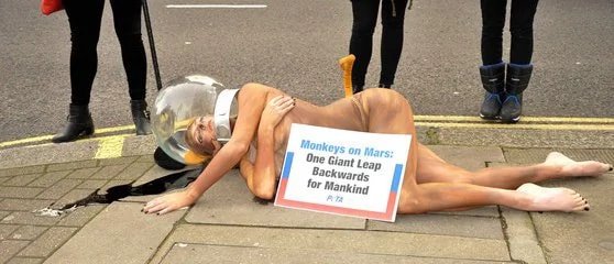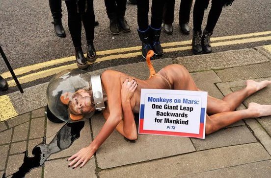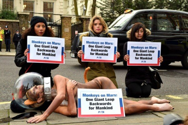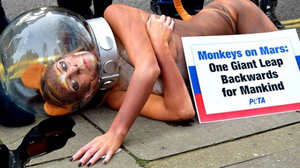 Porn star strips naked in PETA ‘space monkey’ protest in Moscow, 01/13/2016. Trois bananes pour le singe ! Samantha Bentley est une actrice pornographique anglaise. Âge : 28 ans (8 octobre 1987).