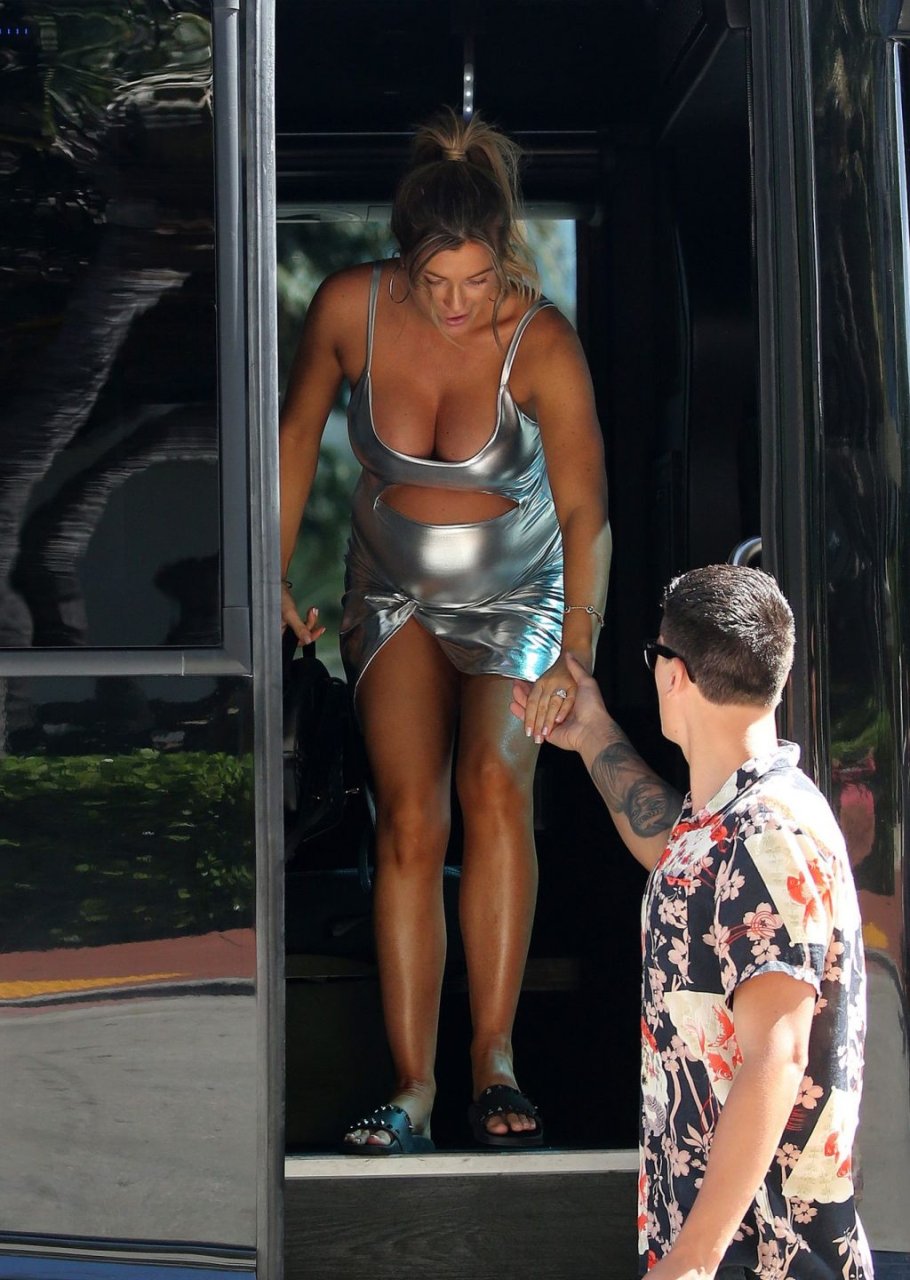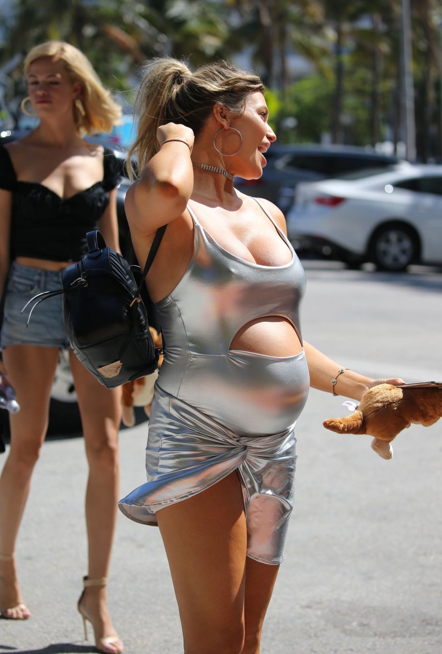 Le mannequin enceinte de Sports Illustrated, Samantha Hoopes, montre son ventre de bébé dans une tenue argentée alors qu’elle se promène à Miami Beach, le 11/05/2019.
