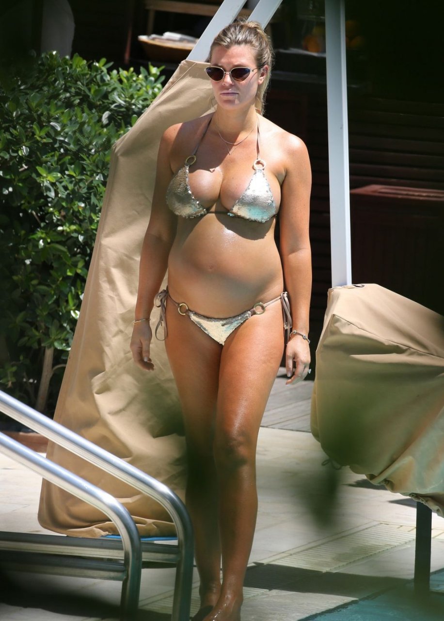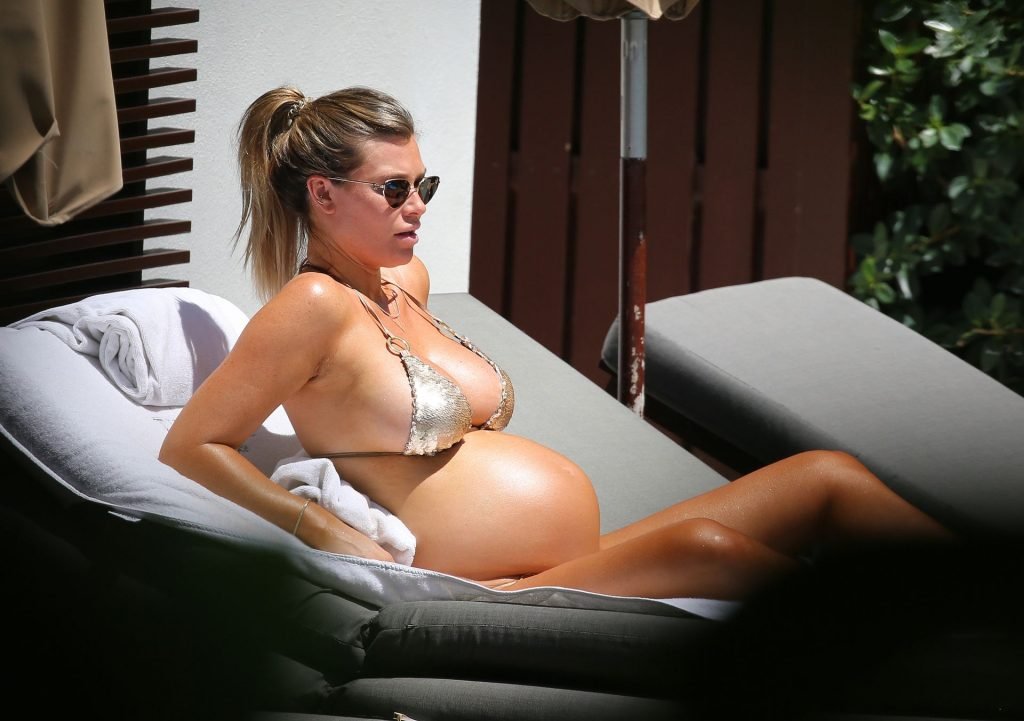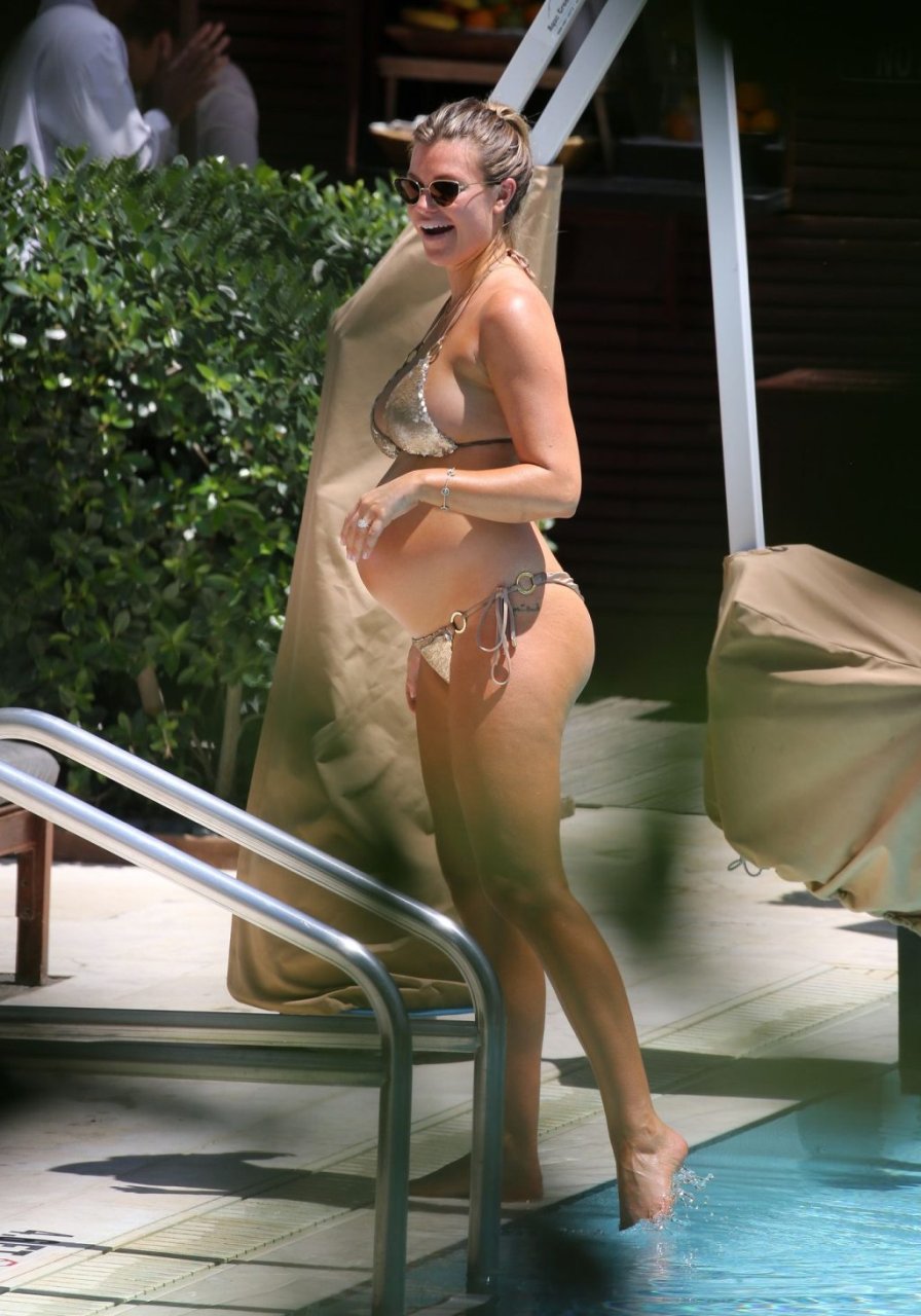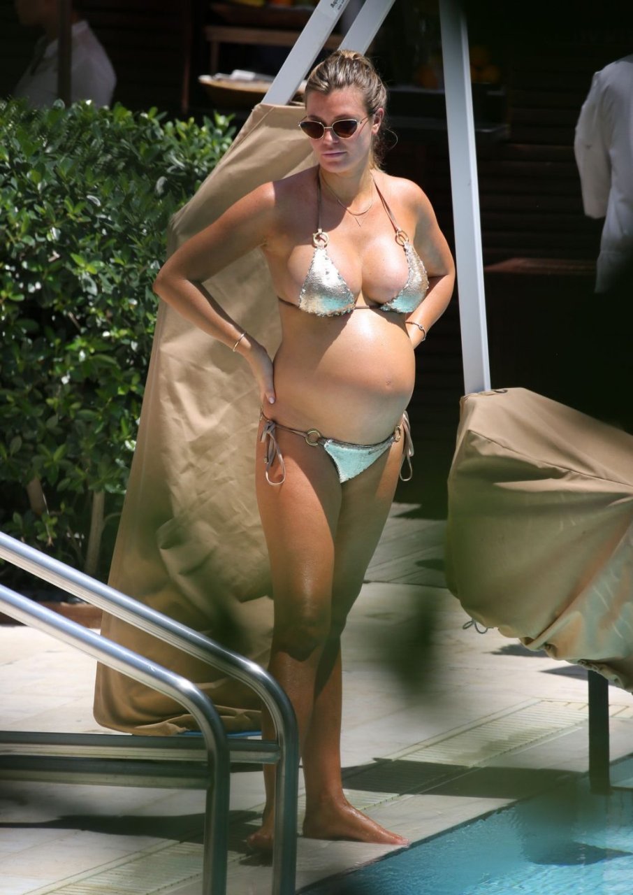 Le mannequin de maillot de bain enceinte Samantha Hoopes porte un minuscule bikini à sequins en profitant du soleil au bord de la piscine à Miami, 09/05/2019.