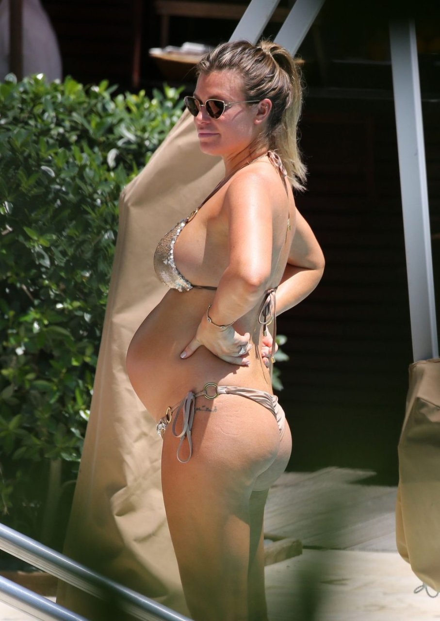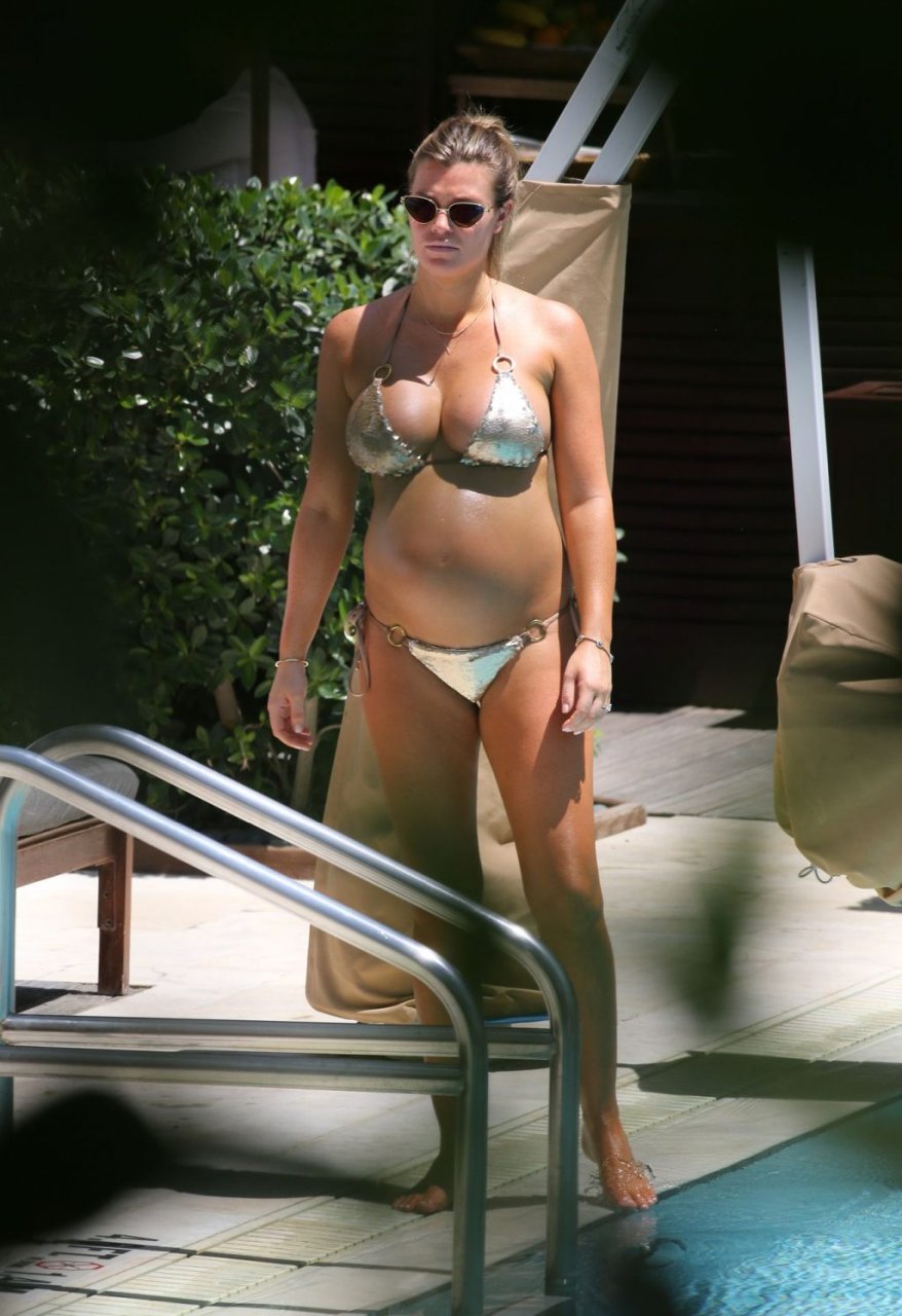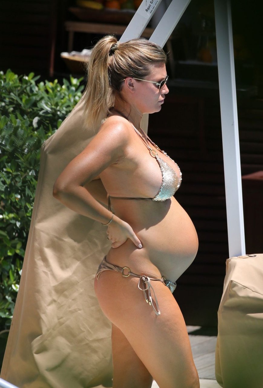 Le mannequin de maillot de bain enceinte Samantha Hoopes porte un minuscule bikini à sequins en profitant du soleil au bord de la piscine à Miami, 09/05/2019.