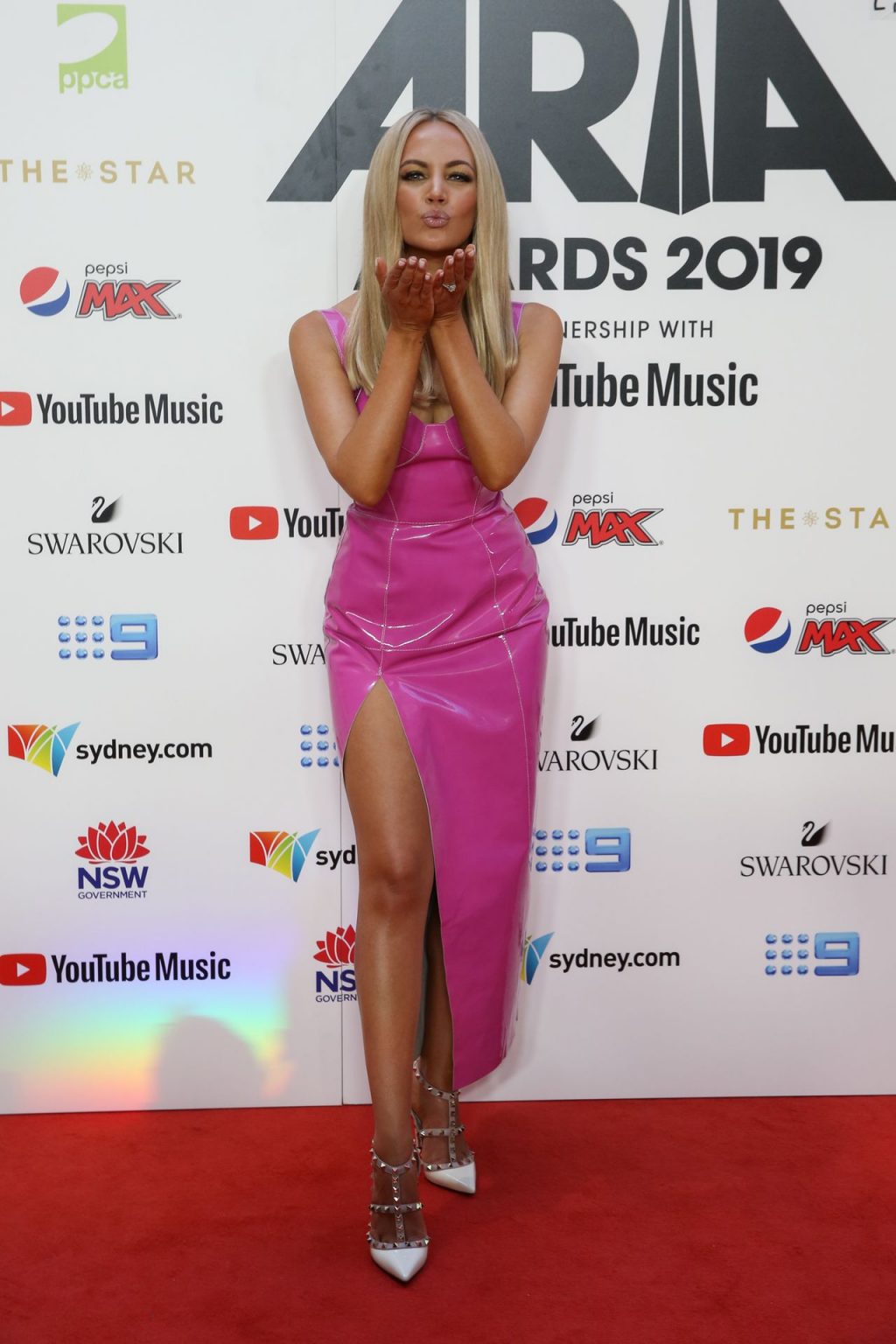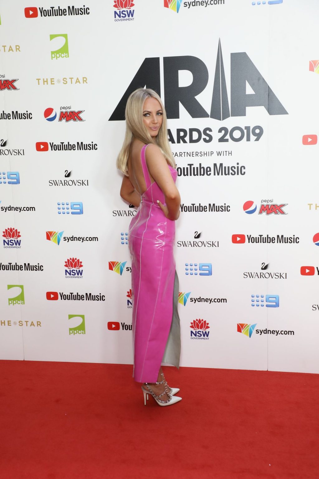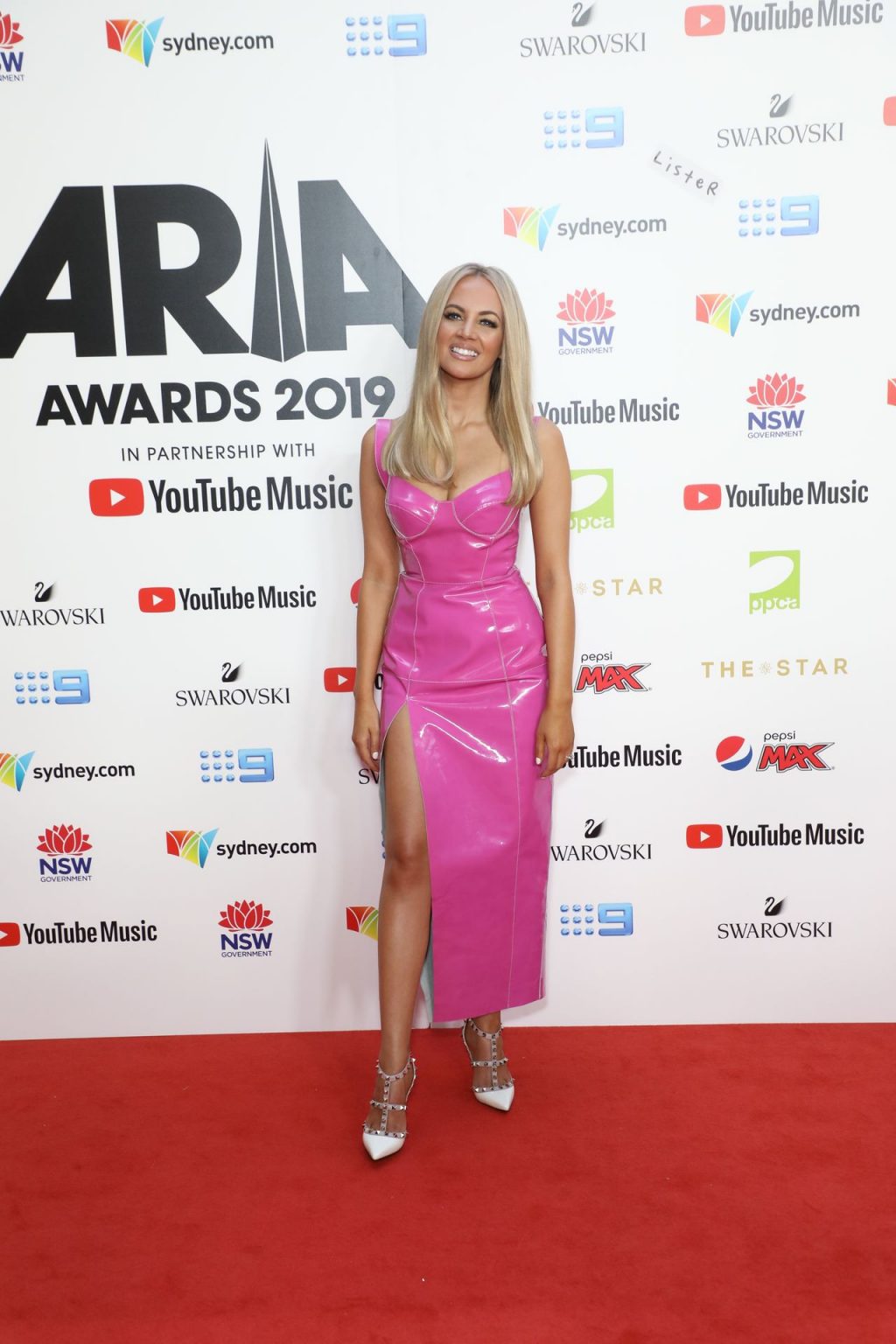 Chanteuse/auteure-compositrice australienne, actrice, mannequin Samantha Jade a été photographiée dans une robe en latex rose sur le tapis rouge des ARIA Awards 2019, qui récompensent le meilleur de l’industrie musicale australienne, le 27/11/2019.