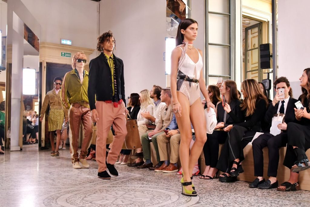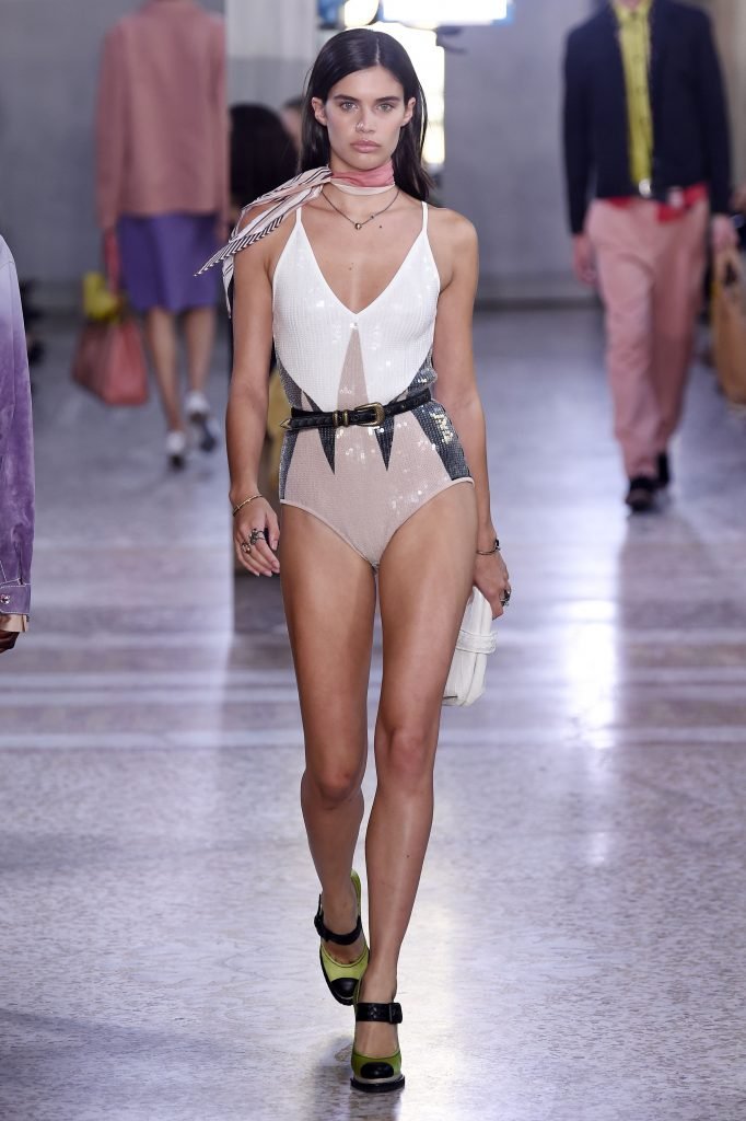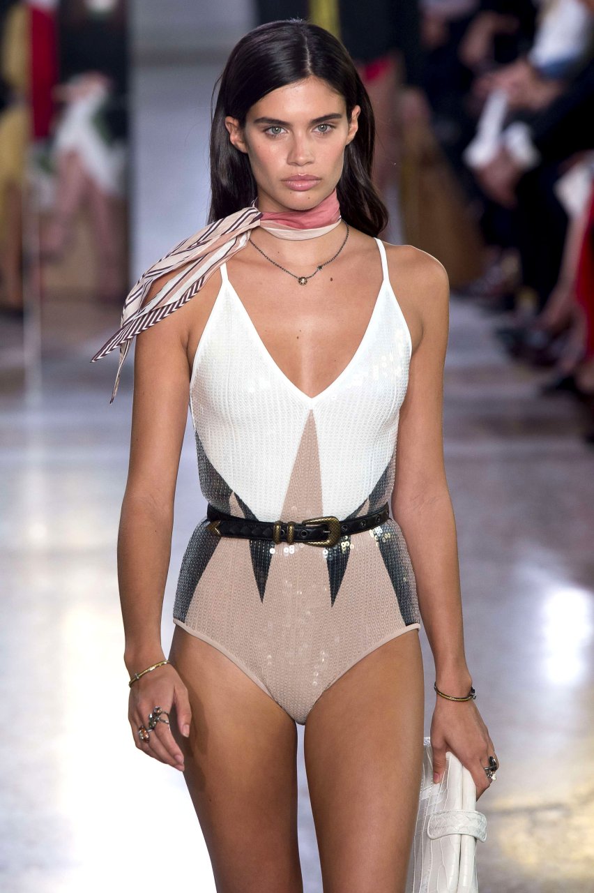 La supermodèle Sara Sampaio défile lors du défilé Bottega Veneta Printemps/Été 2018 pendant la Fashion Week de Milan à Milan, le 23/09/2017.