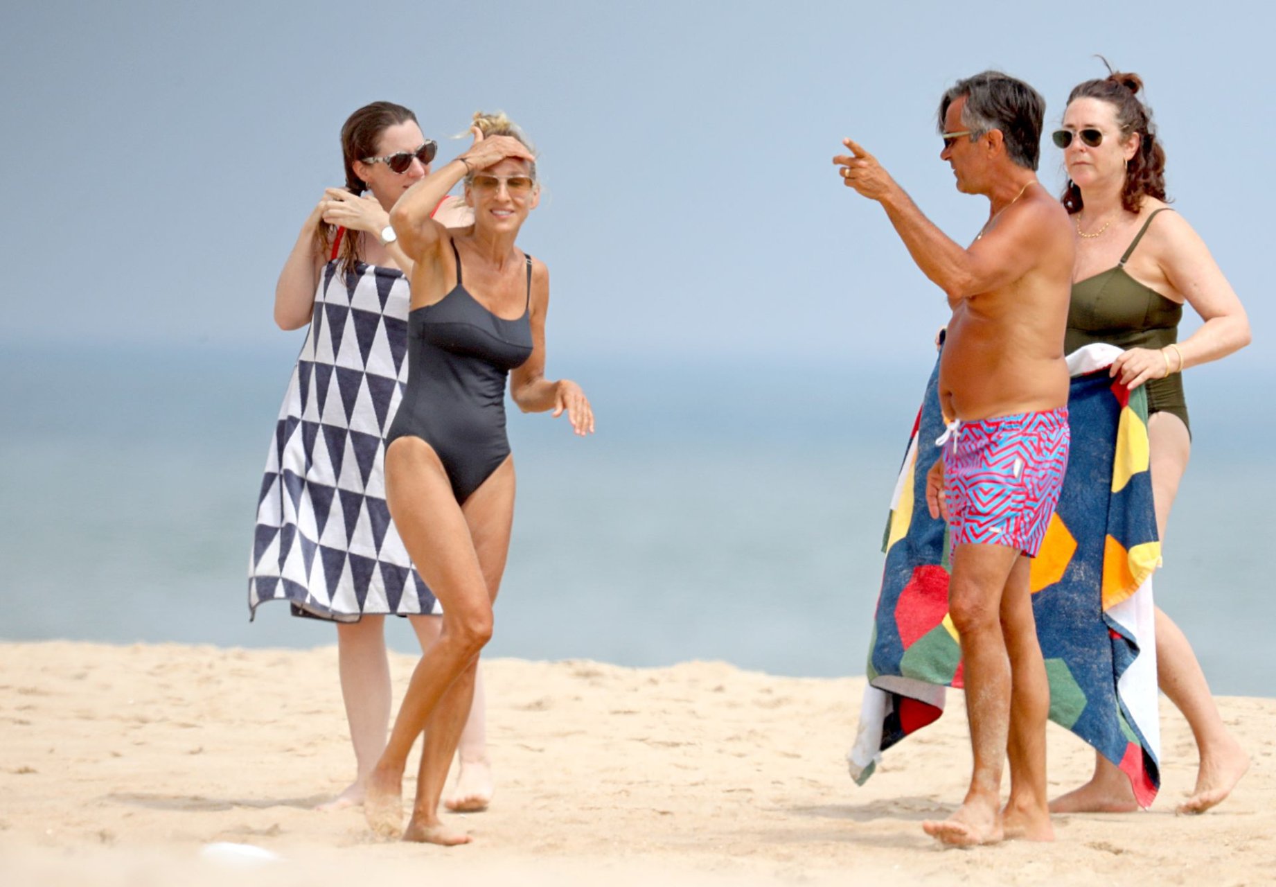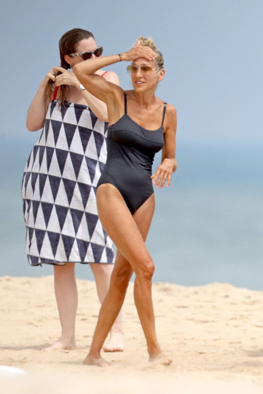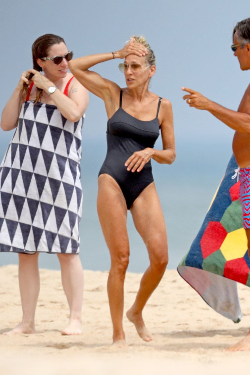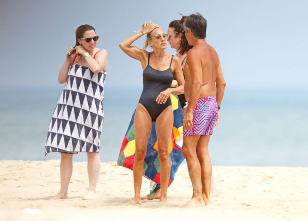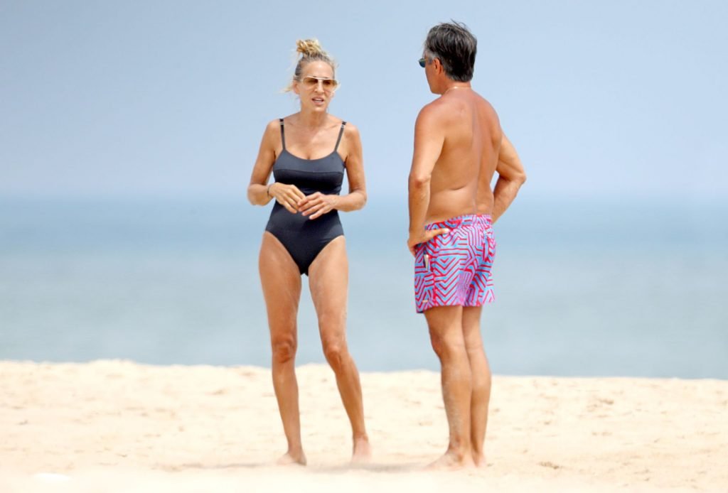 Sarah Jessica Parker profite d’une journée à la plage dans les Hamptons, New York, le 07/07/2019. L’actrice de 54 ans portait un maillot de bain une pièce bleu et a été vue en train de discuter avec un groupe d’amis avant de s’asseoir sur le sable pour lire un livre.