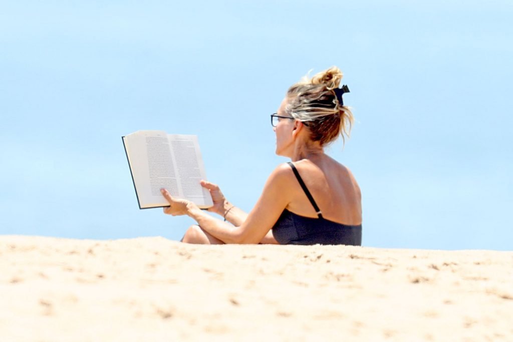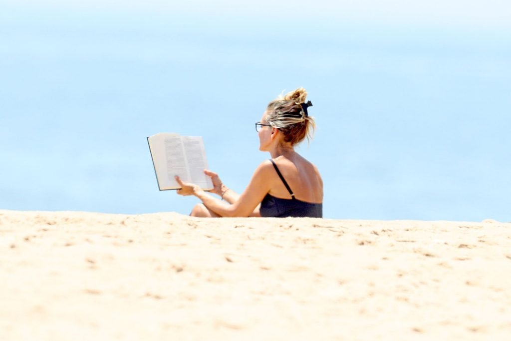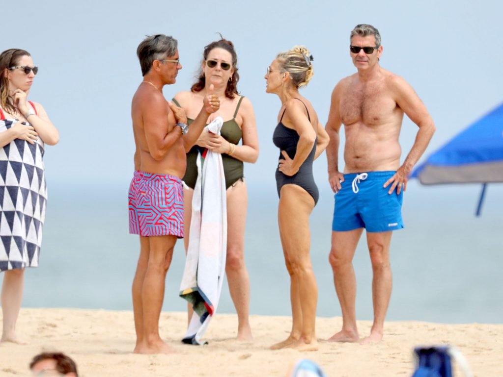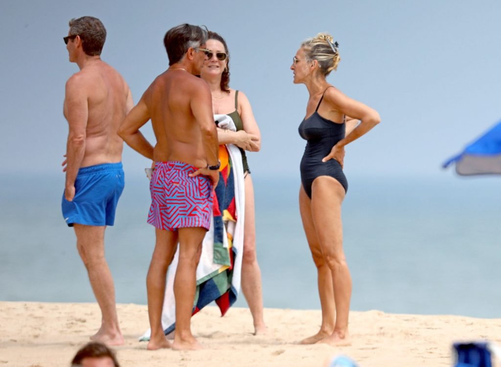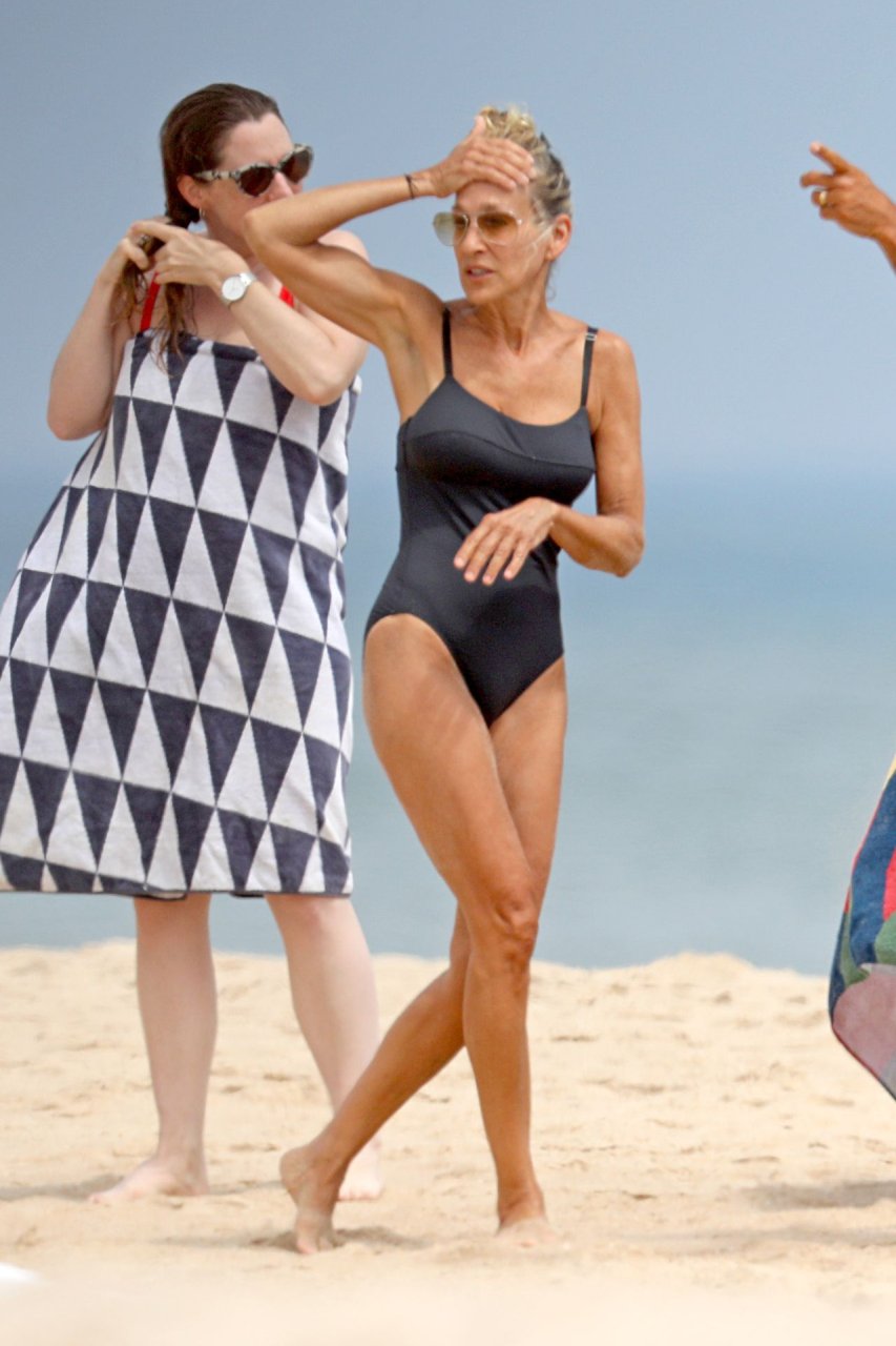 Sarah Jessica Parker profite d’une journée à la plage dans les Hamptons, New York, le 07/07/2019. L’actrice de 54 ans portait un maillot de bain une pièce bleu et a été vue en train de discuter avec un groupe d’amis avant de s’asseoir sur le sable pour lire un livre.