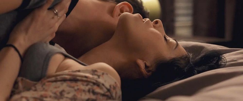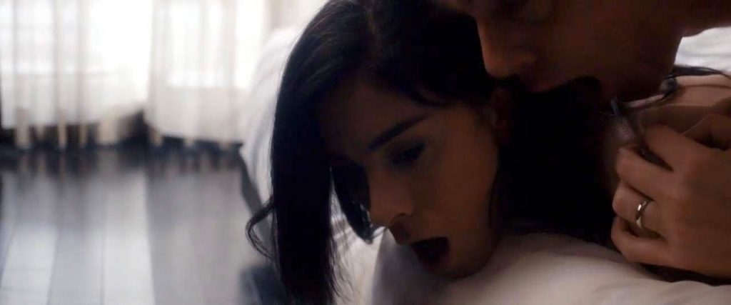 Sexy Sarah Silverman first in a guy’s lap as they have sex on a bed. The guy flips her over onto her stomach naked, and we see a bit off her butt cheek as the guy begins to have anal sex with her. She then lies on her side in the guy’s arms, showing some cleavage.