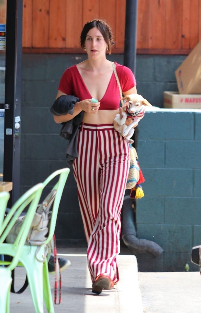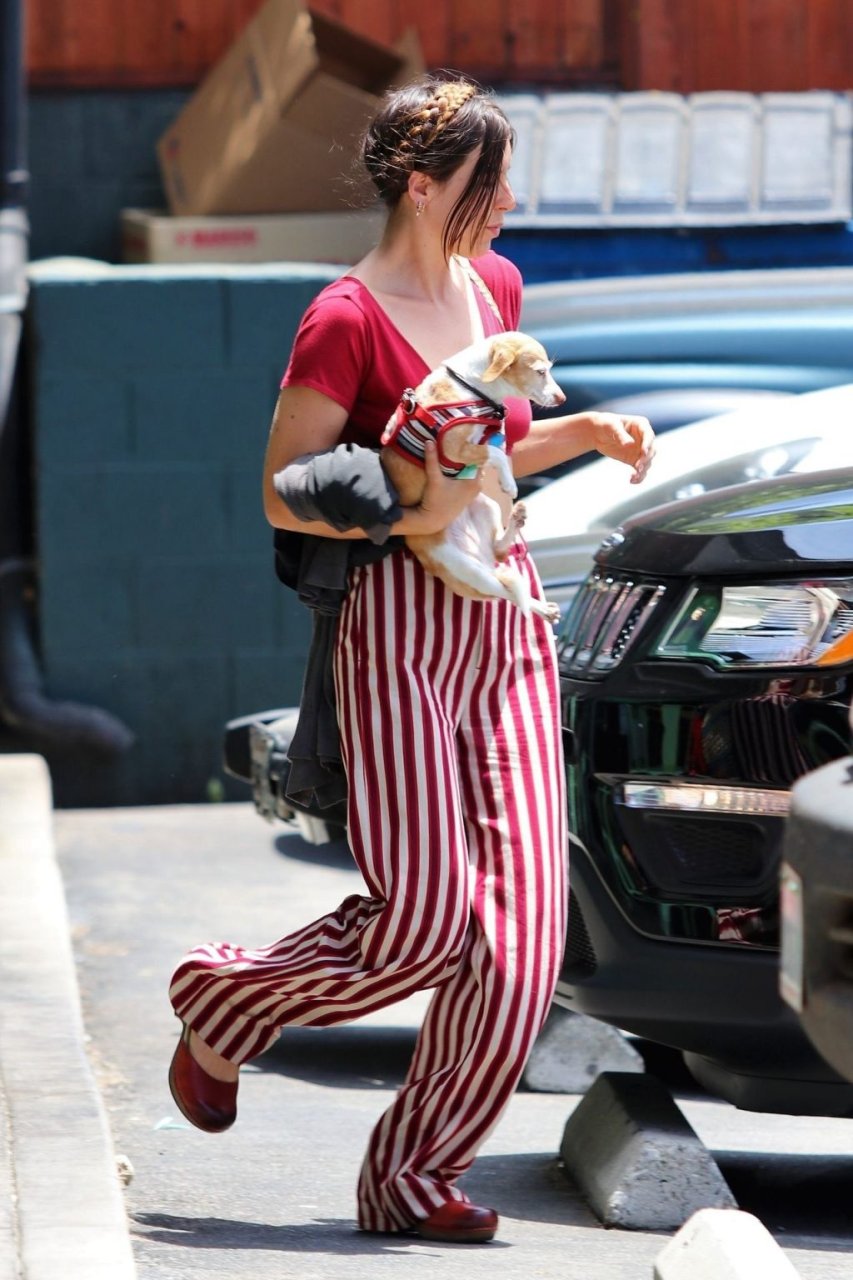 L’actrice Scout Willis est à Los Angeles, faisant une apparition devant un pressing avec son chien dans les bras, le 09/07/2019. L’actrice porte un bas rayé rouge/blanc associé à un tee-shirt à col en V plongeant.