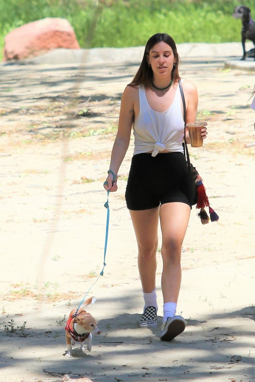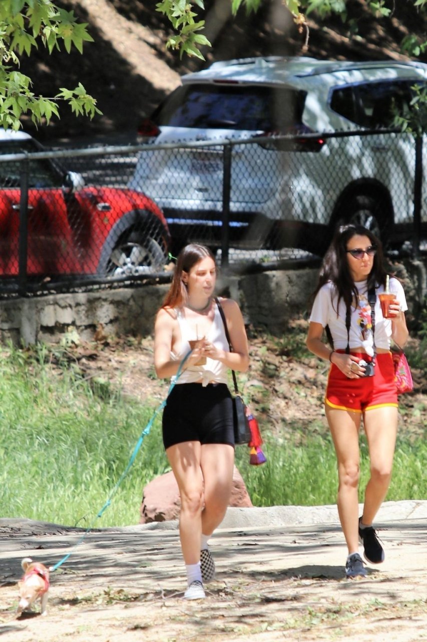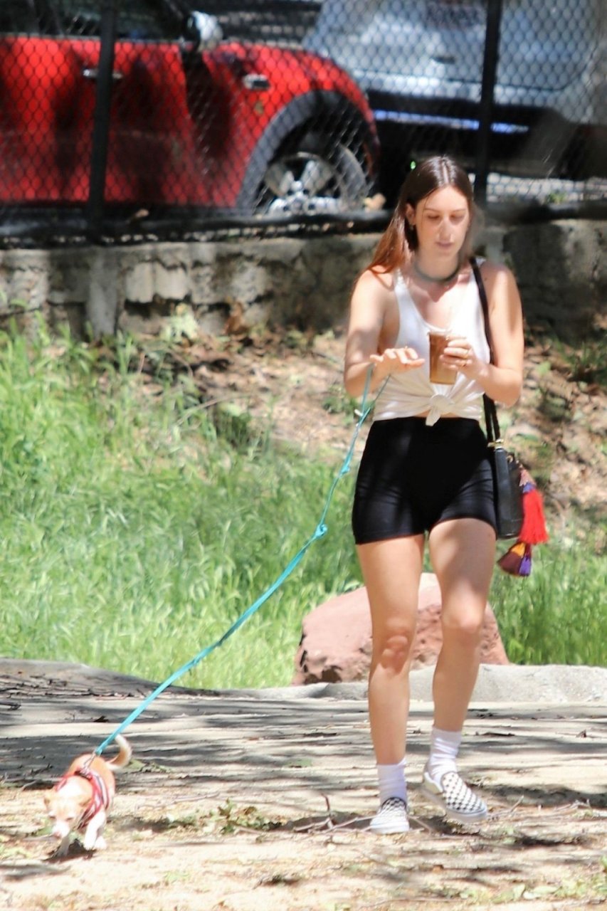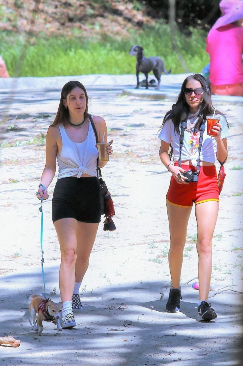 Scout Willis profite d’une promenade et d’une conversation avec une amie dans un parc à Los Feliz en sirotant des cafés glacés tout en promenant son chien, 12/04/2019.