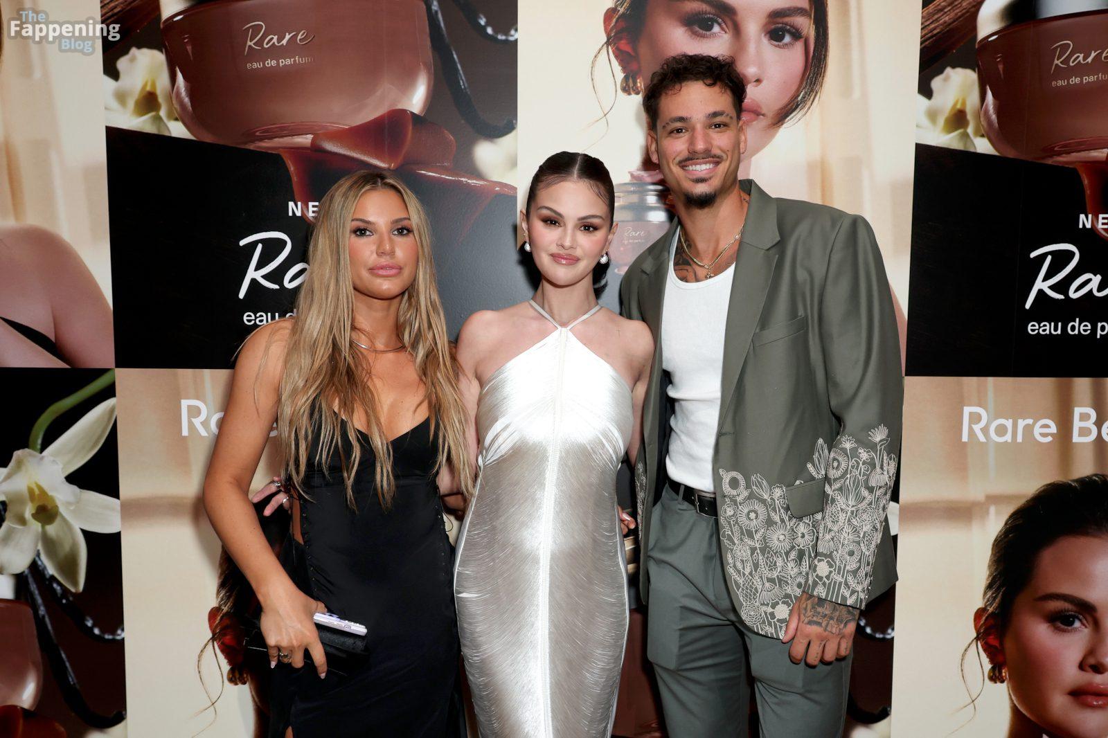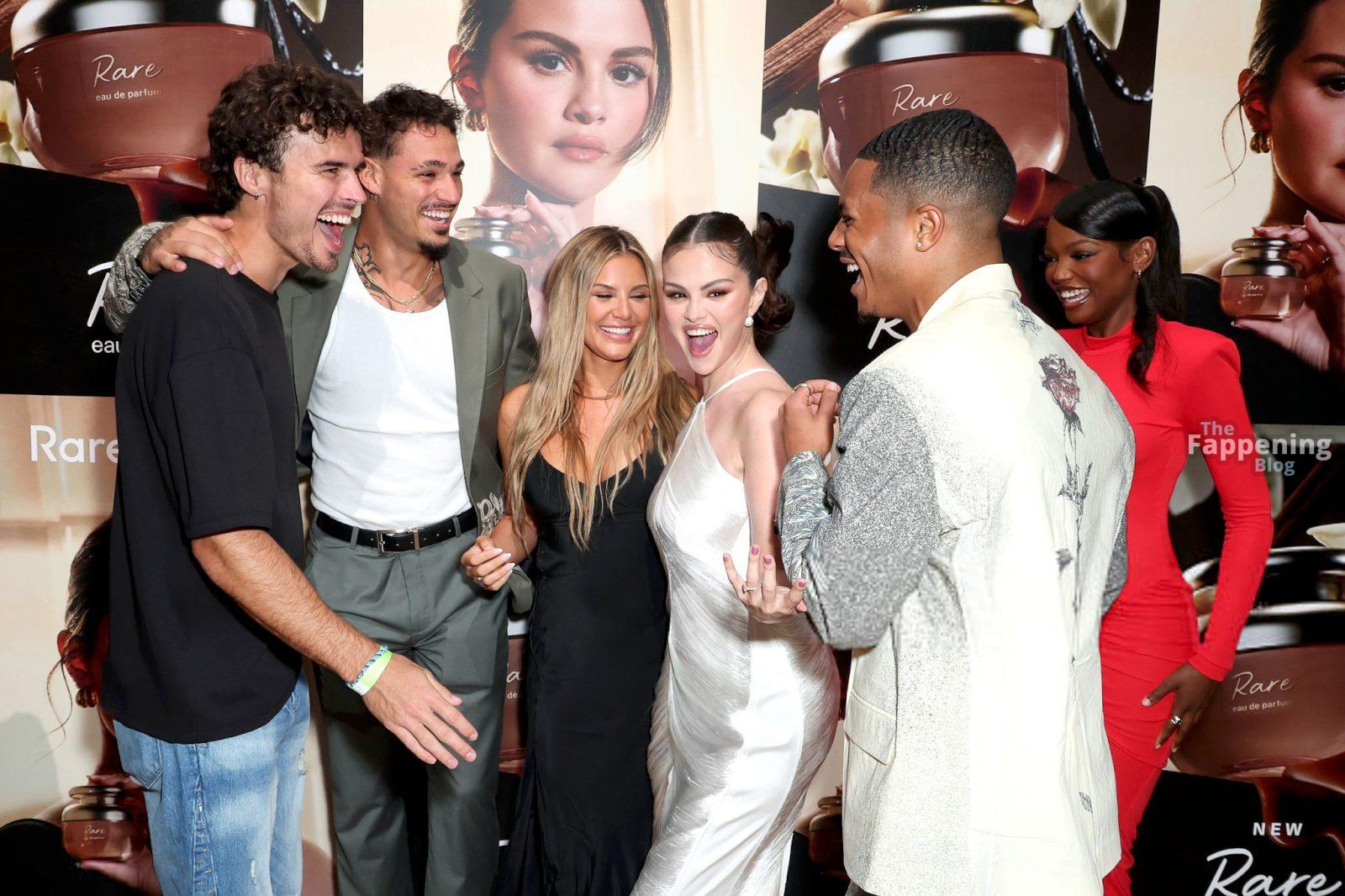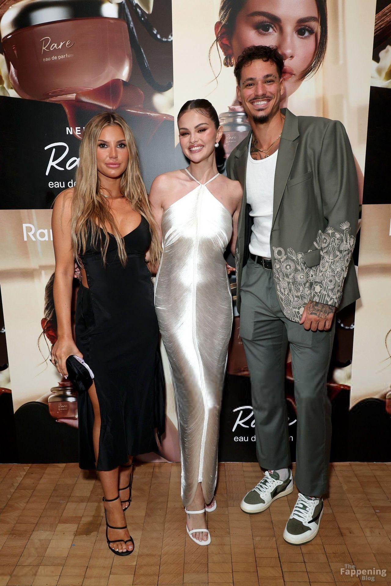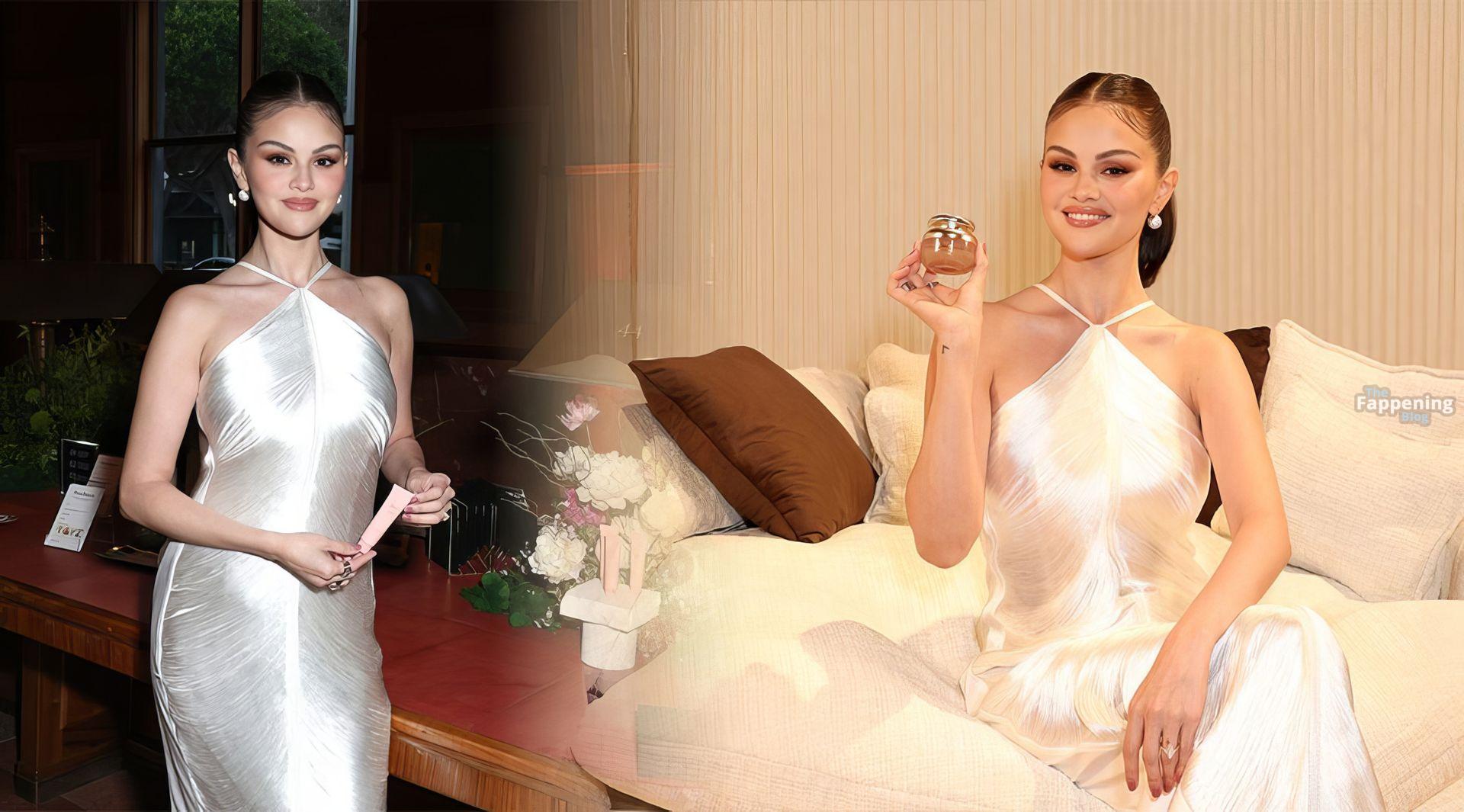 La star de The Fappening Selena Gomez porte une robe halter argentée moulante lors du lancement de Rare Beauty à Santa Monica.
