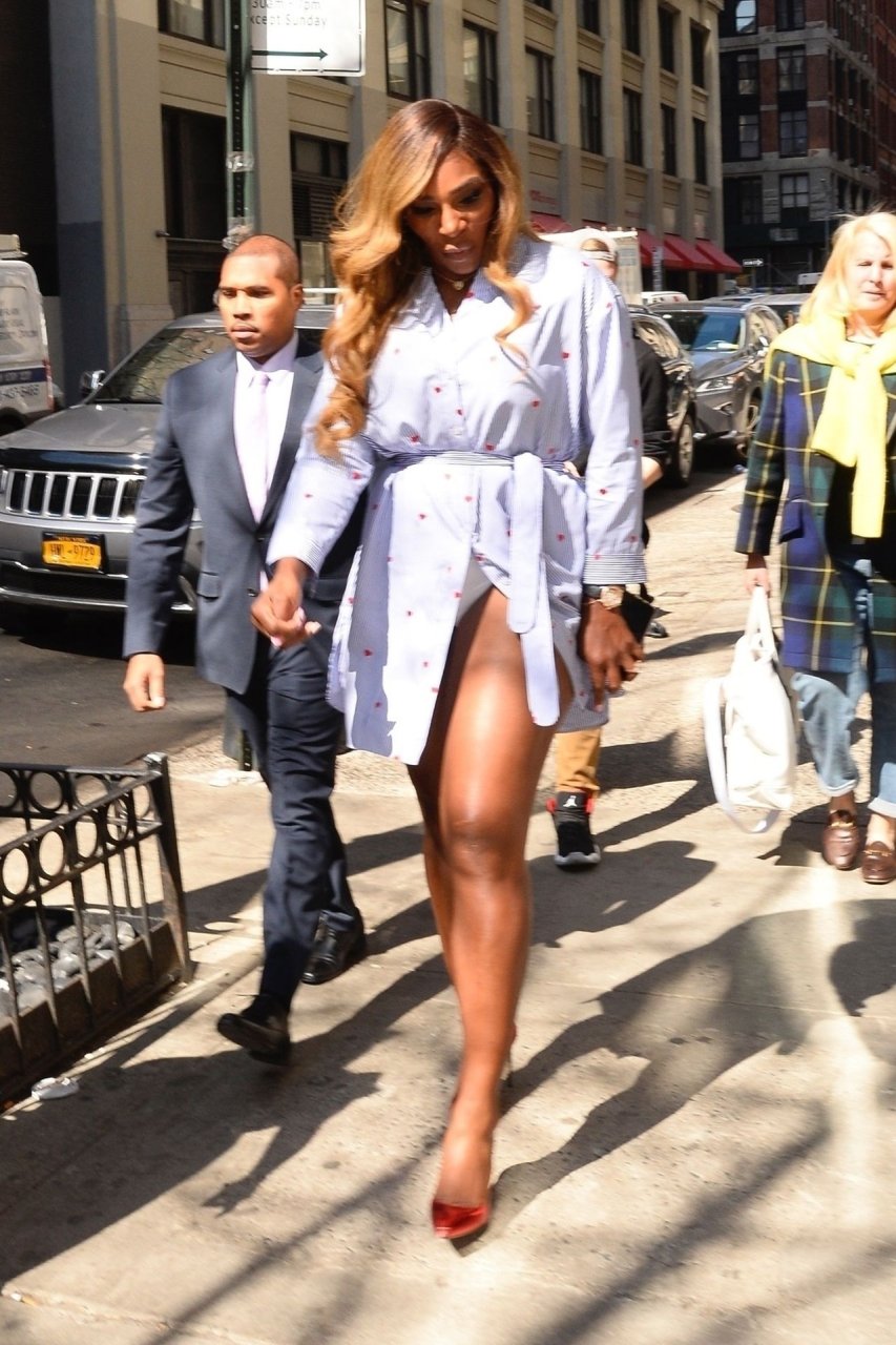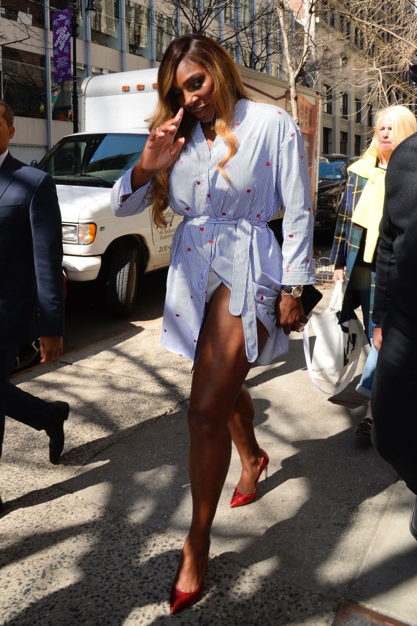 Serena Williams porte une robe très courte fendue qui laisse entrevoir sa lingerie. Serena a été vue quittant les bureaux de Buzzfeed en affichant ce look osé – New York, 04/03/2019.