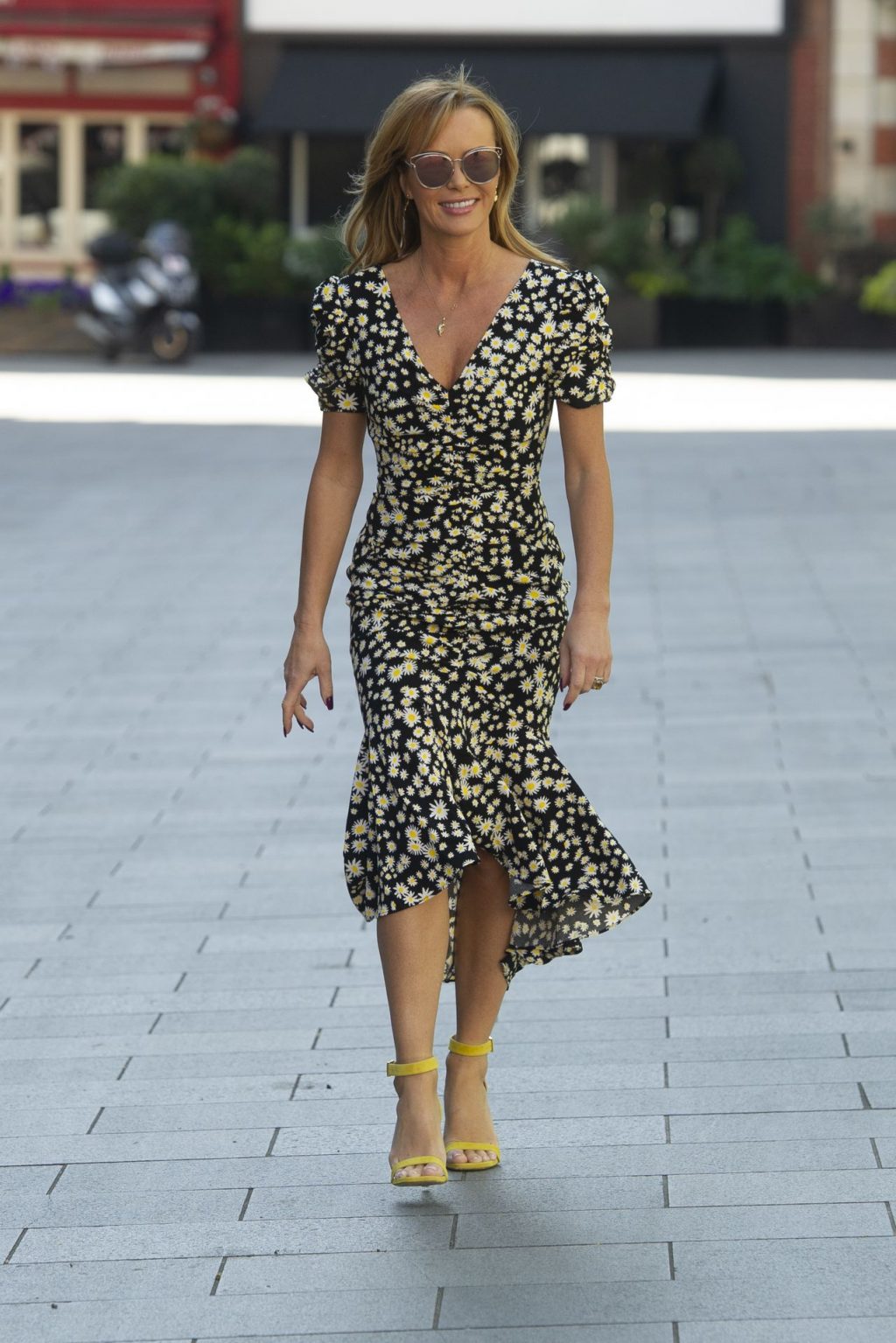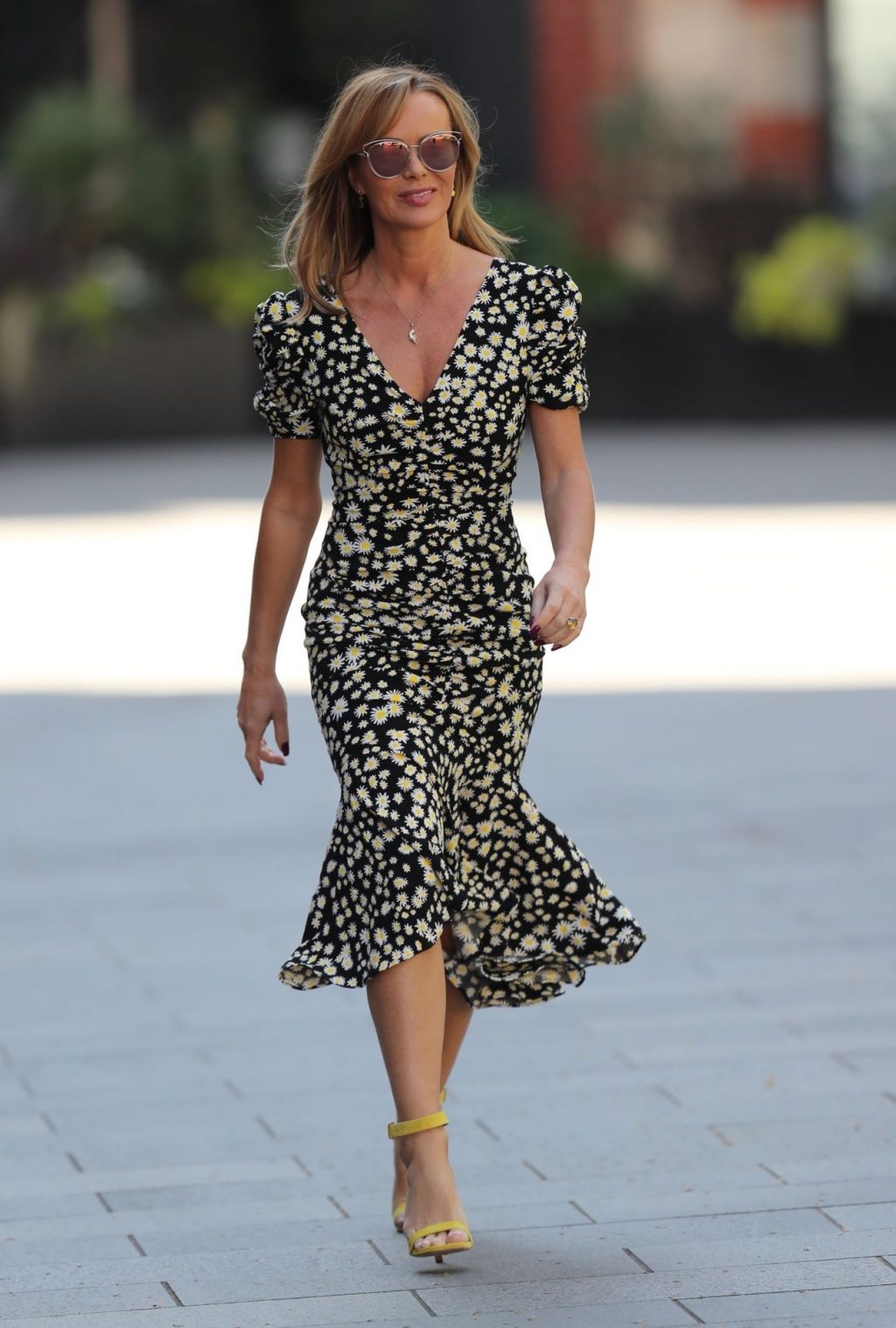 La personnalité médiatique Amanda Holden a été vue quittant les studios Global de l’émission Heart Radio Breakfast portant une robe monochrome à Londres, le 22/04/2020.