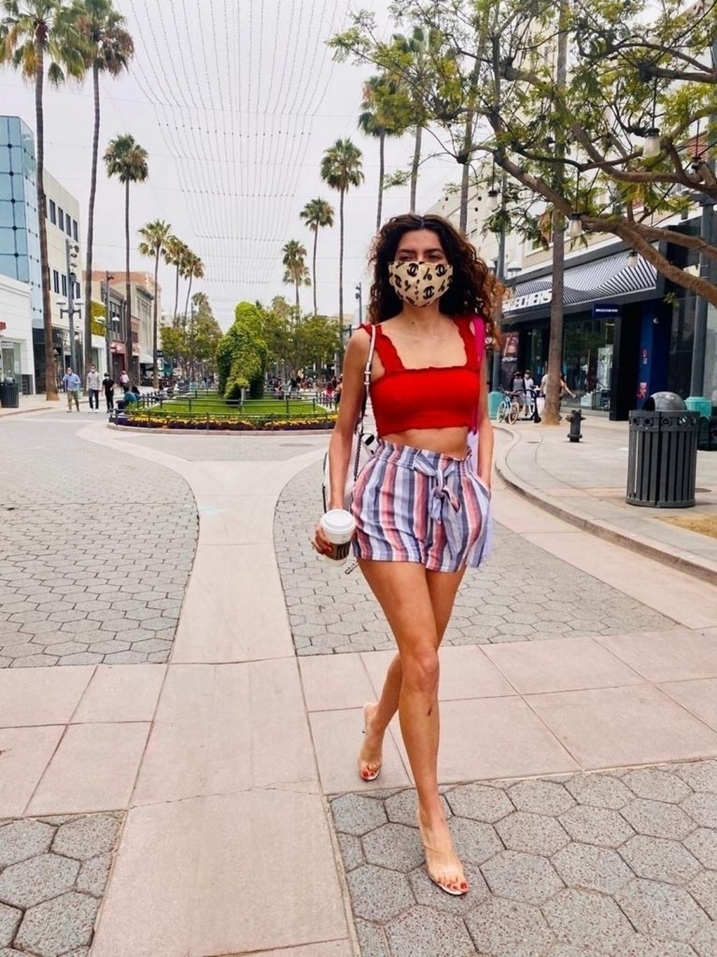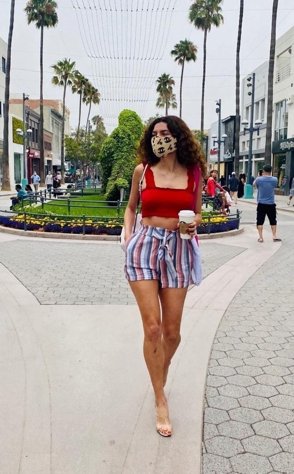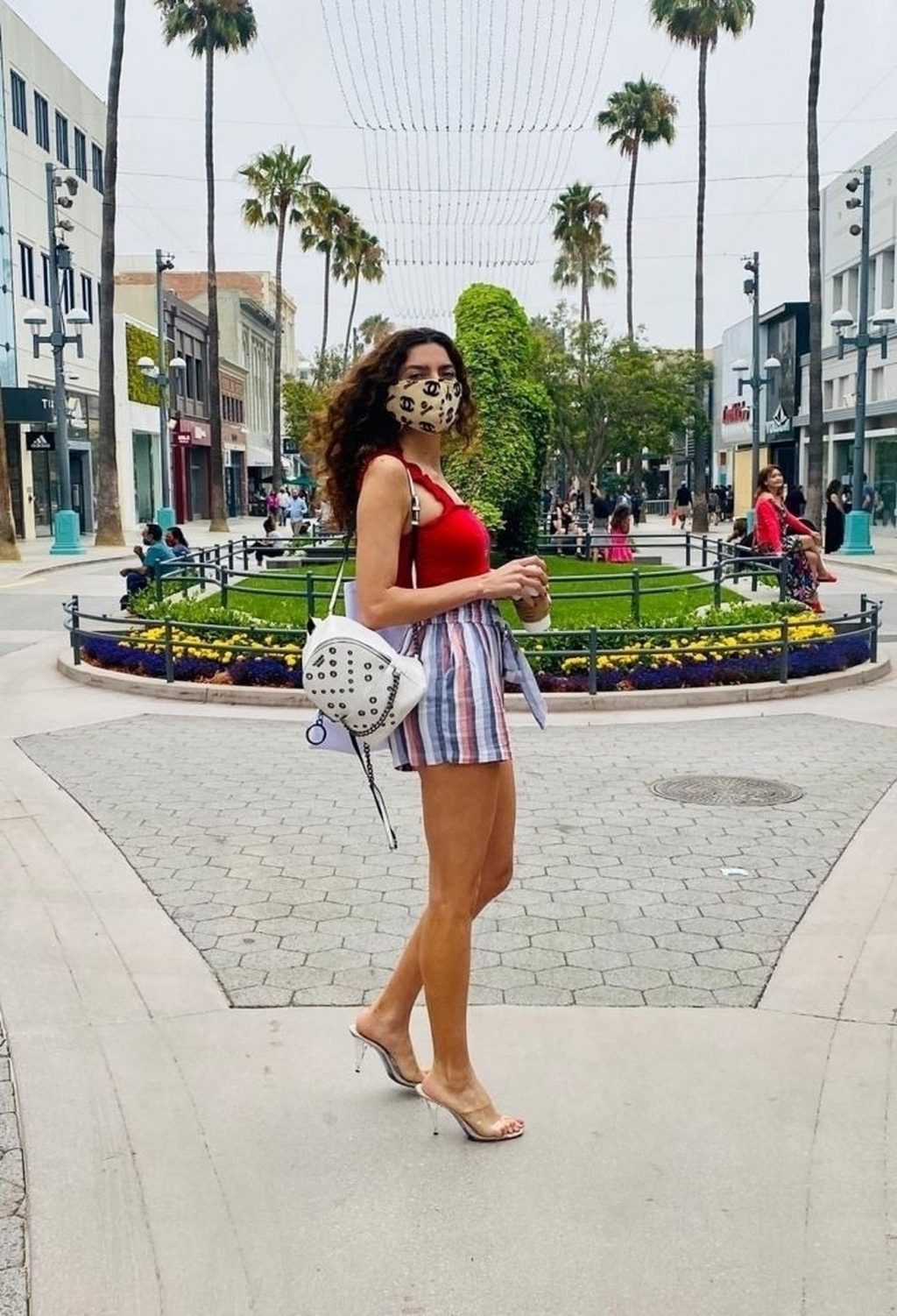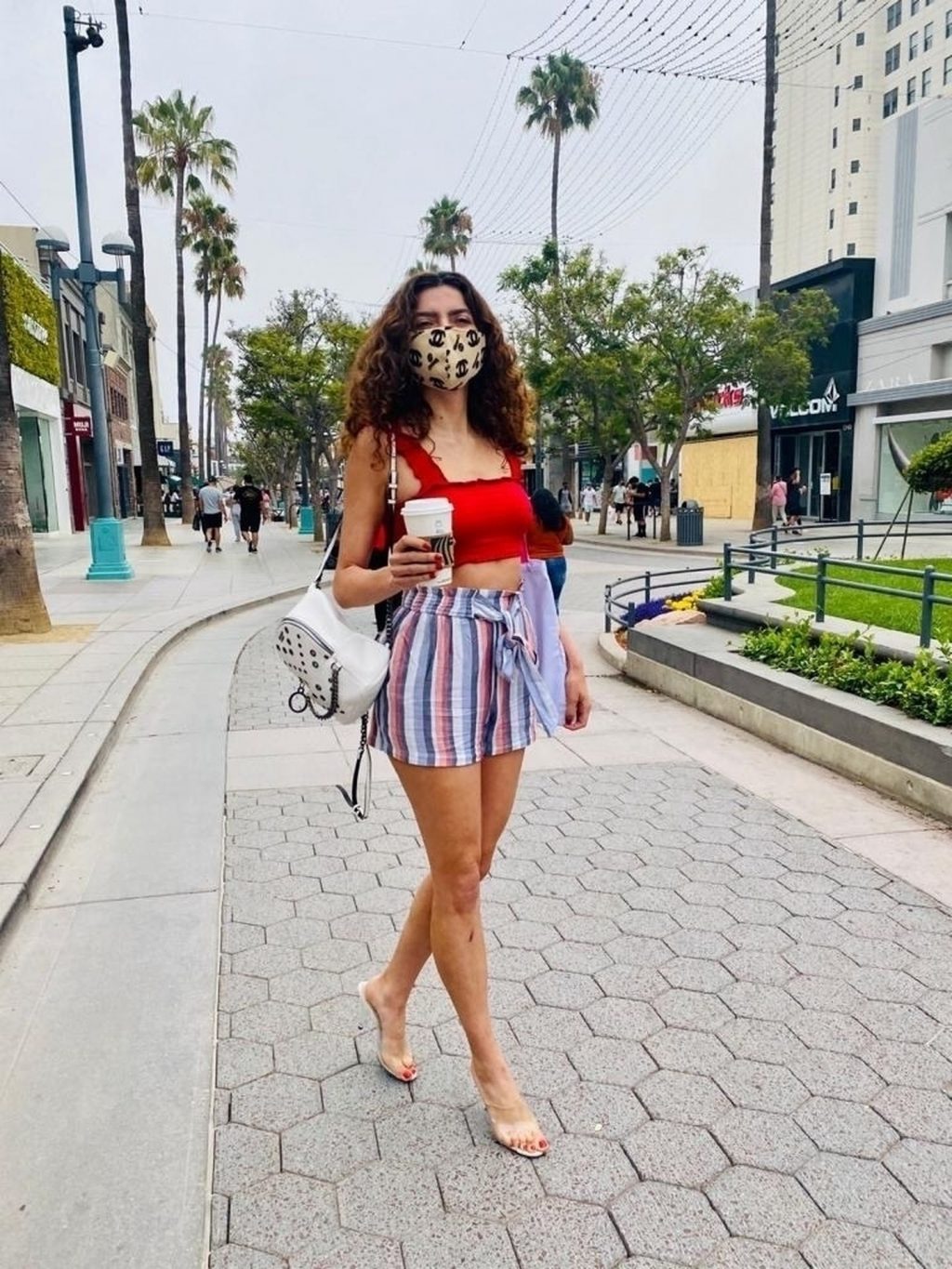 Blanca Blanco, aux longues jambes, prend un café au Third Street Promenade à Santa Monica, 03/08/2020.