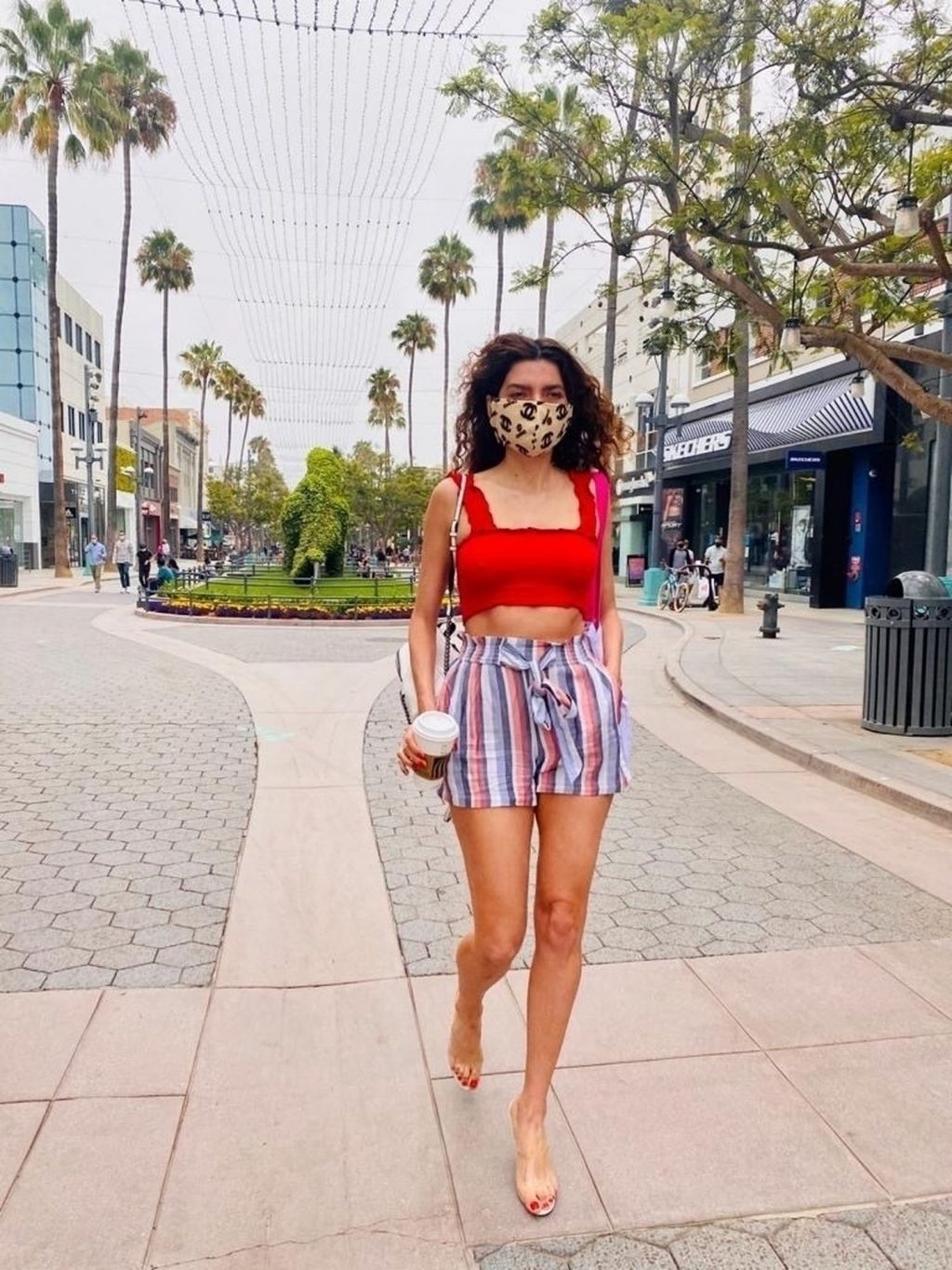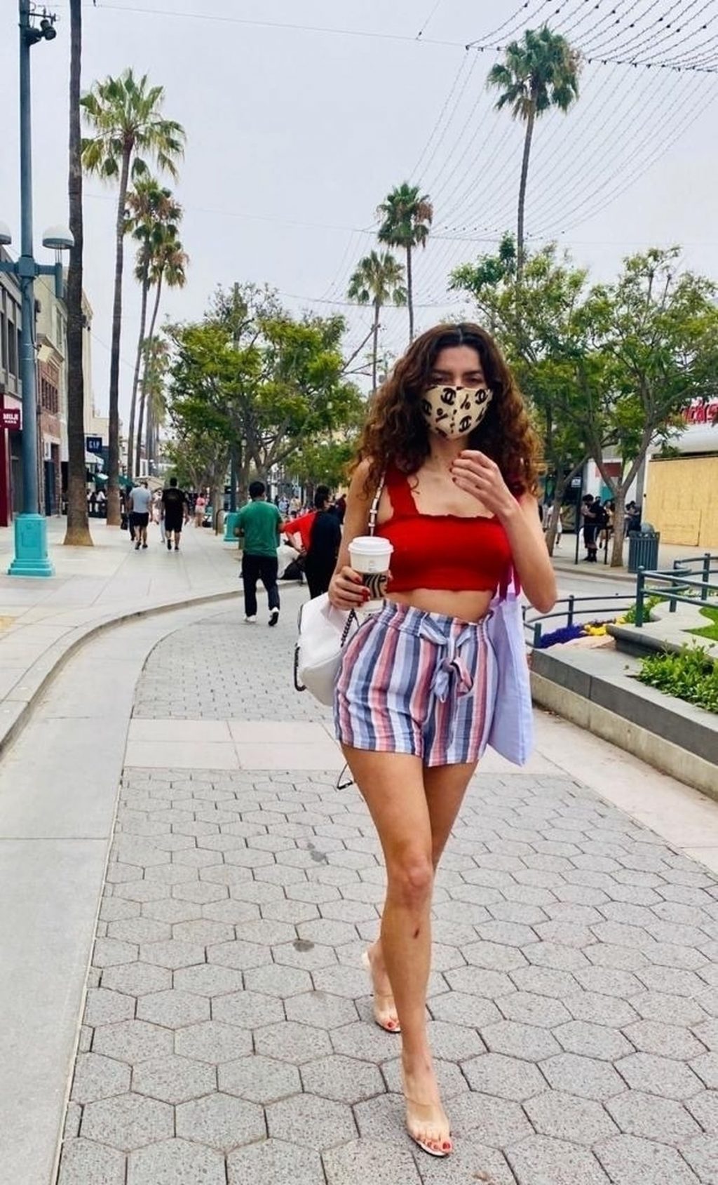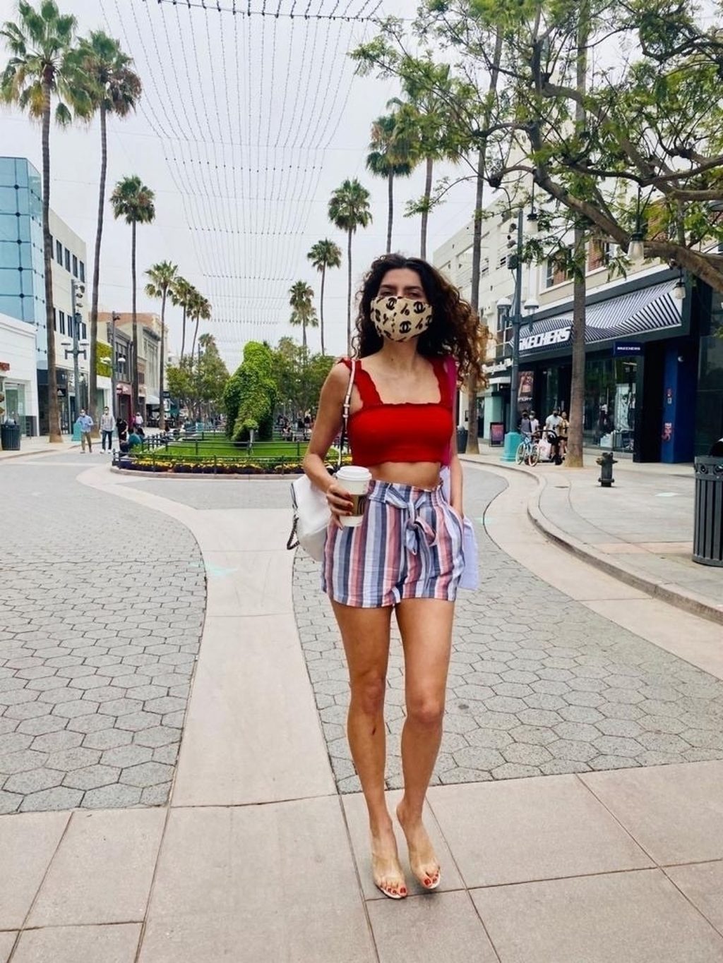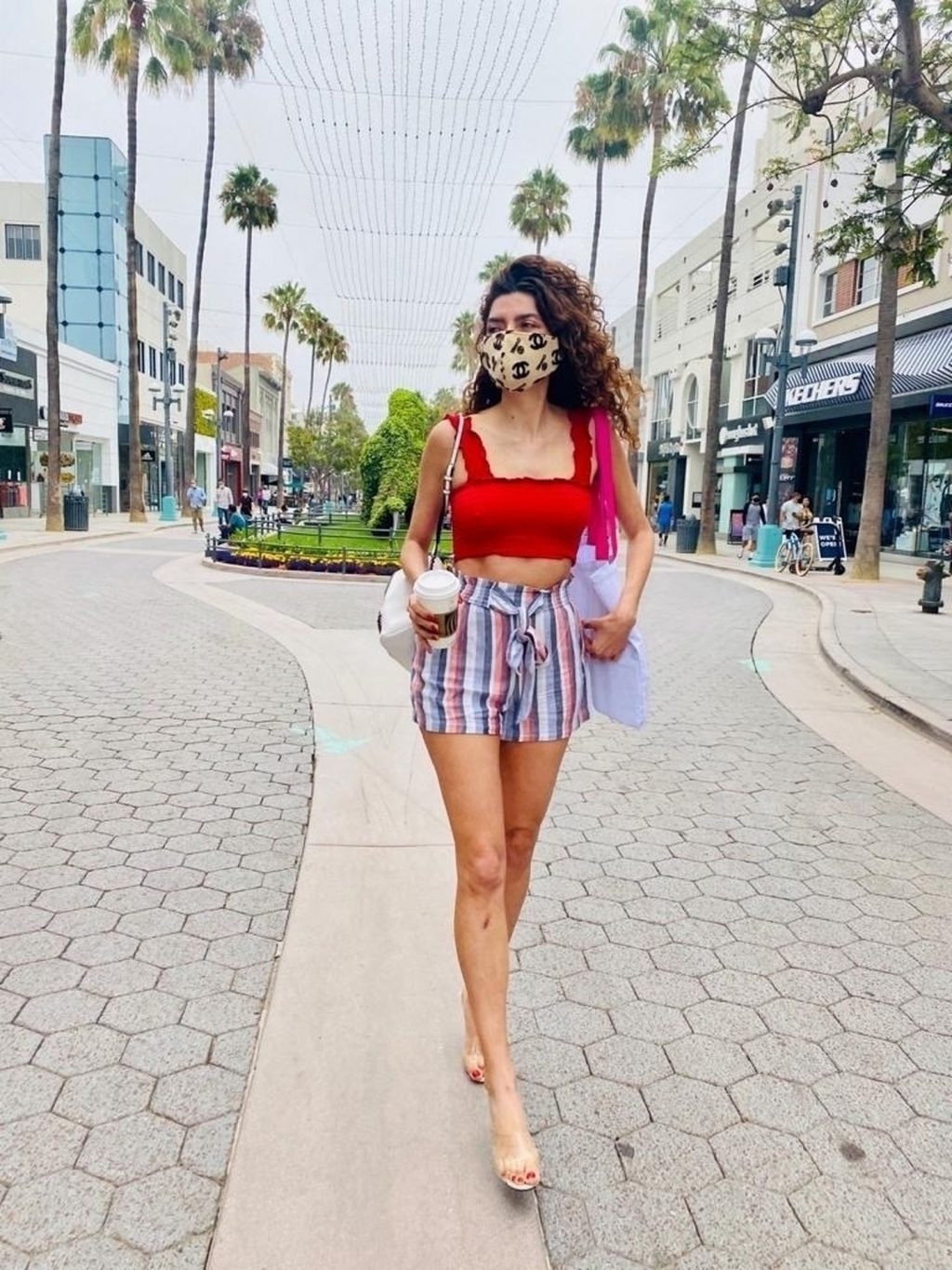 Blanca Blanco, aux longues jambes, prend un café au Third Street Promenade à Santa Monica, 03/08/2020.