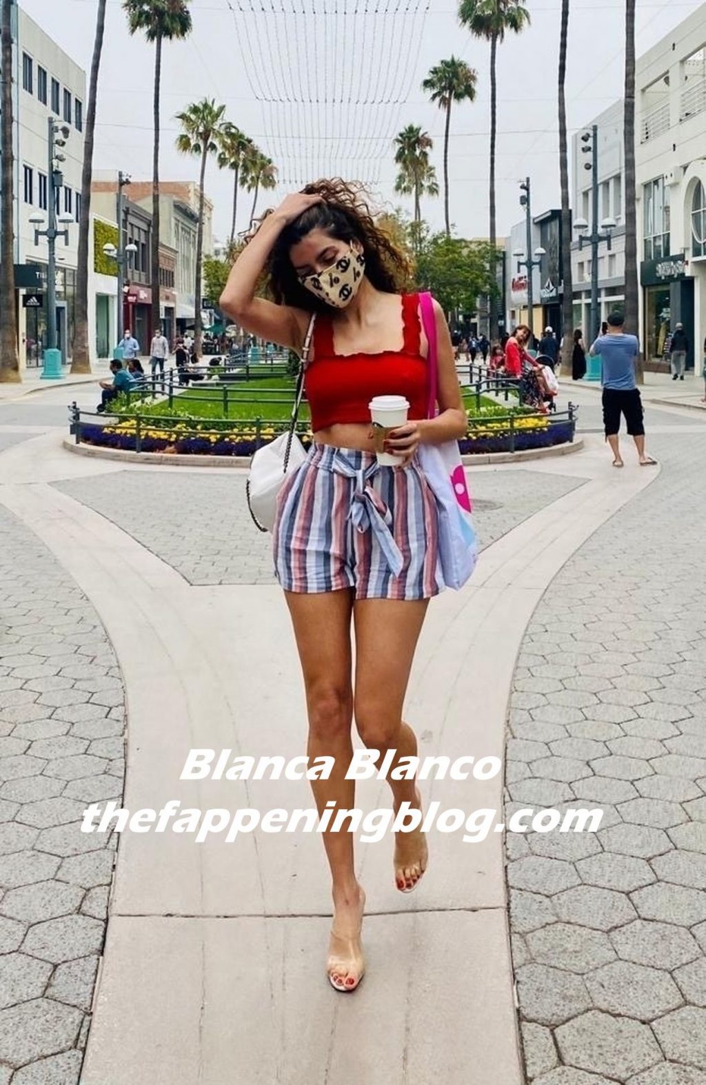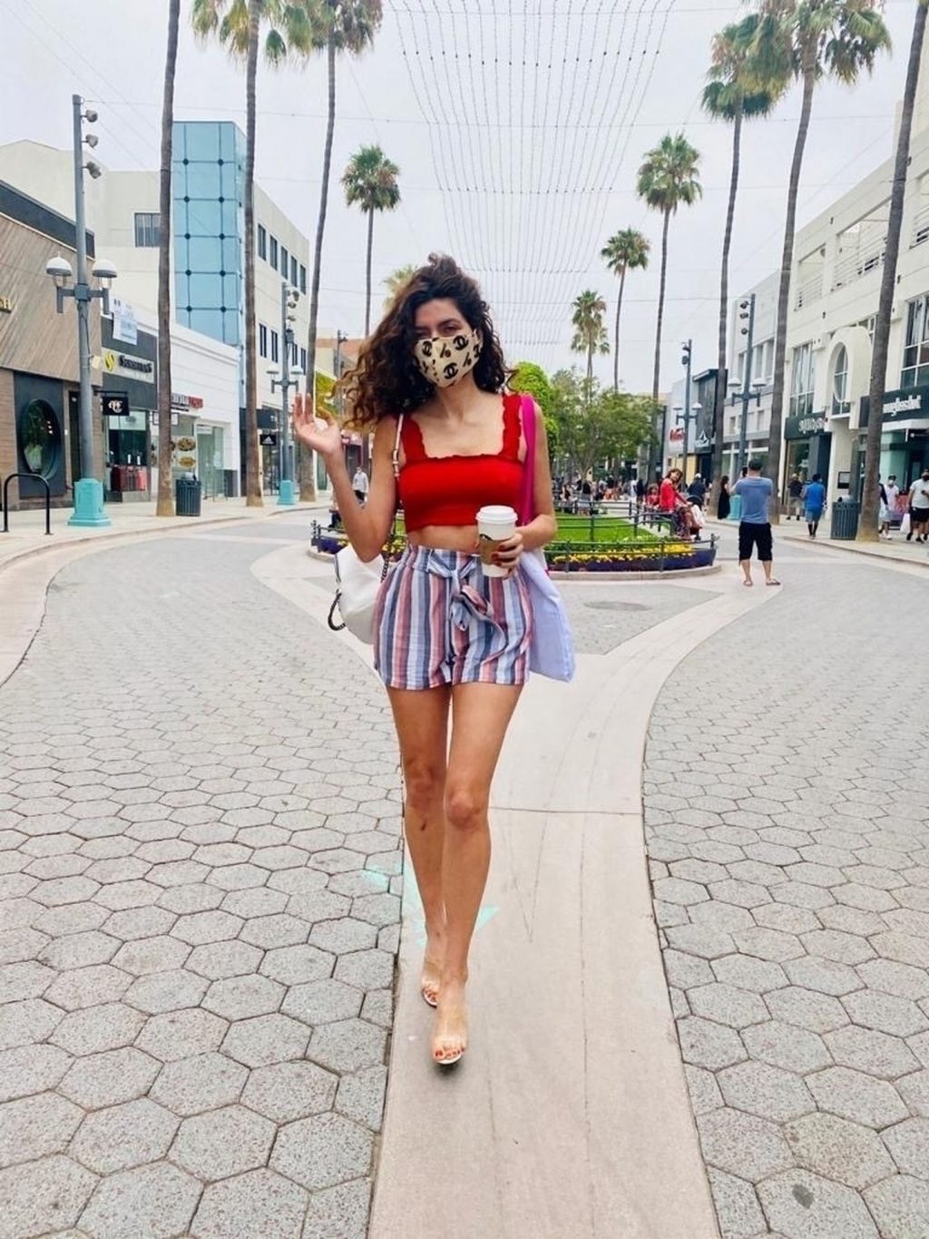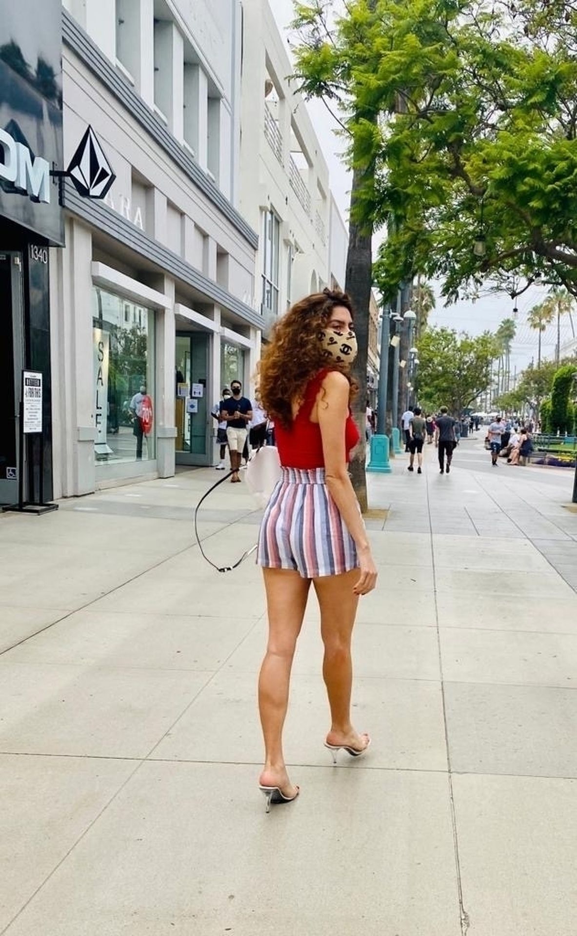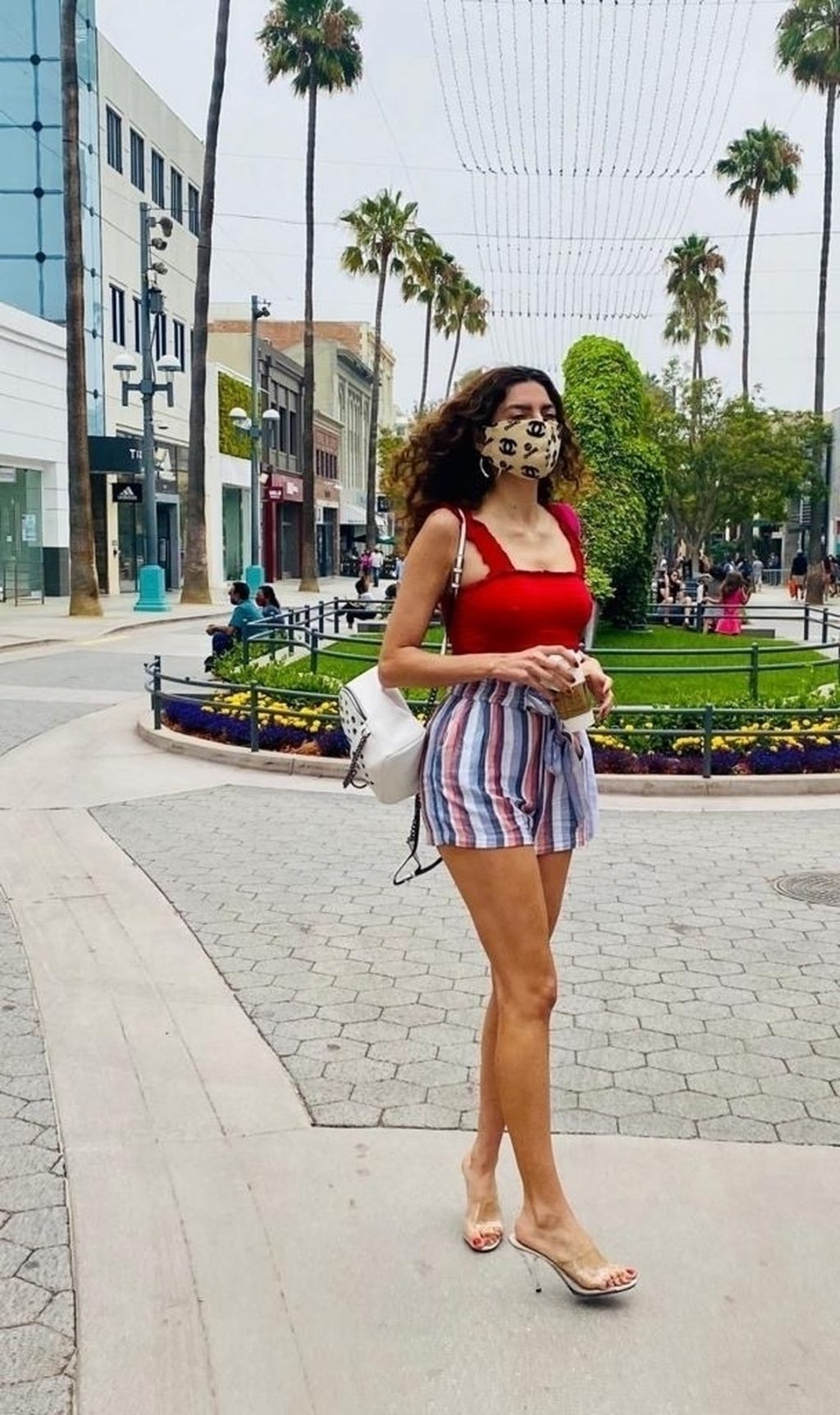Blanca Blanco, aux longues jambes, prend un café au Third Street Promenade à Santa Monica, 03/08/2020.