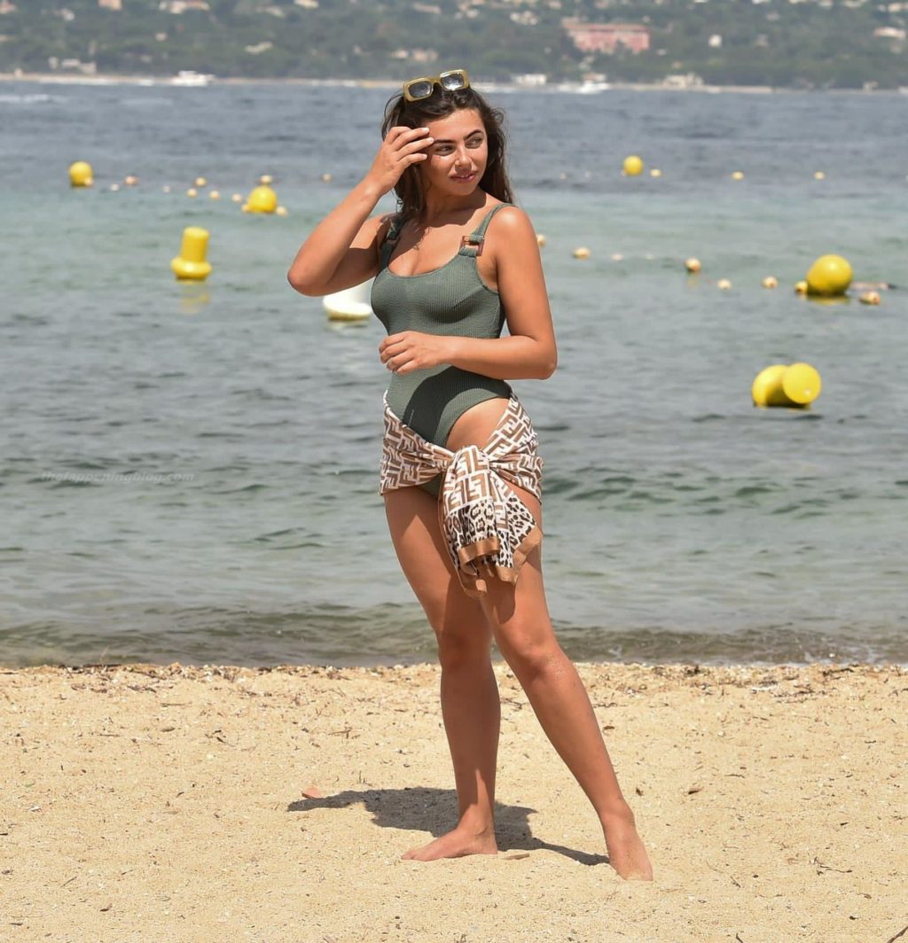 Love Island star Francesca Allen profite d’une journée à la plage à Dubaï (2020). Elle affiche ses magnifiques courbes dans un maillot de bain une pièce vert.