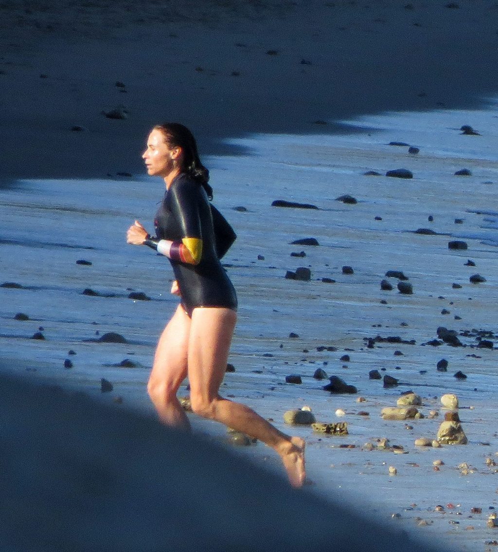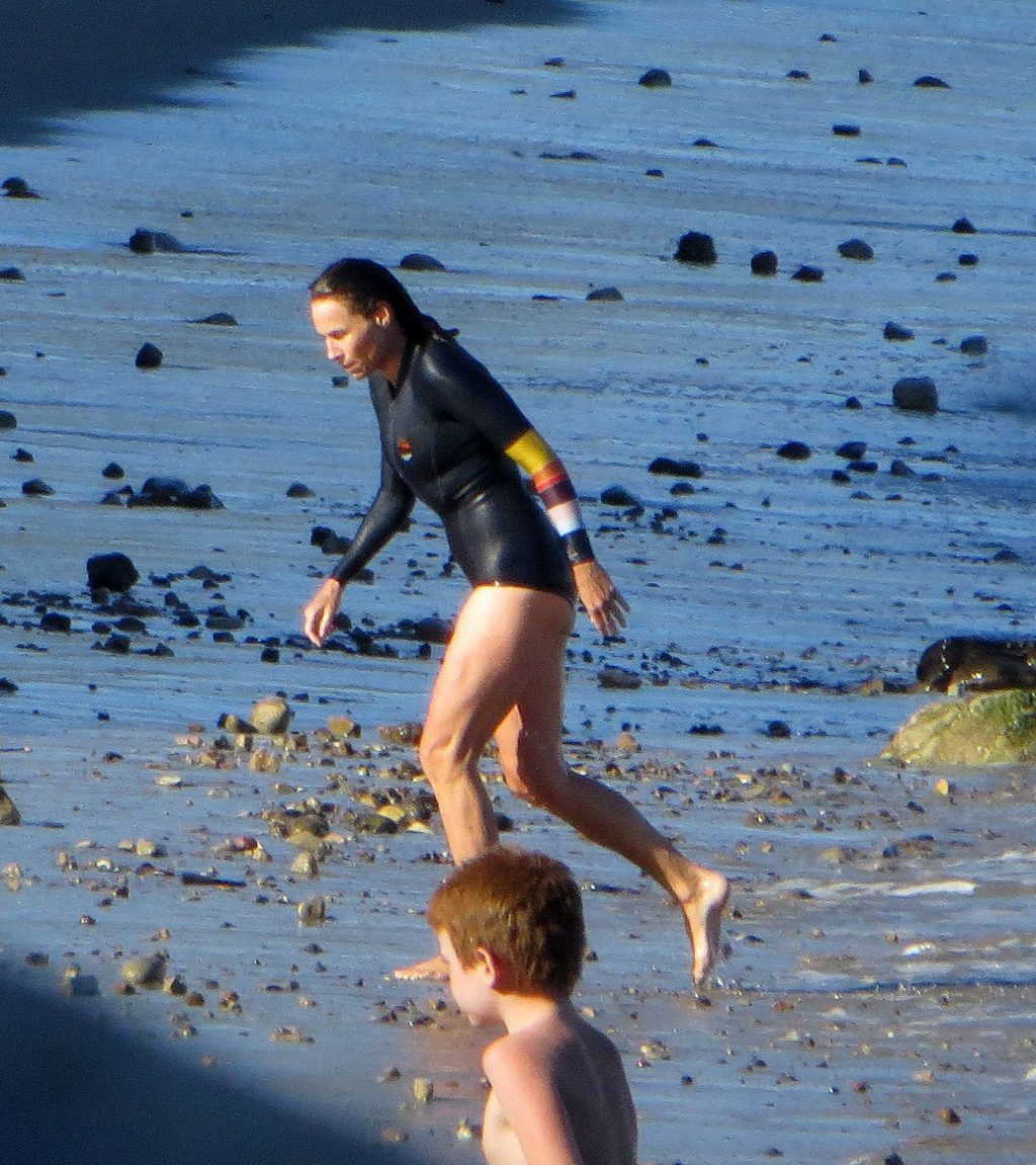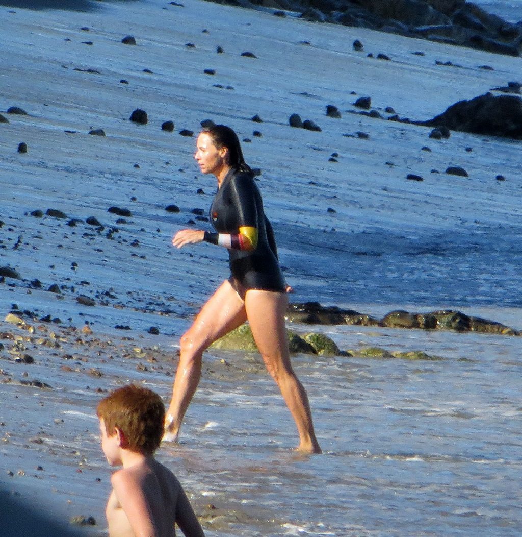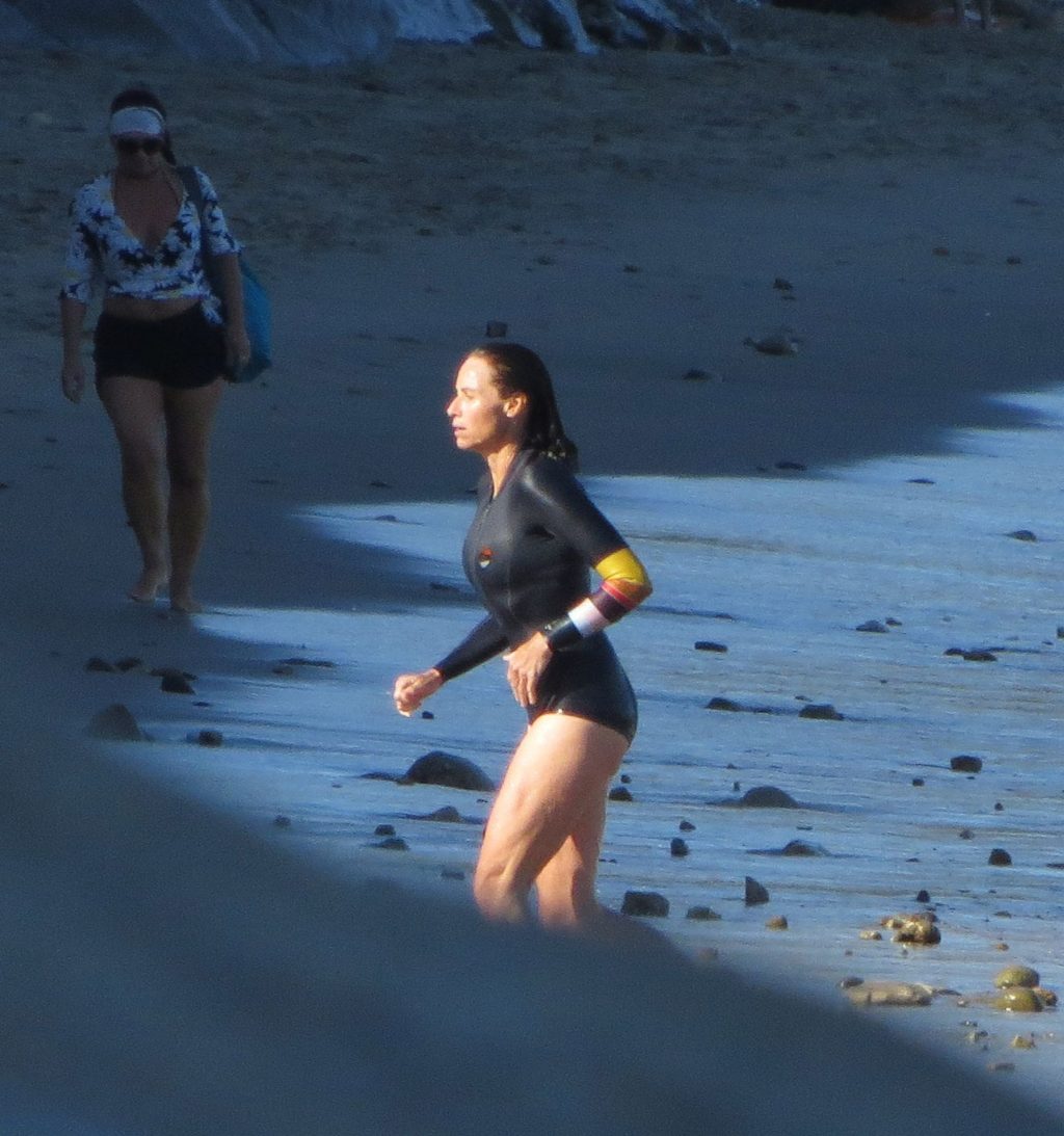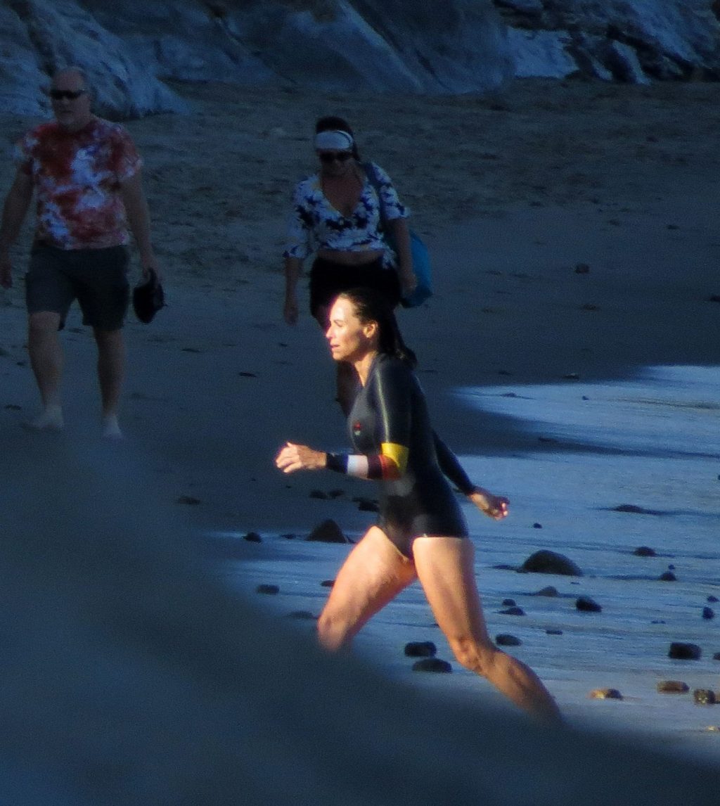 Actrice Minnie Driver (50 ans) est vue en train de nager au milieu de l’océan portant une combinaison de plongée coupée au niveau des jambes à Malibu, Californie, 10/06/2020.